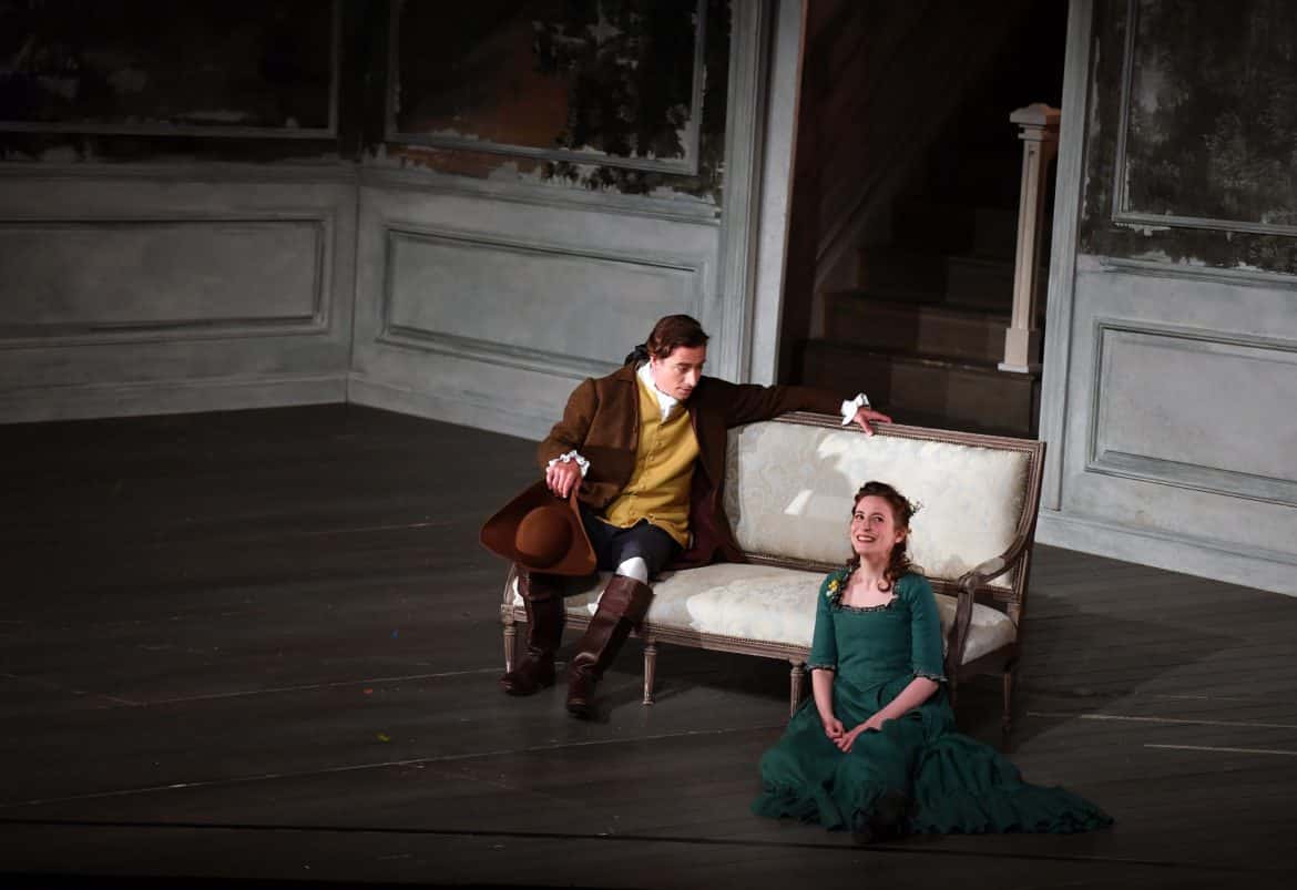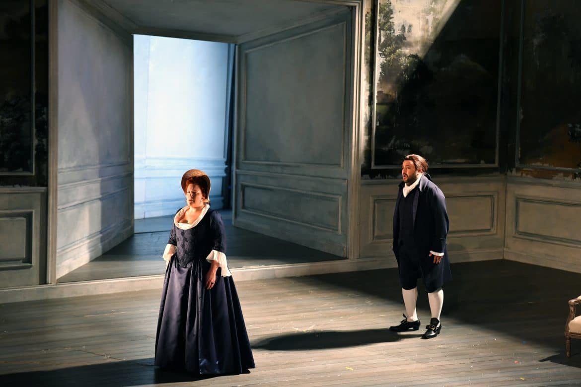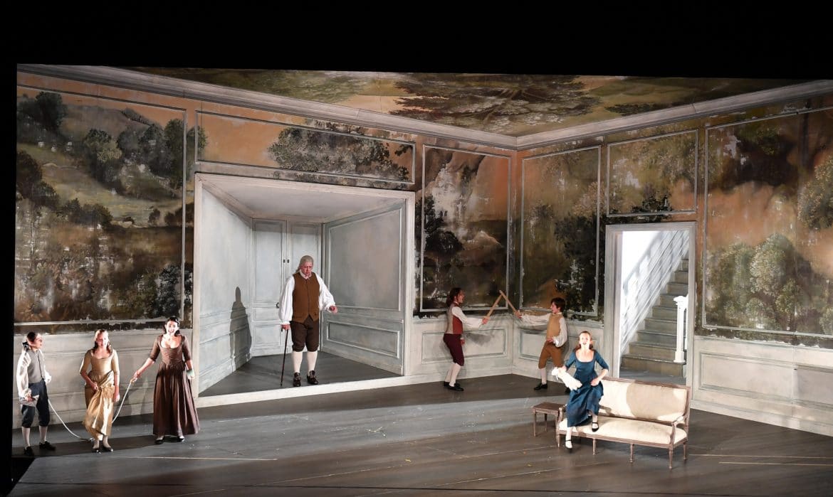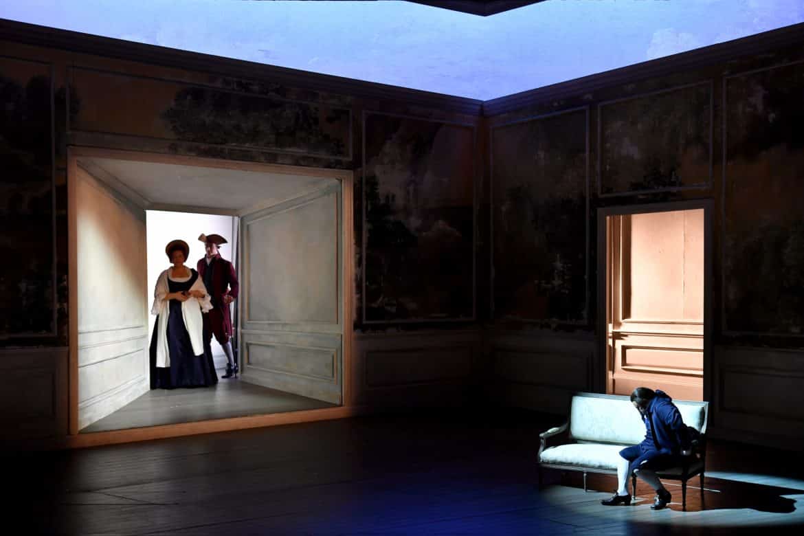 À la manière des scènes de genre de la peinture Biedermeier, l’intimité du cocon familial baigne la scène – celui de la famille du bailli à la veille du bal estival (1er acte), celui de la maison du couple Albert et Charlotte à Wetzlar (3e acte), mais aussi celui d’une nature bucolique peinte sur toutes les parois intérieures (référence aux paysages de Poussin).  Le rideau de scène y introduit déjà le spectateur par un dessin à la sanguine. Car cette nature est celle que le jeune peintre Werther fantasme dès son Invocation, « Je ne sais si je veille » (1er acte).  Dans ce  réalisme pondéré par le décorateur (Leslie Travers),  l’apologie du sentiment, « unique élément qui guide la vie du protagoniste, une vie marquée par l’émotion et l’individualisme » (propos B. Ravella), prend toute sa place, en cela fidèle au projet des créateurs. Et les éclairages gradués des tentures (Linus Fellbom), les costumes chatoyants, le jeu spontané des enfants (1er acte) animent cet univers avec à-propos.