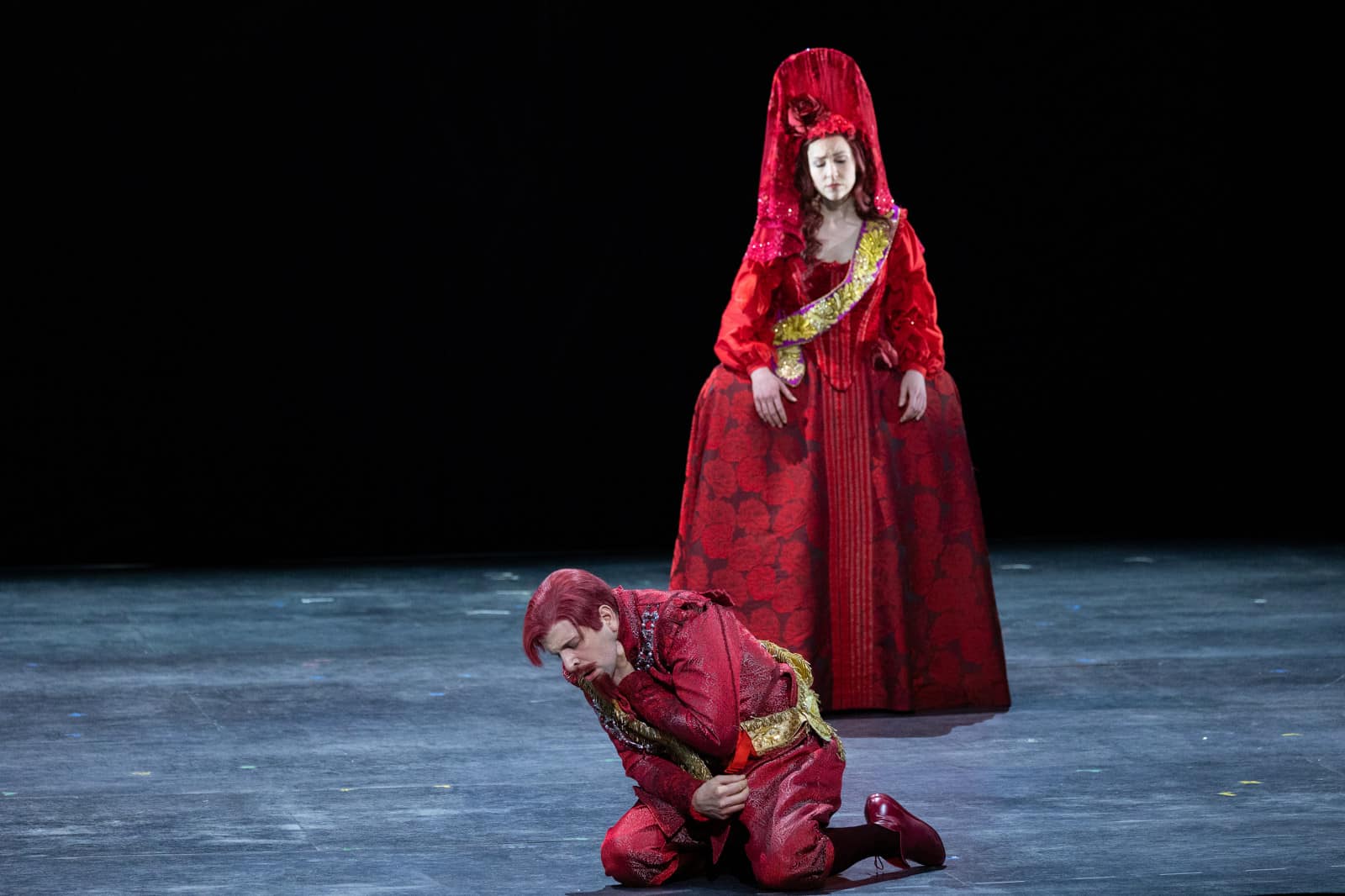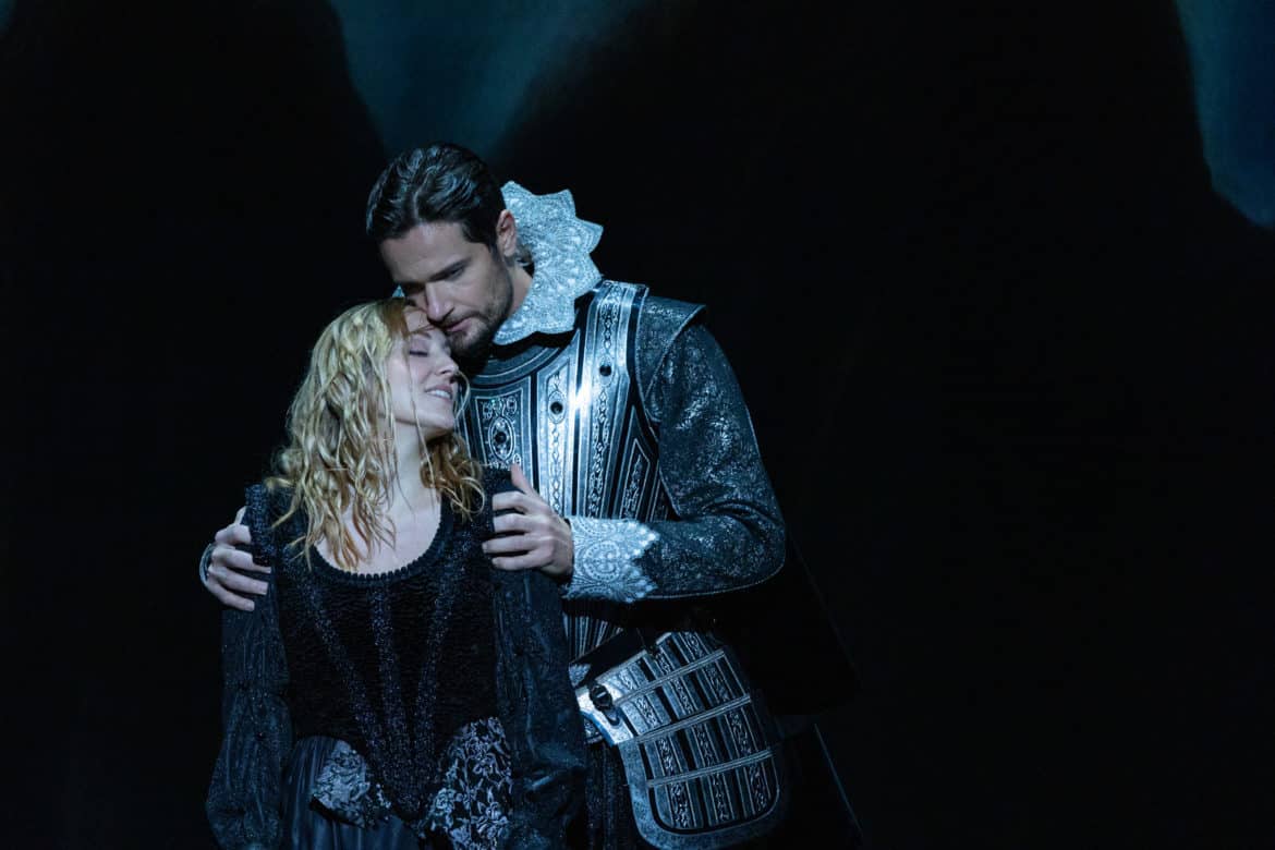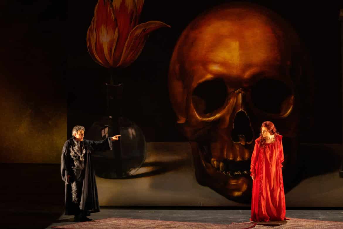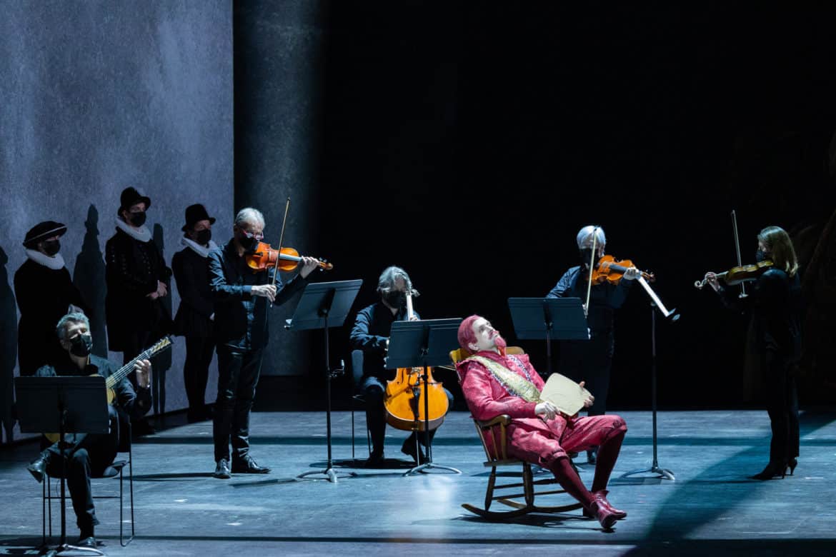 Quant au travail de Stanislay Nordey, qui n’était plus revenu à l’Opéra national de Paris depuis Melancholia de Georg Friedrich Haas, la scénographie de toiles qui se retournent à vue au gré du spectacle, il assume une économie décantée en symbiose avec l’œuvre, et que seule la Quatrième journée pondère avec un supplément d’accessoires sur le plateau. Les cadres du décor de Raoul Fernandez reproduisent, avec quelques anamorphoses dans la copie, non seulement des toiles du seizième siècle, celui de l’argument, mais aussi des allusions plus contemporaines, tel le paysage bleu et vert que l’on croirait signé Giorgia O’Keefe. Les lumières de Philippe Berthomé et les vidéos de Stéphane Pougnand modulent efficacement les atmosphères avec, à l’occasion de belles pénombres et des variations nocturnes qui renvoient habilement au dénuement de la scène. Daniele Guaschino a réalisé des appoints sonores, et Loïc Touzé réglé des mouvements chorégraphiques qui n’empiètent pas sur l’attention au verbe et à la musique. Pour autant cette approche qui dévoile une filiation avec le théâtre de tréteaux voulu par Claudel ne parvient pas à restituer le mélange des genres et des registres de l’original dramatique. Le burlesque et le comique, au-delà du jeu des didascalies, devait peut-être revenir aux numéros prévus pour les entractes – une parade, le Retour de Diego Rodriguez, à l’extérieur ou dans les espaces publics du théâtre, et les Conquistadores chez le tailleur, au buffet –  que les restrictions sanitaires ont contraint à supprimer.