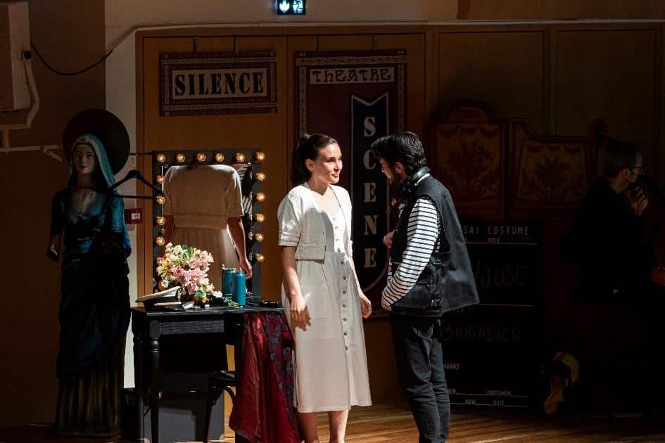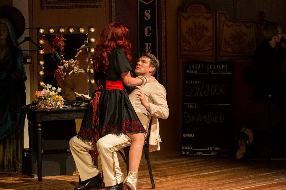 Le spectacle conçu par Romain Gilbert est moins qu’une mise en scène, plus qu’une mise en espace – puisqu’il sollicite costumes et décors et propose des interprétations personnelles de certains événements. Les premières scènes laissent penser que l’œuvre sera appréhendée au prisme du « théâtre dans le théâtre » : on assiste à une « représentation de Carmen », avec José se maquillant, le Remendado, le Dancaïre, Frasquita et Mercedes revêtant leurs costumes, Moralès transformé en régisseur, arpentant le plateau oreillette et micro vissés au crâne… Mais cette idée de départ est plus ou moins abandonnée au profit d’un spectacle resserré sur les tensions entre les personnages et le jeu des acteurs, au demeurant tous (très) bons comédiens. Quelques détails pas forcément utiles (Micaëla rédigeant un « faux » pour faire croire à José que sa mère mourante l’attend ; le meurtre de Micaëla par José) ou pas très heureux (le grand cercueil apporté par Moralès pendant l’air de la Fleur) n’empêchent pas la montée en puissance du drame, culminant dans une scène finale très émouvante. L’ensemble donne cependant une impression d’inabouti, mais comment en vouloir au metteur en scène, qui a dû s’adapter dans l’urgence aux circonstances et aurait sans doute pu proposer une vision plus achevée et plus cohérente avec tout simplement un peu plus de temps…