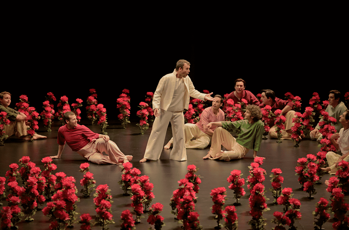 Il est assurément délicat de mettre en scène l’Orfeo. Ici, la direction d’acteurs a indéniablement été travaillée avec rigueur, elle s’avère pourtant souvent inaboutie. Certaines images sont plutôt belles, des idées sont ébauchées (à travers les chorégraphies, les costumes, les accessoires, les éléments de décors évoquant la nature) mais elles ne font que rarement mouche. Le travail de Pauline Bayle est assurément investi, mais le résultat ne touche ni ne convainc vraiment, sans doute parce que l’on a parfois un sentiment de déjà-vu (les parterres de fleurs artificielles que les chanteurs et danseurs posent et enlèvent plusieurs fois par exemple). L’option choisie d’une absence du moindre artifice technique est tout à fait pertinente puisque l’Orfeo fut créé en 1607 d’une part, dans un salon du palais du Duc de Mantoue d’autre part ; pourtant, l’épure ne sert ici pas la magie du mythe d’Orphée.