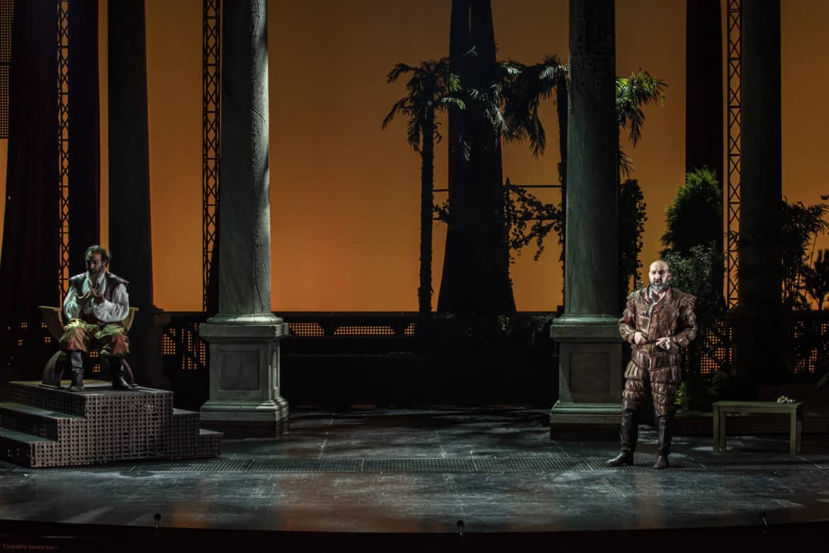 Réalisée par l’assistant de Stefano Mazzonis di Pralafera, Gianni Santucci, la mise en scène, importée de l’institution wallonne, témoigne des arbitrages esthétiques de l’Italien, préférant l’illustration relativement traditionnelle à quelque prétention avant-gardiste en cour dans plus d’une maison européenne. Averti ou néophyte, la compréhension du mélomane n’est jamais parasitée par des élucubrations parfois discutables. Dans la tragédie de la jalousie et de la manipulation du Maure de Venise adaptée de Shakespeare, le décor dessiné par Carlo Sala, fait de toiles, rideaux et colonnades, avec quelques enseignes frappées de l’effigie du Lion de Saint-Marc en fils dorés, résume efficacement l’atmosphère, avec l’appoint des lumières de Franco Marri – reprises par Sylvain Geerts – modulant la chaleur de la fête ou les teintes et les ombres nocturnes du duo d’amour. Conçus par Fernand Ruiz, les costumes ajoutent une belle chamarre à un ensemble porté par une direction d’acteurs d’une fluidité et d’une précision perfectibles, et qui s’autorise quelques ajouts dramaturgiques d’un intérêt finalement modeste, tels le poignard avec lequel Otello tue son épouse – plutôt que de l’étouffer –, l’exercice d’une vengeance fatale exercée par Cassio sur Jago, alors que le texte évoque une fuite de l’intrigant méphistophélique, ou encore les praticables sur lesquels sont déplacés les protagonistes, peut-être comme des pantins de l’échiquier vengeur de Jago.