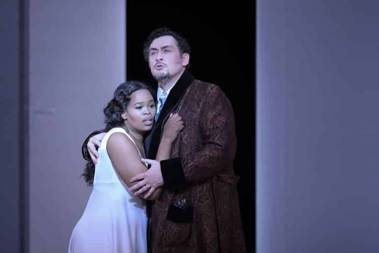 Le plateau vocal, malheureusement, ne permet pas de rattraper les choses… Si Alexander Tsymbalyuk est un Rodolfo noble et sobre, au chant assuré (surtout au second acte), le couple de jeunes premiers reste en-deçà de ce qu’on est en droit d’attendre d’une soirée de bel canto. Francesco Demuro triomphe après son air grâce à un aigu et un suraigu crânement assurés. Elvino, cependant, exige presque constamment une émisson di grazia dont le ténor est dépourvu, sa voix manquant absolument de la morbidezza indispensable au rôle : « Prendi : l’anel ti dono », « Tutto è sciolto », « Io più non reggo » devraient être des moments de pure poésie et de suavité, malheureusement empêchés par des voyelles excessivement ouvertes et une émission mal assurée (surtout dans l’aigu). Le cas de Pretty Yende est tout autre : la beauté du timbre n’est pas en cause, ni la technique (encore que les variations de « Ah, non giunge », au demeurant peu heureuses, ne soient pas parfaitement maîtrisées), ni même le format vocal : le médium et le grave sont consistants, bien plus que chez la plupart des voix « légères » (même si la chanteuse est vraiment inaudible dans le « Non è questa, ingrato core » du premier acte). Mais nous aurons rarement entendu une Amina à ce point inexpressive : que le personnage exprime l’allégresse, le désespoir, l’incrédulité, la couleur de la voix reste constamment la même, sans jamais s’éclairer d’un sourire dans les moments de liesse, ni s’assombrir ou, encore moins, se mouiller de larmes dans le sublime récitatif « Oh ! Se una volta sola… ». Dans ces conditions, le « Ah, non credea mirarti », auquel aucune nuance, aucun changement de couleur, aucun piano, aucun diminuendo, aucun crescendo, aucune messa di voce ne viennent donner vie, laisse complètement de marbre. Un comble pour une des pages les plus bouleversantes du répertoire…