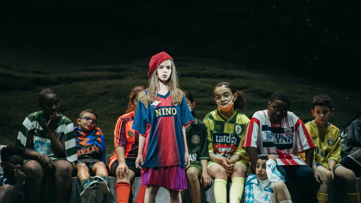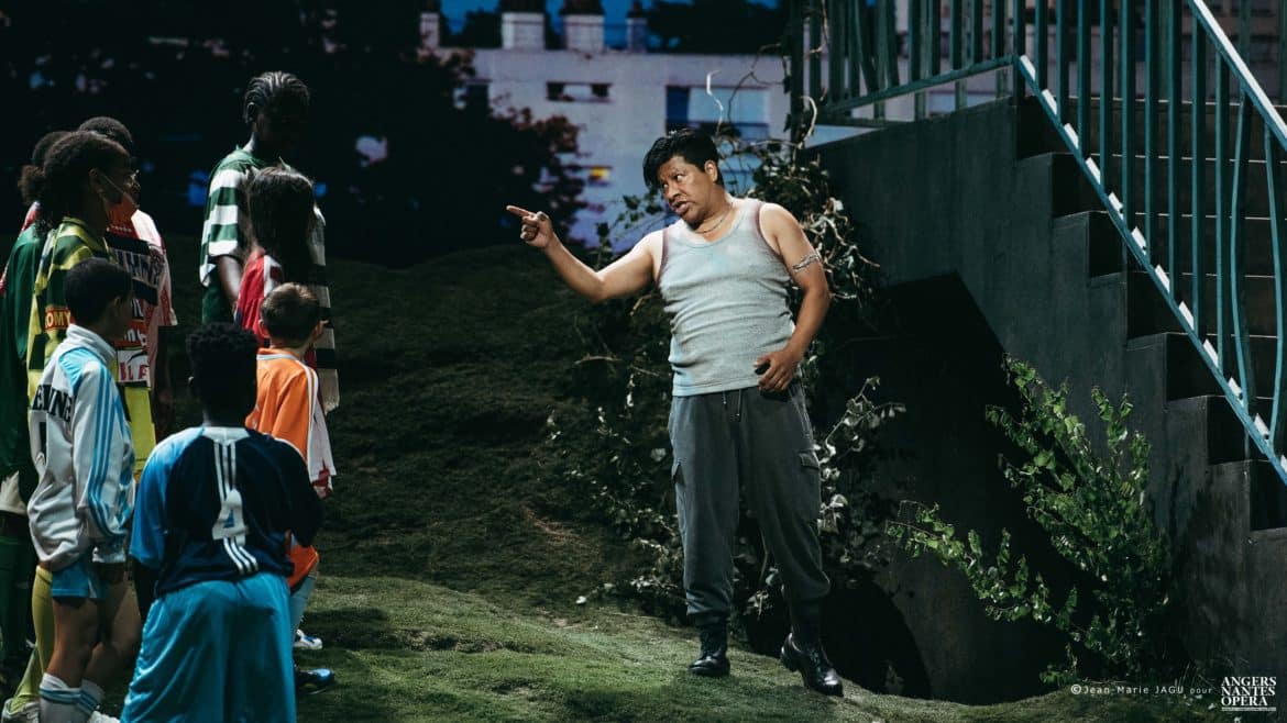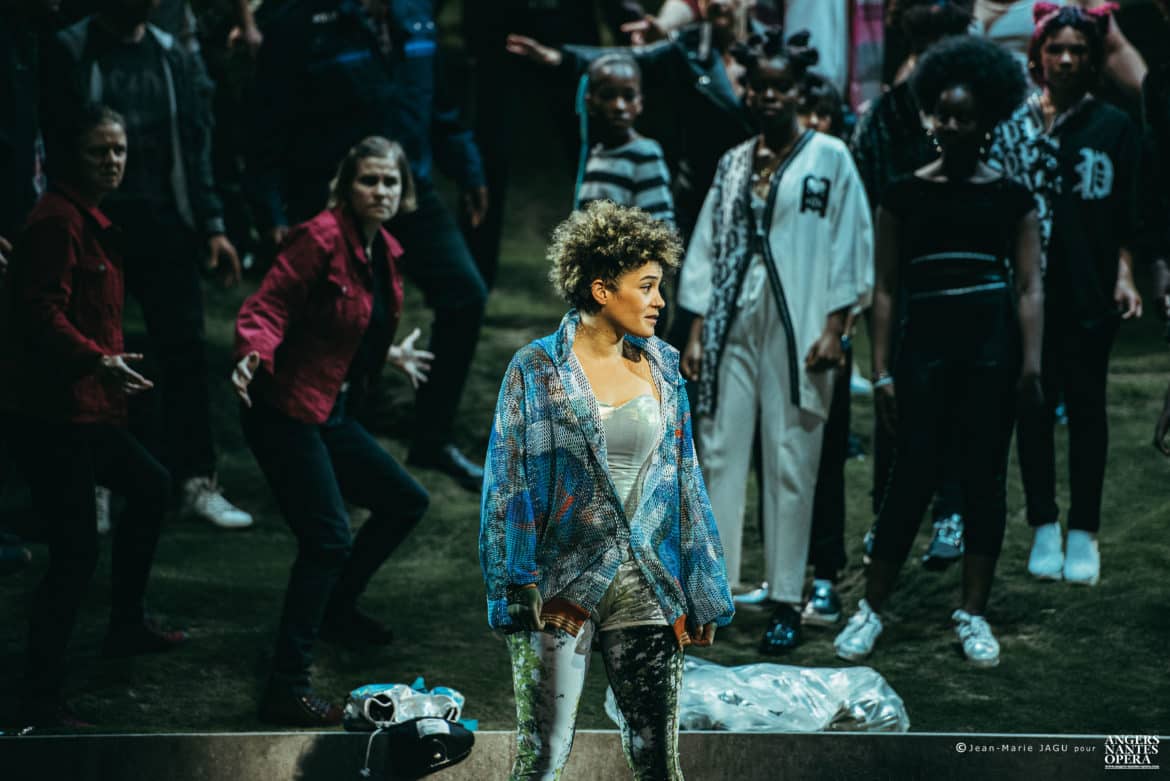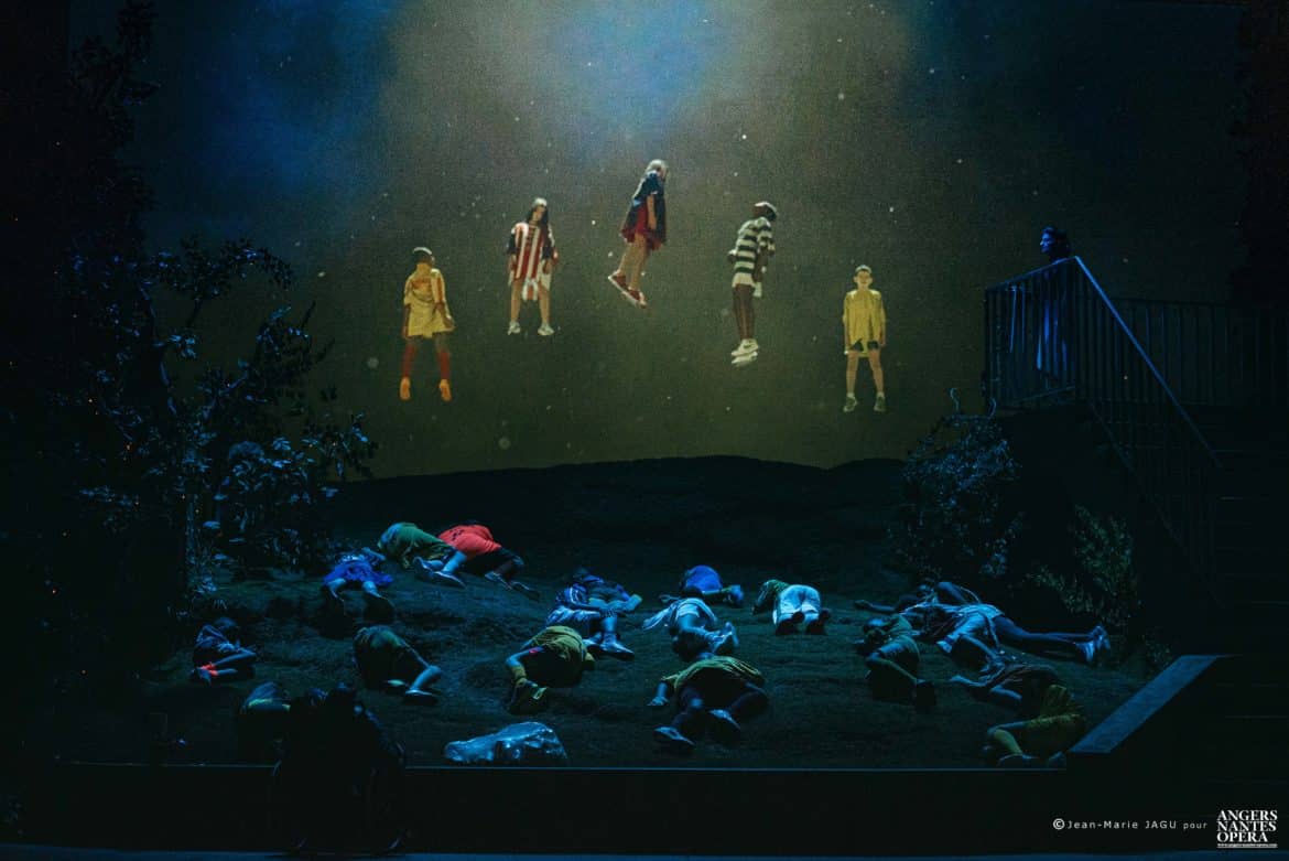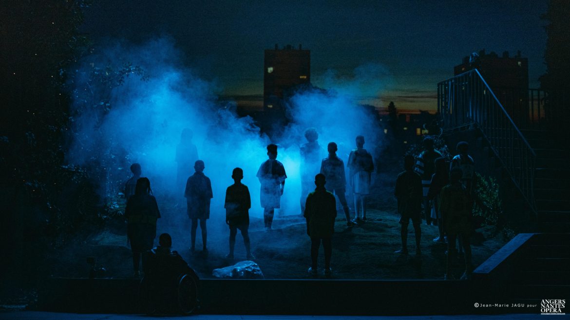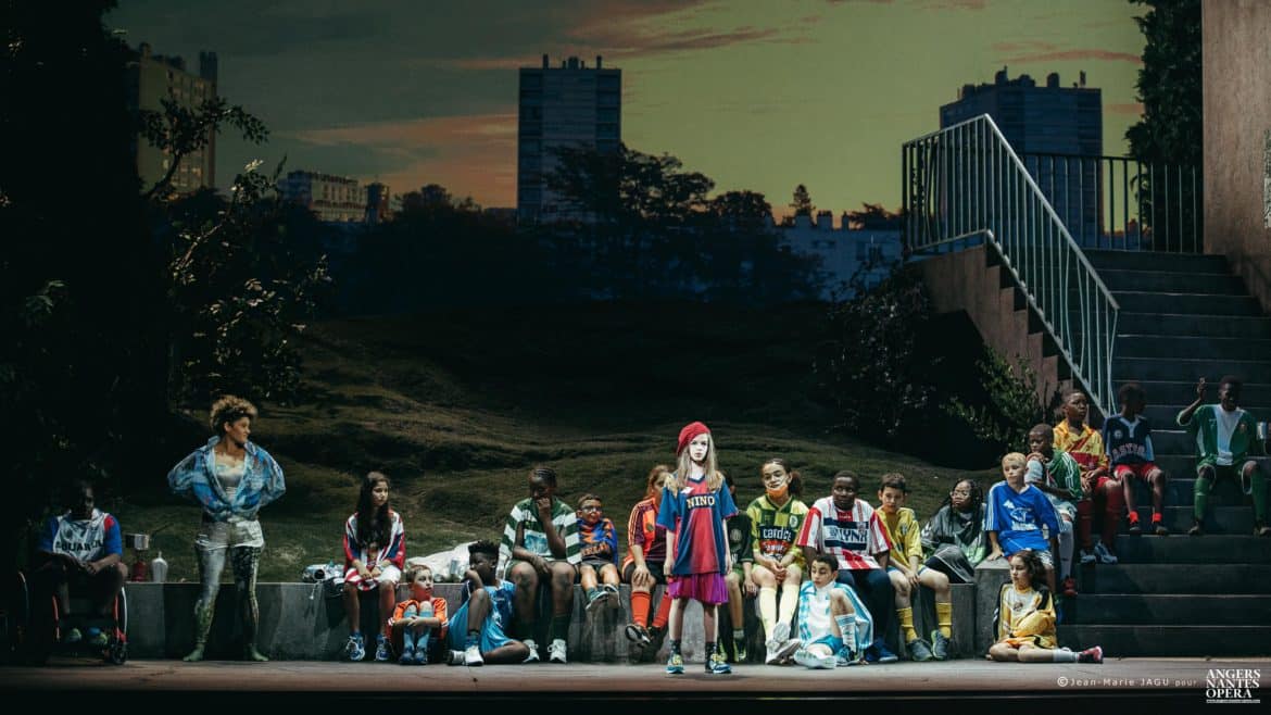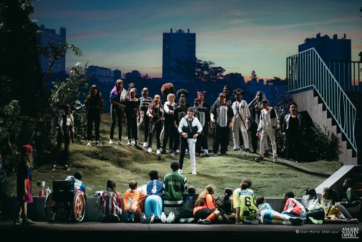 Le projet des Sauvages est né de la volonté de créer un opéra auquel participeraient des jeunes de l’école Dervallières-Chézine et du collège Rosa Parks de Nantes, deux établissements classés en REP+, donc accueillant majoritairement des élèves de quartiers défavorisés socialement et culturellement. Mais ce qui donne à ce projet une dimension inattendue, c’est la décision qui a été prise de le monter sur la scène du Théâtre Graslin, avec la collaboration d’artistes (chanteurs, techniciens, choristes, musiciens, scénographe, metteur en scène,…) professionnels. Le résultat est à la hauteur des efforts déployés et des moyens mis en œuvre pour réaliser ce projet : étonnant ! Dès les premières scènes, nous avons la certitude que nous allons assister non pas à un spectacle d’enfants pour enfants, mais à un véritable opéra, qui a pleinement sa place dans la programmation d’Angers Nantes Opéra, et qui a fait l’objet des mêmes soins que ceux apportés pour n’importe quel autre spectacle : de vrais (et beaux) décors et costumes (signés Guillaume Carreau), une mise en scène soignée, sensible et intelligente (Guillaume Gatteau), de vrais chanteurs, des musiciens talentueux (Frasques Ensemble, dirigé par le chef  Rémi Durupt), mais aussi et avant tout une œuvre de qualité : le livret, signé Guillaume Lavenant, prend appui sur le vécu des enfants et le cadre dans lequel ils vivent (les quartiers Breil et Dervallières de Nantes). La situation initiale, avec ses deux bandes qui s’opposent (celle des plus jeunes, à laquelle appartient la petite Nino, héroïne du conte, celle des adolescents, menée par Pasquale) sous le regard menaçant de la police n’est pas sans rappeler les affrontements entre les Jets et les Sharks de West side story, interrompus par les hommes de l’Officer Krupke… Mais le livret s’affranchit assez vite de cette dimension réaliste pour basculer progressivement dans l’onirisme, l’humour (irrésistible scène du maire – incarné par Nina Kibuanda – au cours duquel l’élu se lance dans un discours à la langue de bois hélas à peine caricaturale), le symbolique, ou encore l’engagement – en évitant toutefois, fort heureusement, tout didactisme trop appuyé.