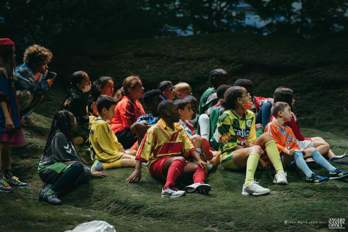 Outre les responsables du spectacle déjà nommés, tous les artistes sont à citer, de Laurène Pierre-Magnani, « sauvage » comportant toute la part d’humour et de mystère nécessaire au rôle, à Marie-Bénédicte Souquet, Leïla émouvante au timbre fruité, Augustin Perez Escalante, Donato à la fois brutal et pitoyable, ou Julien Stella, dont le beatboxing impressionne de virtuosité ! Mais ce sont bien sûr les enfants et adolescents qui étonnent et émeuvent le plus, par leur justesse, leur implication, leurs maladresses, leur naïveté, leur sérieux, leur implication de tous les instants. On n’ose imaginer les heures et les heures de travail qu’a dû nécessiter, pour eux, la réalisation de ce spectacle ! Co-écriture des répliques, dessins des costumes, apprentissage des textes, mémorisation d’une partition loin d’être évidente (le chœur se comporte presque toujours comme un personnage à part entière, il y a donc moins de grands ensembles que de répliques courtes, plus difficiles à mémoriser et à « placer » avec précision dans le déroulé de la musique), mémorisation de la mise en scène… Le travail, de toute évidence, a été immense… et a porté ses fruits au-delà de tout espérance !