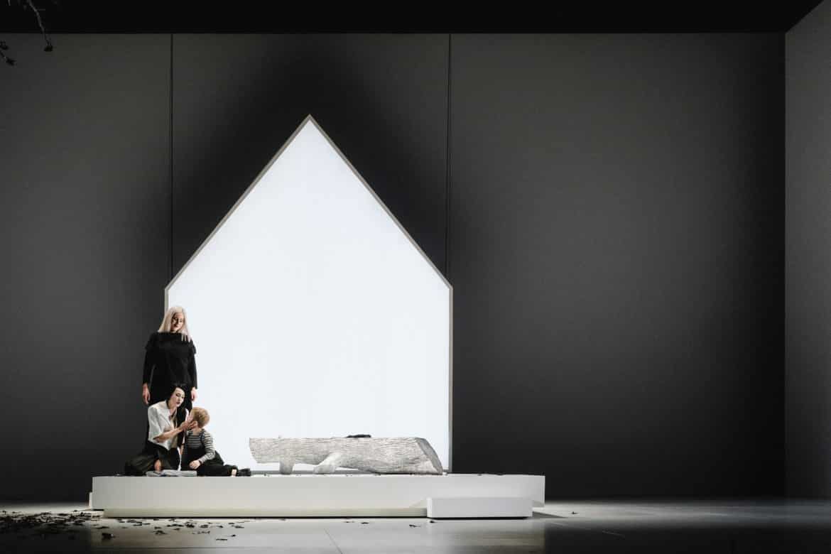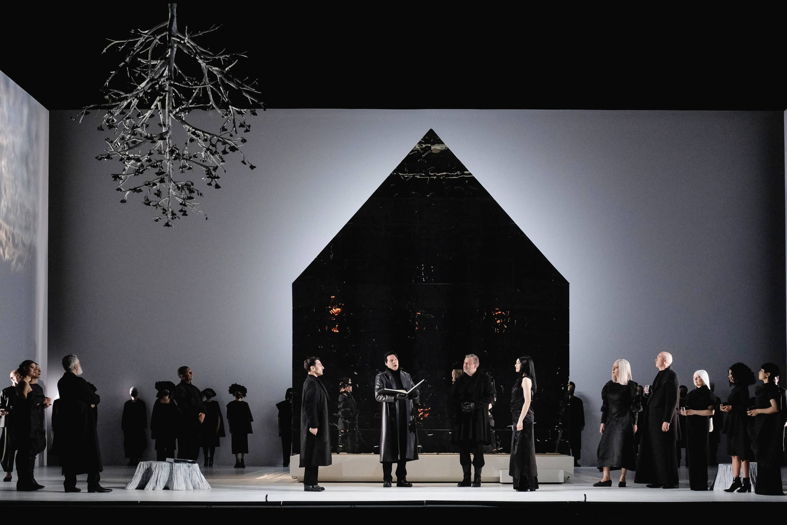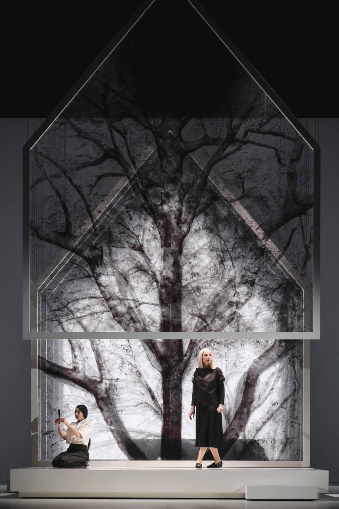 Au-delà de la fatalité amoureuse, somme toute assez banale dans le répertoire lyrique, Mariano Pensotti révèle dans Madame Butterfly le combat d’une femme pour devenir une autre, le déracinement de soi pour une identification fantasmatique, en l’occurrence ici la fascination d’une jeune Japonaise pour l’Occident, miroir inverse de l’attraction des arts européens pour l’extrême-orient à la fin du dix-neuvième siècle – et au-delà. Dessinée par Mariana Tirantte, la scénographie, entièrement en noir et blanc jusque dans le film, affirme une décantation articulée autour de symboliques signifiantes, et modulée par les éclairages épurés d’Alejandro Le Roux. Tout en noir, les noces se déroulent autour d’une maisonnette aveugle en lamellés métalliques. C’est aux dimensions de ce même logis dans lequel Butterfly attend le retour de l’époux que sont insérés les diaporamas de branches aux allures radiographiques, un à un retirés jusqu’à la nudité de l’arbre que Maiko Nakamura voyait depuis la fenêtre de son appartement en France – le procédé évoque ainsi également les séquelles du bombardement de Nagasaki, ville de Cio-Cio-San comme de Maiko. Les cerisiers en fleurs deviennent de noirs confettis tombant d’une frondaison en marge des cintres, sombre présage pour un dernier acte en blanc mortuaire. L’économie du dispositif et des gestes, qui réinterprètent avec souplesse des éléments rituels, participe de la saisissante évidence herméneutique d’une des plus belles et des plus intelligentes lectures de Madame Butterfly de ces récentes années – au moins –, et qui répond aux réflexions contemporaines sur la place de la femme dans la société, sans trahir, par un militantisme anecdotique, la portée universelle et intemporelle de la narration.
