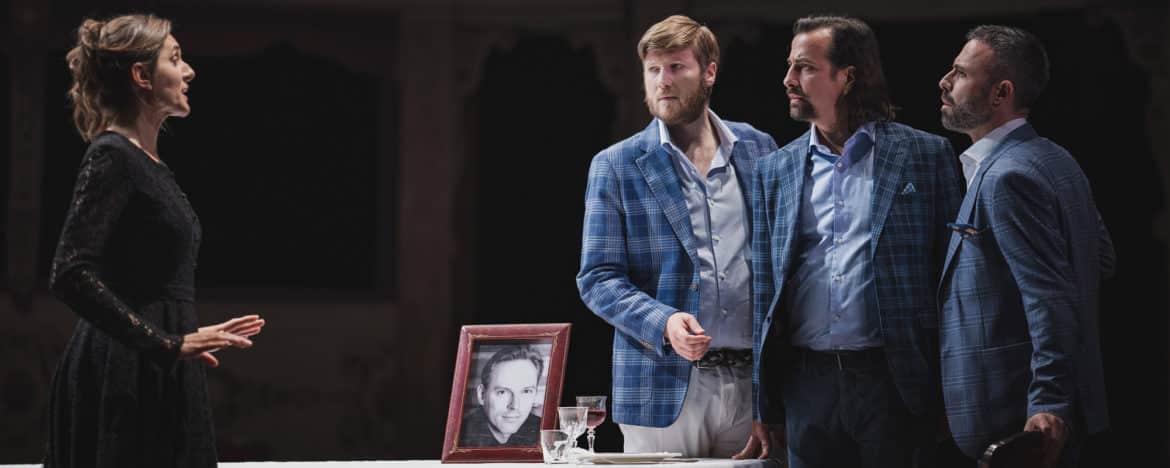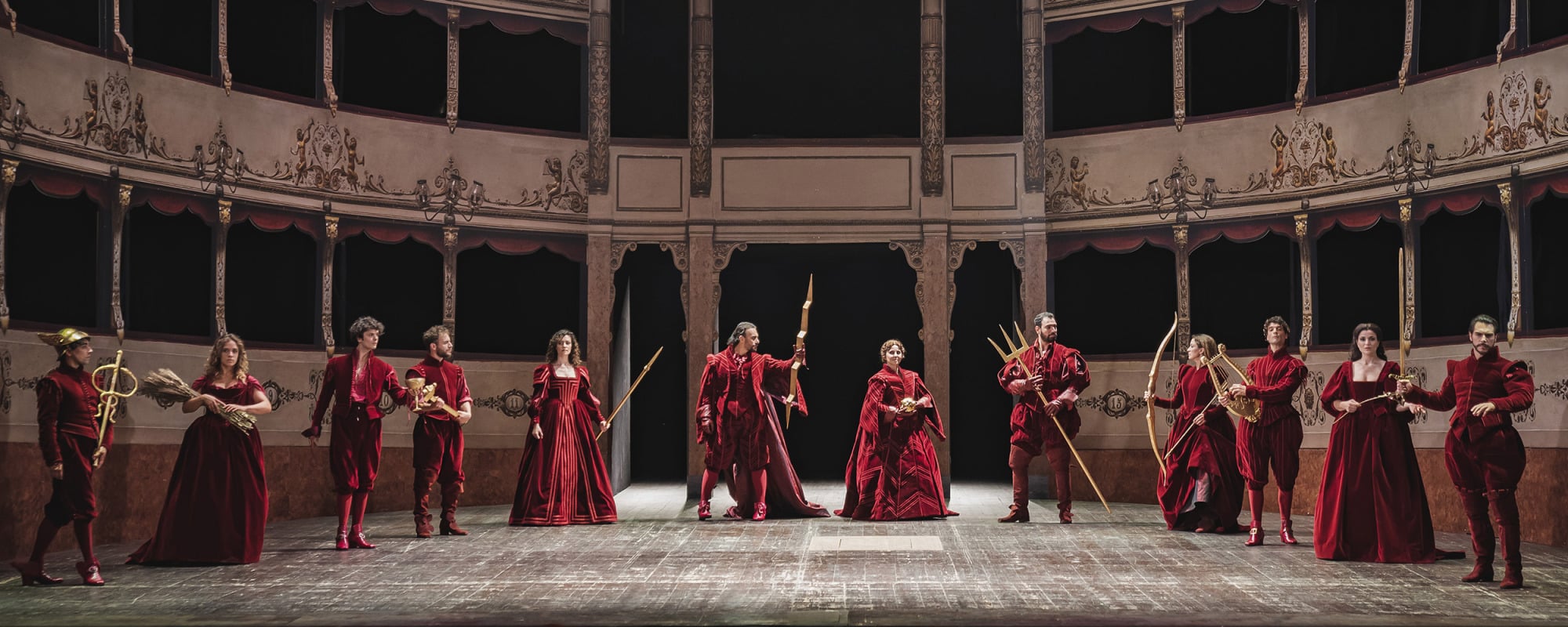 La réalisation visuelle du spectacle est confié à l’un des plus grands metteurs en scène contemporains, Robert Carsen, qui, avec les décors de Radu Boruzescu, les lumières de Peter van Praet et les costumes de Luis Carvalho, réalise un spectacle aussi abouti que ceux auxquels le metteur en scène canadien nous a habitués. L’élément principal de sa lecture est le conflit entre les dieux et les humains, lequel se traduit déjà dans les vêtements : les premiers portent de somptueux costumes d’époque qui semblent avoir été réalisés avec le velours rouge et l’or du rideau du théâtre ; les seconds portent des vêtements contemporains – un uniforme militaire pour Ulysse, des tenues sobres et sombres pour Pénélope. Dans le prologue, la Fragilité humaine est répartie entre trois chanteurs qui surgissent des loges, raillés par les trois dieux devant le rideau. Les autres dieux de l’Olympe entreront ensuite par le fond des gradins et, passant entre les fauteuils espacés, monteront dans les loges situées au fond de la scène, recréant fidèlement, en miroir, la salle du théâtre. Tout en trinquant et en se divertissant, ils assisteront aux événements humains, auxquels ils finiront par se mêler avant de quitter les loges, après le massacre des Prétendants. Mais leur intervention n’est désormais plus nécessaire : pour assister à la rencontre si humaine et touchante d’Ulysse et de sa fiancée Pénélope, la seule présence du « vrai public », ému et reconnaissant, suffit.