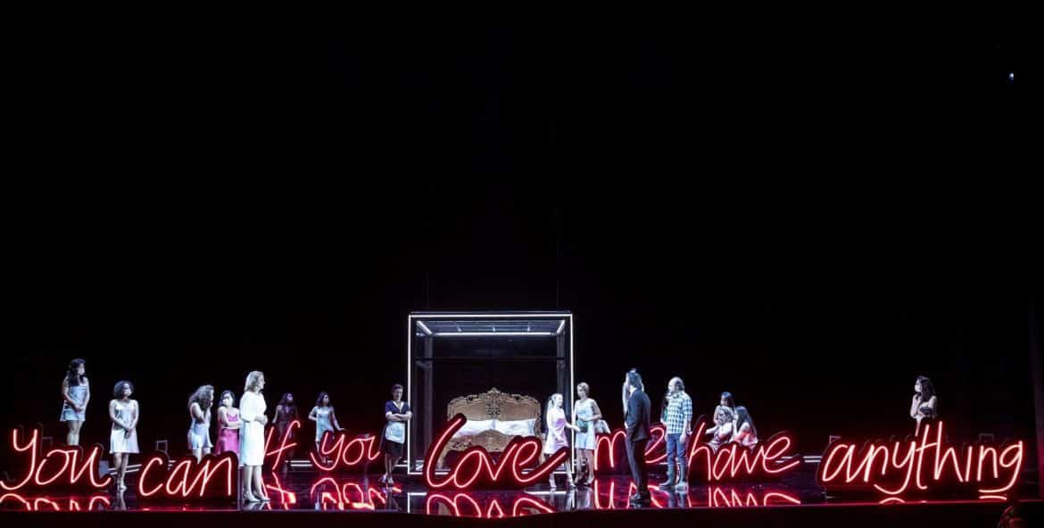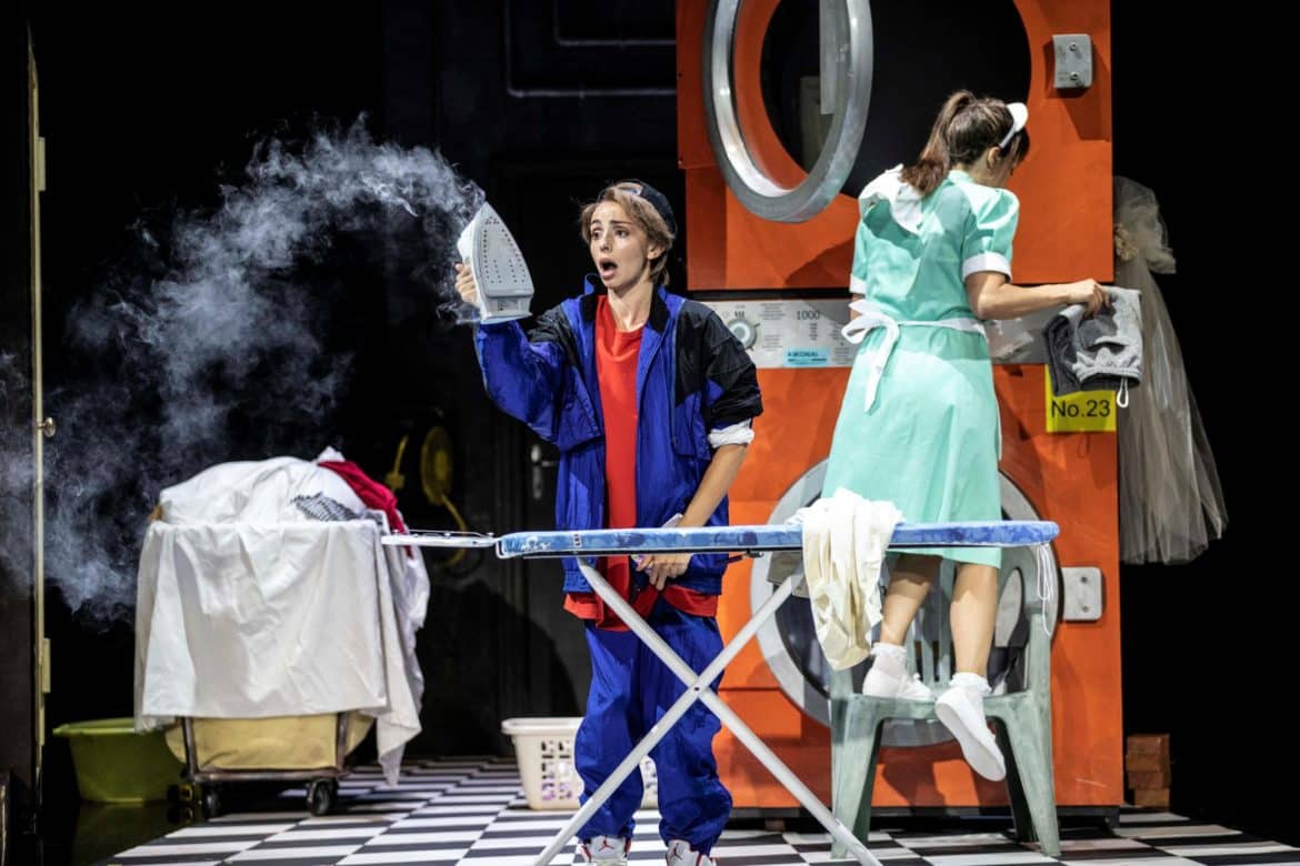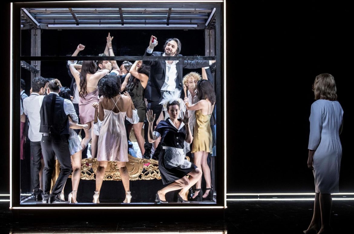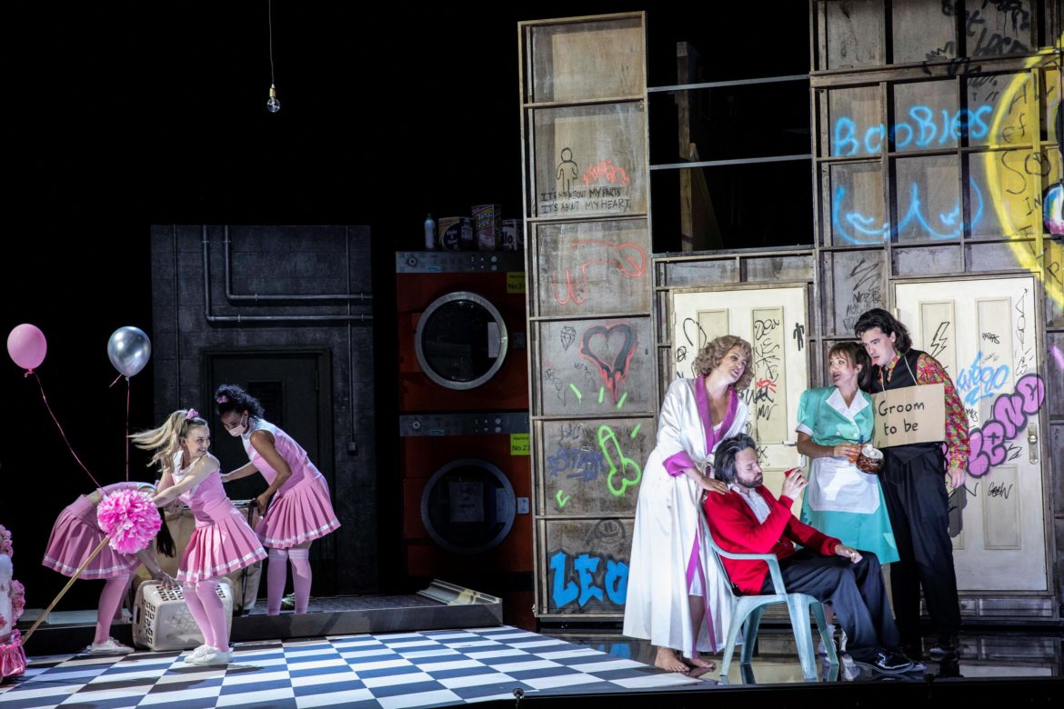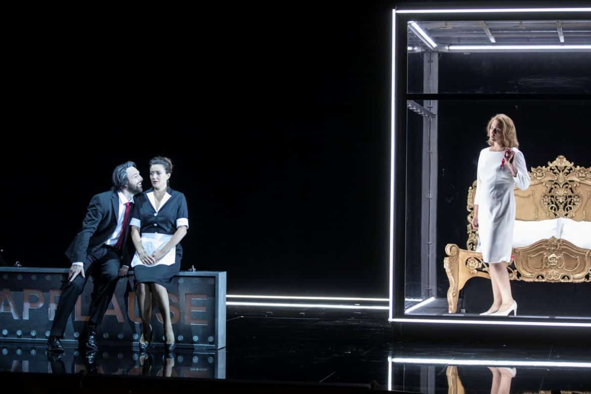 Cette nouvelle production du Festival est une réussite absolue ! Tout est parfait de bout en bout. La mise en scène endiablée de Lotte de Beer nous entraîne au cœur des années 80 dans une féérie de couleurs et de clins d’œil que n’aurait pas reniée Mozart, lui-même connu pour son tempérament farceur et espiègle. On oscille entre comédie burlesque et tragédie cornélienne. Le public rit à gorge déployée aux effets comiques et caricaturaux mais toujours sans vulgarité. Les trouvailles des décorateurs qui juxtaposent les décors à la manière d’une sitcom américaine, laissant voir la Comtesse faisant sa gymnastique matinale dans sa chambre dès le premier acte tandis que le Comte et Figaro se disputent les faveurs de Susanna dans le salon et que celle-ci s’adonne à ses tâches de femme de chambre dans la buanderie. Des panneaux lumineux indiquant « Applause » et « Laughter » accentuent la complicité avec le public.