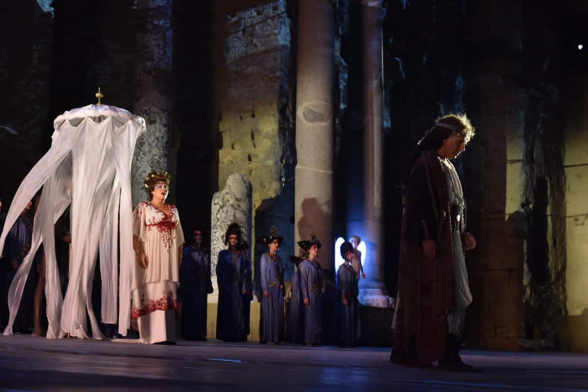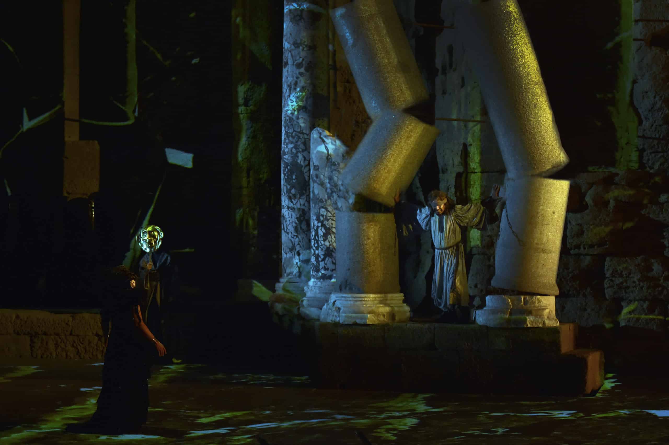 Les jeux de lumières sur le mur de scène du théâtre antique sont féériques et plongent le spectateur dans un univers qui souligne la puissance divine à l’œuvre face à la vanité des hommes.