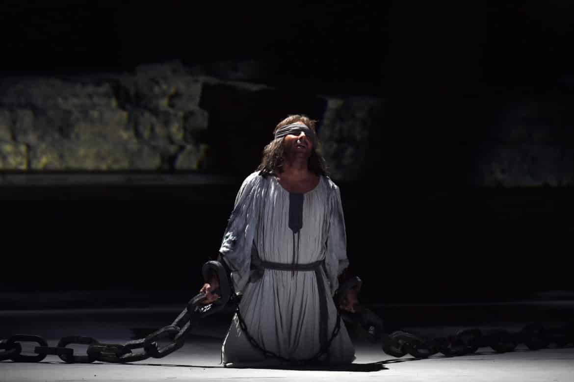 Mettre en scène Samson et Dalila est un véritable défi car l’ouvrage est assez statique et présente peu d’action. C’est sans doute la raison pour laquelle il est souvent donné en version de concert. Cependant, Jean-Louis Grinda nous offre un spectacle grandiose aux effets de masse impressionnants, alternant avec l’intimité des scènes entre Samson et Dalila, ou encore la symbolique de l’étoile de David matérialisée par des sangles qui enlacent Samson. La solitude de Samson prisonnier est accentuée par le gigantisme des chaînes qui l’entravent descendant du haut des colonnes du théâtre. La projection finale montrant le temple qui s’effondre sur les Philistins marque la victoire de Dieu sur les païens et la rédemption de Samson.