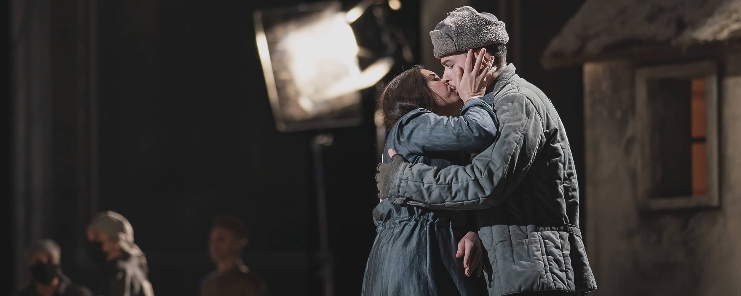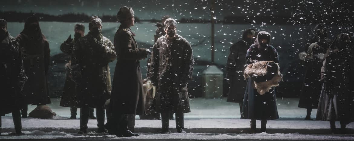 Visuellement, la production de Roberto Andò commence bien : le tableau réaliste imaginé par Gianni Carluccio que l’on découvre au lever du rideau se transforme en un studio de cinéma où l’on tourne des films réalistes socialistes de l’époque stalinienne : un faux caméraman et un faux opérateur de micro interviennent par moments et parfois les acteurs changent de costume ou attendent leur texte sur les côtés de la scène. Sur deux écrans sont projetées des images des acteurs jouant leur rôle, ou des extraits de films d’actualités d’époque – y compris le visage de Staline, apparaissant aux mots « Christ est ressuscité » dans la scène de Pâques du troisième acte. Mais l’idée n’a pas de réelle nécessité et l’absence de direction d’acteur transforme la représentation en un spectacle traditionnel avec les chanteurs à l’avant-scène faisant face au public et se livrant à une gestuelle convenue (la mise en scène est assurée par Roberto Andò). Il aurait probablement fallu un réalisateur comme Livermore pour exploiter cette lecture cinématographique avec plus de conviction. Dommage, le renouveau de la Sibérie n’aura donc été qu’un demi-succès…