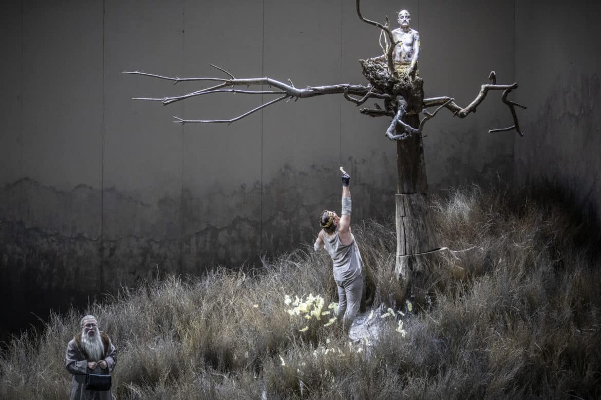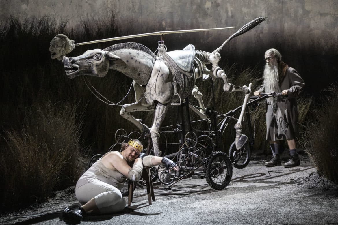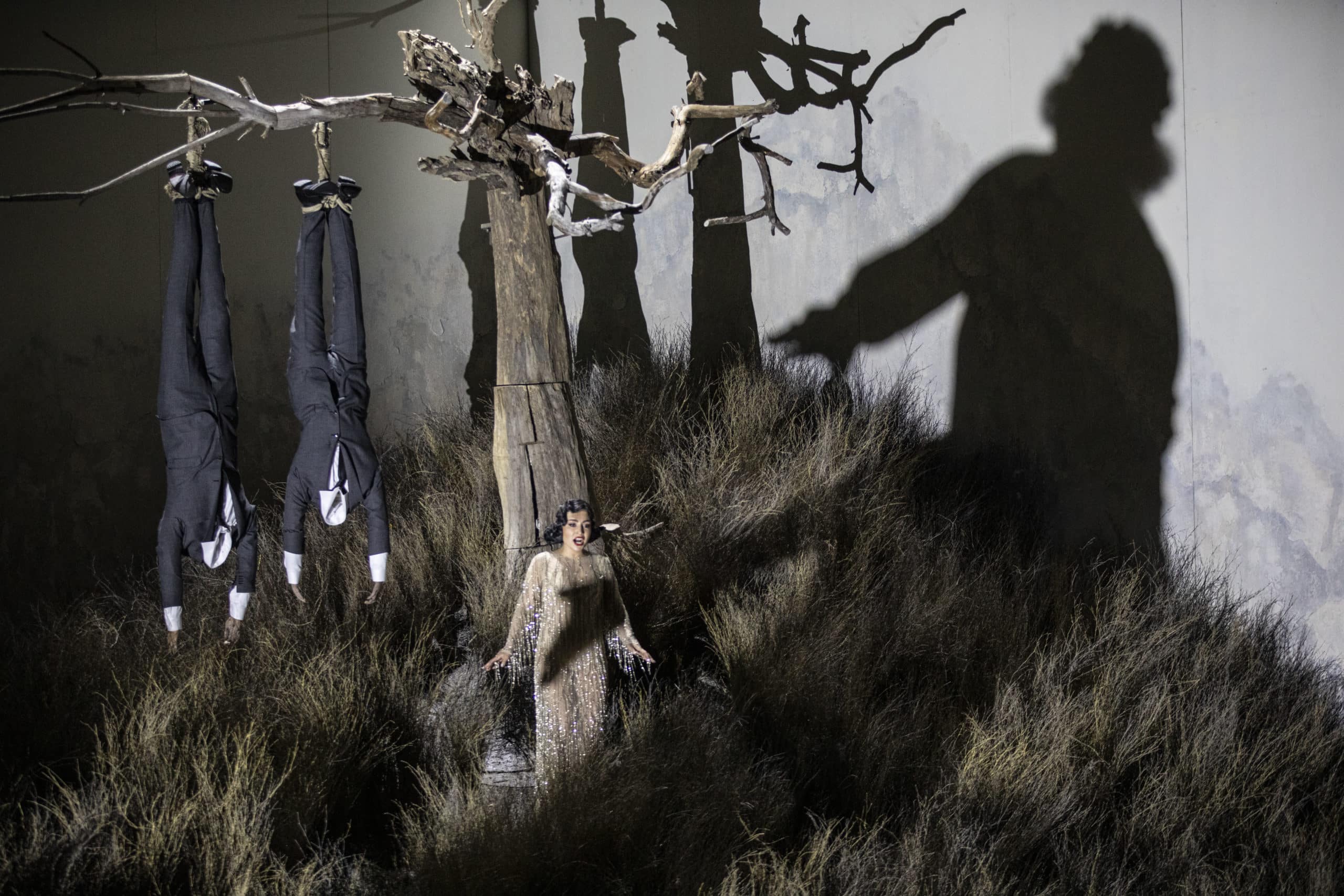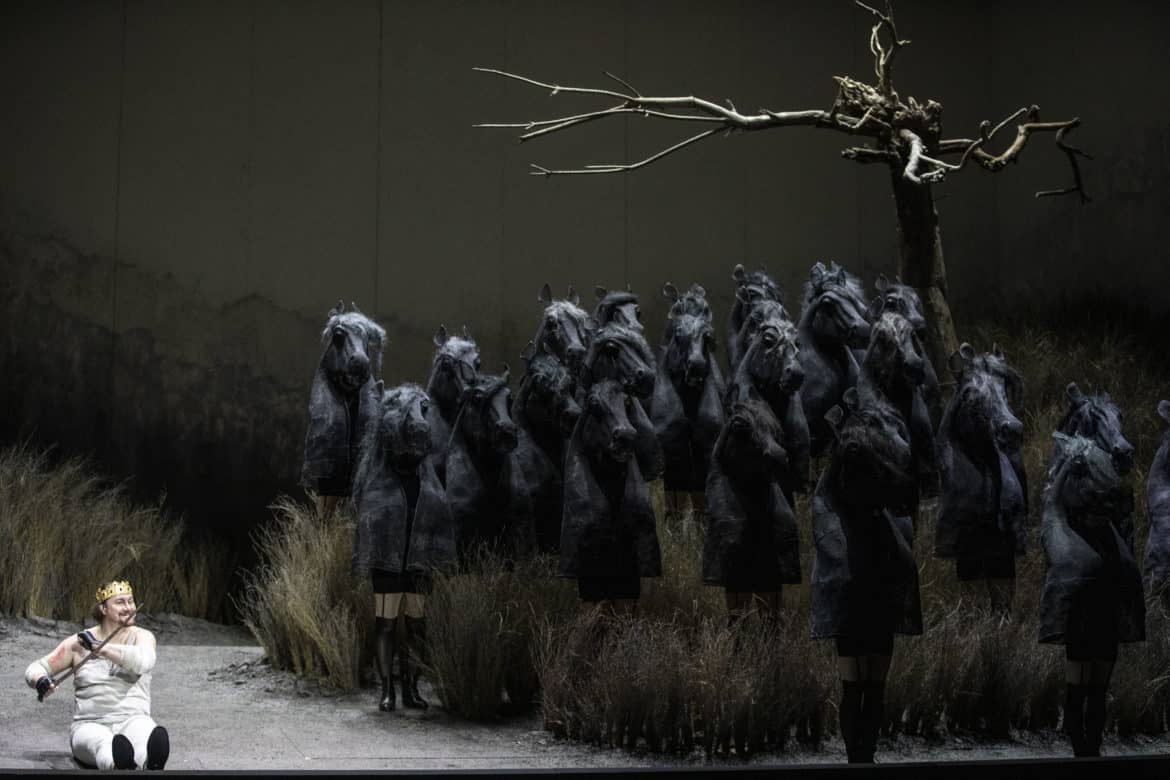 Des nombreuses images qui restent gravées en mémoire longtemps après la fin de la représentation, on retiendra particulièrement, dans une production empreinte d’un superbe sens poétique, celles du coq – incarné par l’acteur Wilfried Gonon – allongé sur une branche avec laquelle il se confond, du cortège nuptial bigarré du dernier acte, du balancement lancinant des corps des deux Tsarévitchs, pendus par les pieds à une branche et dont les têtes gisent aux pieds du Tsar Dodon. L’obsession de la décollation se retrouve d’ailleurs dans la scène finale où l’Astrologue, si énigmatique, épiloguera, queue de pie et tête en main, sur le « sens » – ou pas – de ce conte symboliste. Jouant sur ce côté halluciné qui sied parfaitement à la musique de Rimski, la production utilise toute la gamme des « étrangetés », parmi lesquelles on notera de désopilants choristes à tête de cheval figurant la noblesse, et le canasson squelettique et immobile de Dodon aux jambes tournant dans l’air ! En filigrane, l’ensemble de la scénographie nous invite à revoir l’œuvre picturale d’Alfred Kubin (1877-1959) à la source de laquelle elle puise plus d’une fois…