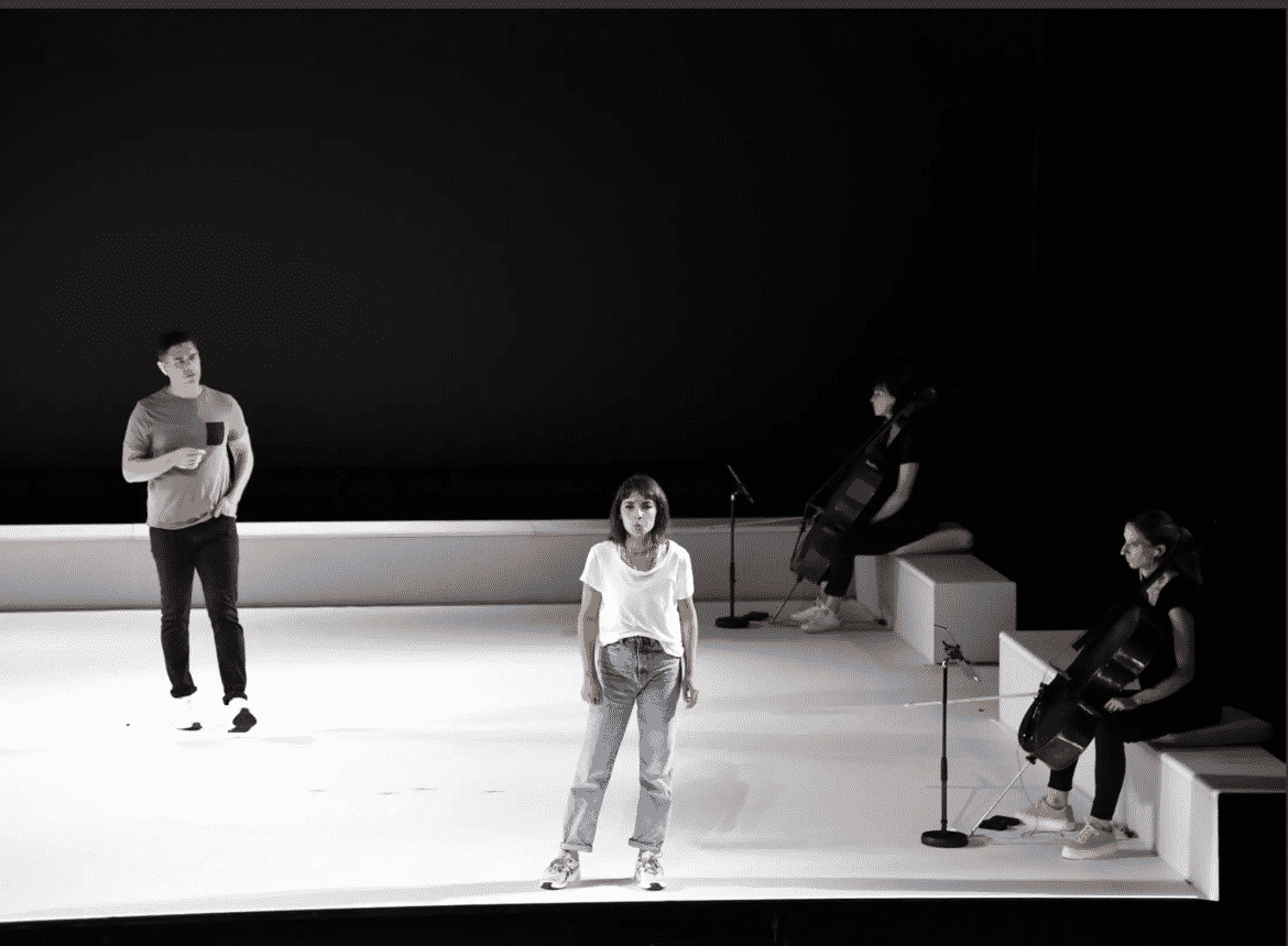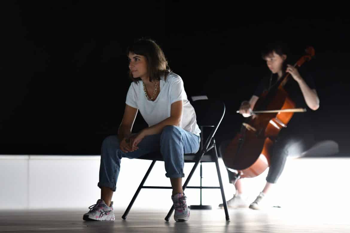Dessinée par Andrew Lieberman, la scénographie minimaliste, réduite à une chaise et une rampe lumineuse aux coins de laquelle se répartissent les quatre violoncellistes – remarquables pupitres de l’Orchestre national Montpellier Occitanie, parmi lesquels le solo supersoliste Cyrille Tricoire – contribue à la concentration de ce théâtre de jeu de rôles, où les deux solistes incarnent à deux têtes les interventions des personnages, dans une modulation codifiée des registres qui permet de caractériser et d’identifier chacun – la journaliste est chantée par la soprano tandis que le baryton parle, répartition inversée pour l’ami ; la voisine est chantée en russe par la soprano et paraphrasée en langue vernaculaire par le baryton, équilibre renversé pour l’ado ; le professeur est chanté à l’unisson rythmique par les deux solistes, tandis que la partie de l’ambulancier est une alternance de chant sans paroles et de texte parlé.