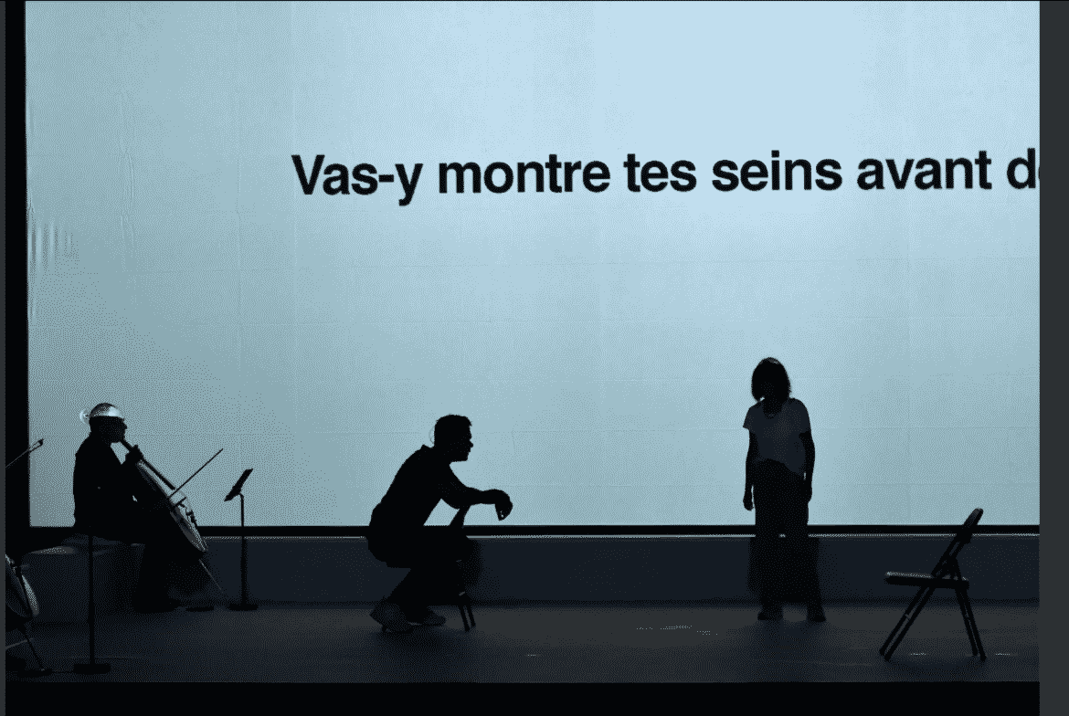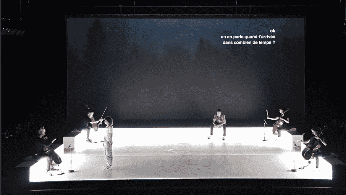 Juxtaposant les sources, le livret, conçu avec l’appui dramaturgique de Ksenia Ravvina, prend l’allure d’une mosaïque dramaturgique de 134 numéros – d’une durée de cinq secondes à deux minutes selon les séquences – à deux voix et six personnages esquissant une reconstitution, sans prétendre à quelque impossible certitude. Des vignettes Whatsapp – que l’on déduit être la retranscription d’échanges entre l’écrivain et le compositeur – jalonnent le récit, comme un contrepoint-laboratoire où l’œuvre est en train de s’écrire. Quelques copies de messages Periscope s’intercalent ça et là, mais, dans le refus de la curiosité obscène voulu par l’équipe créatrice et dont on suit les scrupules au fil des interactions sur Whatsapp, le vidéaste Pierre Martin ne diffuse aucune des images enregistrées par les protagonistes. Seul un lent et long travelling de la gare de Strugi Krasnye, accompagnant le lamento après la déflagration tragique, vient se projeter sur l’écran en fond de scène. Imaginée en évidente symbiose avec le texte, la partition, confiée à un quatuor de violoncelles, sait s’approprier les ressources du silence et du kaléidoscope de miniatures cellulaires qui s’enchaînent, pour moduler un crescendo, en intensité comme en tempi, jusqu’au climax, avant un reflux étale aux allures d’épilogue.
