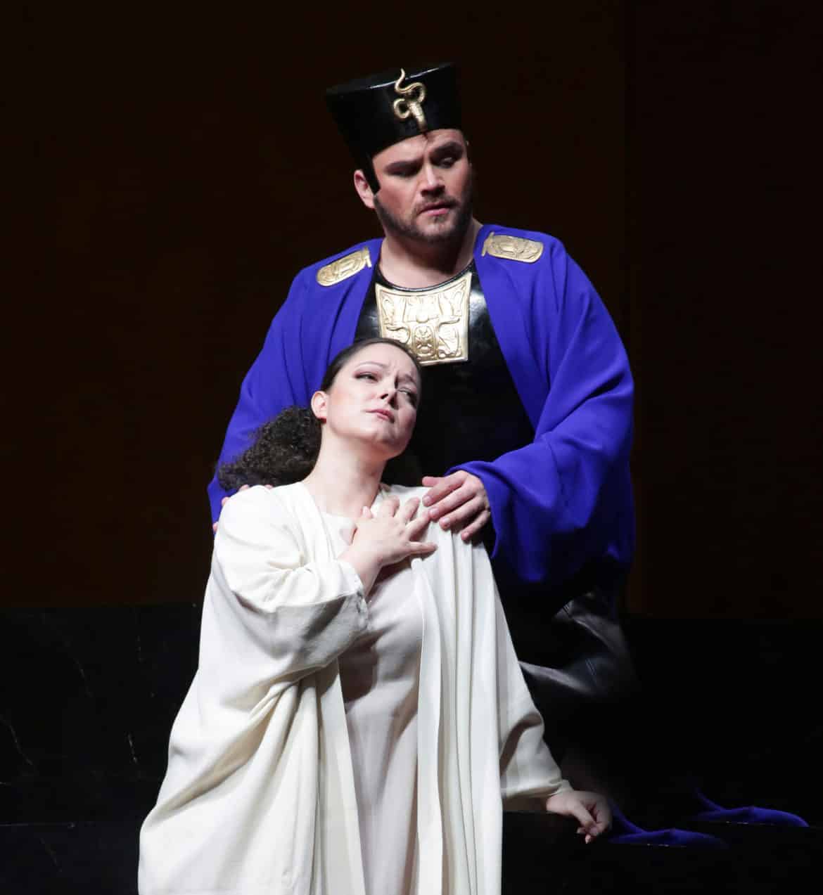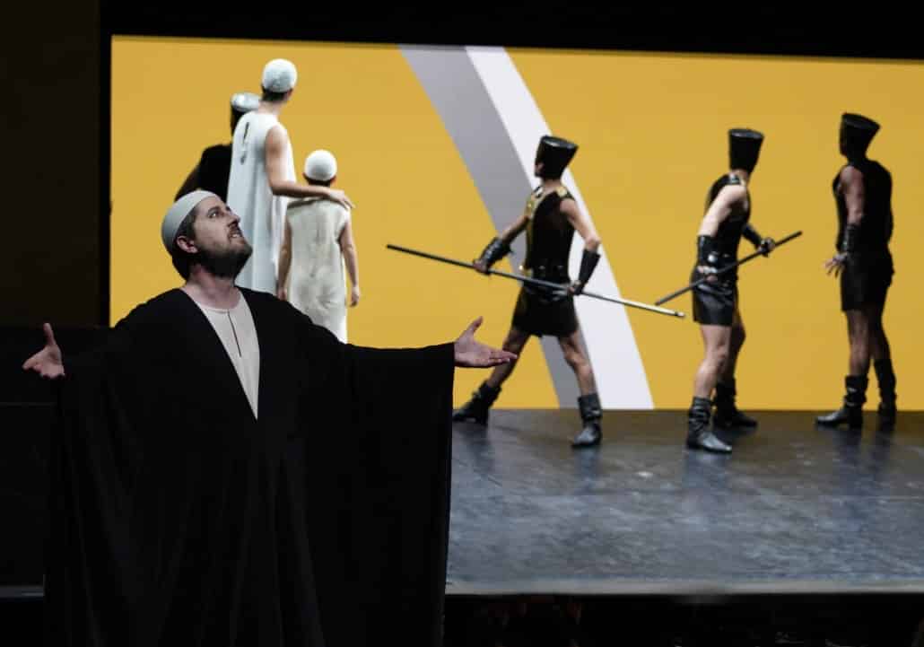 Vocalement, le bilan est assez contrasté. Si Monica Bacelli, malgré une émission vocale un peu instable, est une Marie touchante, Alexey Tatarintsev, certes impressionnant par la facilité de ses moyens, n’a pas toujours la retenue et la pureté de style requises. Andrew Owens n’est sans doute pas tout à fait à sa place en Aménophis : les aigus, suraigus et vocalises sont bien là (notamment dans son duo avec Pharaon), mais dans un rôle qui exige tout autant une maîtrise de l’émission di grazia qu’une arrogance dans l’accent pour les scènes de colère, il faudrait une plus grande puissance vocale – et aussi une endurance supérieure, le ténor arrivant un peu fatigué au 4e acte. Même s’il a déjà chanté le rôle (notamment sous la direction de Muti), nous ne sommes pas sûr que Pharaon soit l’un des meilleurs rôles d’Erwin Schrott. Ses premières interventions sont vraiment incompréhensibles (les choses s’arrangent un peu sur ce point par la suite), mais surtout la ligne de chant belcantiste exige une souplesse vocale et une homogénéité dans l’émission qui n’ont jamais été le fort du baryton-basse uruguayen…