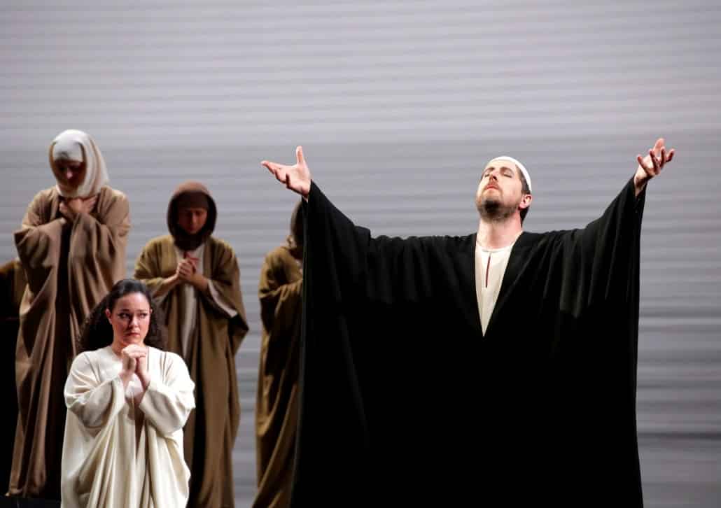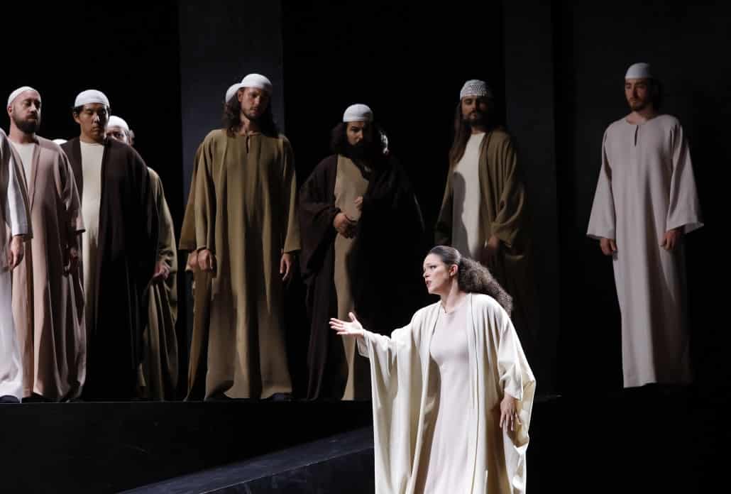Vasilisa Berzhanskaya, Eleonora Buratto et Roberto Tagliavini, en revanche, portent très haut les couleurs du chant rossinien. La première remporte un triomphe en Sinaïde. La voix est ample, richement colorée, rompue au style belcantiste, mais surtout l’interprète fait montre d’un sens des nuances lui permettant de délivrer un « Ah ! d’une tendre mère » suprêmement émouvant, amorcé piano, repris pianissimo et porté par un legato souverain. Eleonora Buratto est une Anaï absolument remarquable. La voix, impeccablement projetée, est capable de concilier morbidezza et coloratures di forza dans sa splendide et redoutable scène finale. Espérons que cette belle artiste persiste dans ce répertoire, où elle se montre éblouissante et où ses rivales sont bien moins nombreuses que dans le répertoire plus tardif qu’elle fréquente assidûment. Enfin Roberto Tagliavini incarne sans doute un des meilleurs Moïse qu’on puisse entendre aujourd’hui. Dans ce rôle à la fois magnifique et un peu ingrat (le personnage est omniprésent mais n’a pas d’ « air » à proprement parler), il fait montre d’une technique comme toujours parfaitement maîtrisée (très beaux diminuendi sur « une force invisible / M’élève au-dessus d’un mortel » ou « Moïse invoque l’Éternel » ; remarquable legato de la prière finale avec un « Des cieux où tu résides, / Grand Dieu, toi qui nous guides » chanté sur une seule et même tenue de souffle), d’une vraie présence scénique, et d’une autorité vocale qui n’exclut nullement l’humanité et la tendresse. C’est surtout le seul artiste de la distribution à parvenir à concilier exigences belcantistes et pureté de la déclamation française.