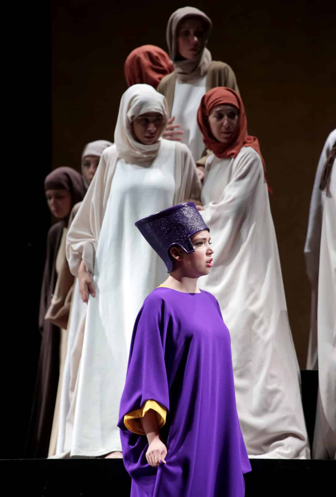 La mise en scène proposée par Pier Luigi Pizzi est fidèle aux principes qui ont assuré sa notoriété : épurée, prenant place dans un décor stylisé permettant d’habiles déplacements des chanteurs, choristes et danseurs, elle fait alterner quelques éléments kitsch ou un peu malheureux (les costumes des danseurs égyptiens, les pas de danses de certains personnages, dont un chorus line assez mal venu) avec d’autres moments plus réussis (l’utilisation de la vidéo est plutôt sobre et habile), voire émouvants, telles les apparitions prémonitoires du messie sous les traits d’un jeune enfant ; ou encore la scène finale au cours de laquelle, après le passage de la mer Rouge, les personnages, vêtus de costumes du XXe siècle, se retrouvent et s’étreignent avec émotion, incrédules et stupéfaits d’avoir échappé à leurs oppresseurs… Une scène qui « colle » parfaitement à la musique, et pourrait évoquer l’arrivée tant attendue en Terre promise, voire les retrouvailles de rescapés des camps de la mort ; mais Pizzi, fort heureusement, suggère sans appuyer et nous fait grâce d’uniformes nazis, de croix gammées, ou, d’une manière générale, de relectures plus ou moins hasardeuses (Moïse est bien Moïse, le Pharaon un pharaon, et nous sommes bien en Égypte aux temps bibliques).