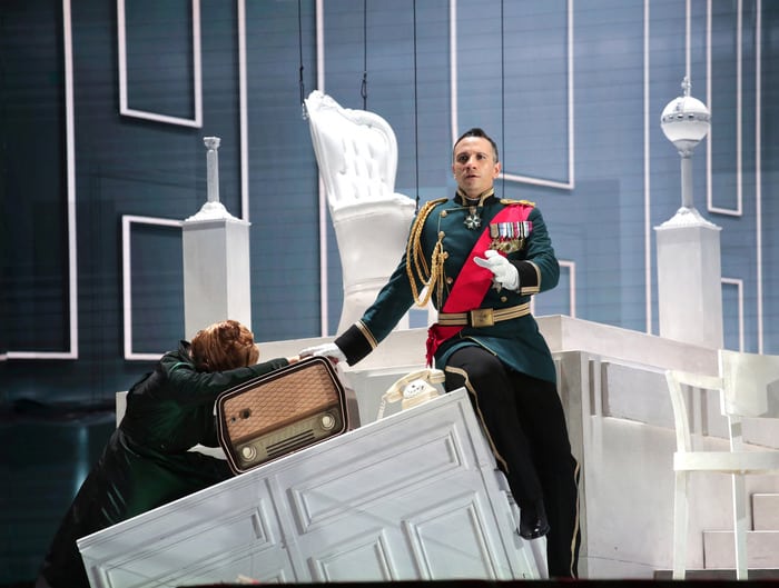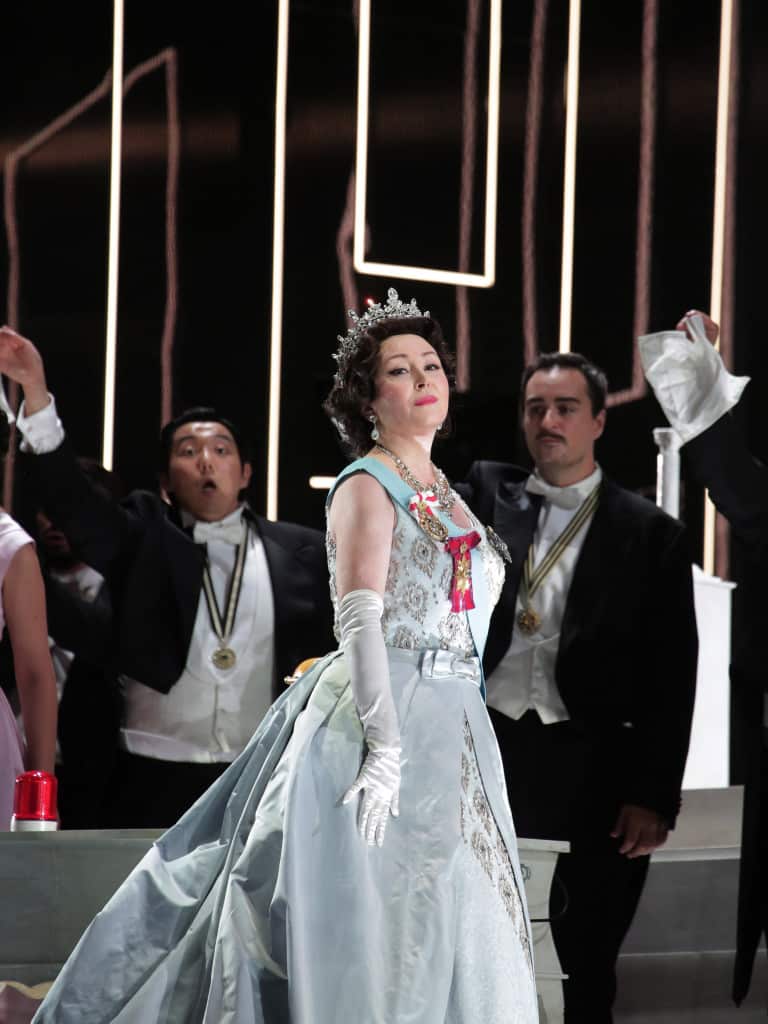 Reste à évoquer la mise en scène de Davide Livermore, très légèrement chahuté au rideau final. Rien d’indigne pourtant, loin de là : l’intrigue est transposée au XXe siècle, Élisabeth Ire devenant logiquement une Élisabeth II rappelant de très près celle croquée par Stephen Frears dans The Queen (l’apparition d’un cerf pendant l’ouverture semble une citation directe du film du réalisateur anglais), puis par les scénaristes et réalisateurs de la série The Crown. Ainsi il n’est pas interdit de voir en Leicester, devenu aviateur, un avatar du colonel d’aviation Peter Townsend, héros de la seconde guerre mondiale puis écuyer de la reine – et, accessoirement, amoureux de la princesse Margaret/Mathilde. Mais ces références importent finalement peu : on retient surtout du spectacle (outre les très beaux costumes de Gianluca Falaschi) le décalage saisissant entre la violence qui se déchaîne dans le monde extérieur (bombardements sur Londres, incendies, …) et l’étiquette de la cour (symbolisée par les allées et venues mécaniques de quelques gardes royaux et les déplacements chorégraphiés de soubrettes), qui n’en apparaît que plus futile, voire grotesque. Le message est clair : le monde s’écroule – ce que symbolise également le mobilier royal renversé ou à moitié enseveli – et s’autodétruit dans un déferlement inouï de violence tandis que la cour semble figée dans un dérisoire respect du protocole et des convenances de façade… Pourquoi pas ? Ce qui a sans doute agacé certains spectateurs, c’est peut-être le côté ostentatoire de la mise en scène (omniprésence de la vidéo, débauche de couleurs, apparition et disparition fréquentes d’éléments de décors), qui ne laisse pas suffisamment l’œuvre respirer par elle-même et tend trop souvent à prendre le pas sur la musique. Malgré tout, il y a dans cette mise en scène une vision, une cohérence… et une lisibilité, ce qui est loin d’être toujours le cas aujourd’hui ! La présence de caméras dans la salle laisse espérer sinon la sortie d’un Blu-ray/DVD, du moins une diffusion prochaine à la télévision ou sur les réseaux sociaux. Nos lecteurs pourront ainsi de forger leur propre opinion…