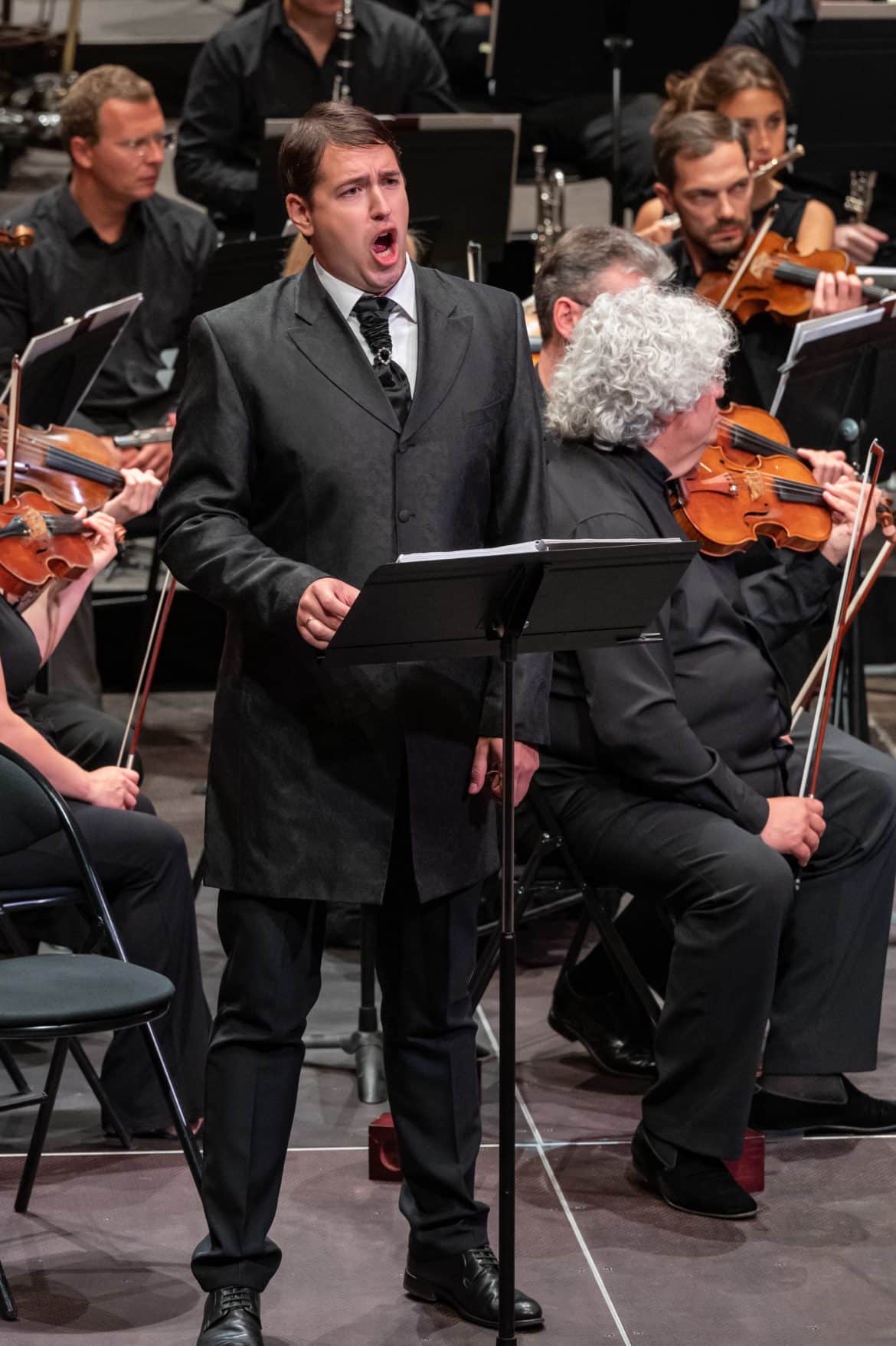 Vient le tour de Méphistophélès. Ildar Abdrazakov dévoile sa tessiture de basse avec une belle ampleur. Avec beaucoup de coffre il réalise des forte saisissants qui évoquent l’hybris bachique de son personnage. Son vibrato est tonitruant et n’altère en rien l’expressivité de ses nuances piano. Sa couleur de voix incarne les différentes facettes que le texte lui prête. En effet, il est tantôt majestueux et tantôt sautillant comme dans la petite chanson “Une puce gentille”, tantôt dans la démesure propre au diable, tantôt dans la retenue savante comme dans l’air “Voici les roses”. Par ailleurs, soucieux lui aussi de bien articuler, le public semble obéir à son injonction :”Écoute ! Les esprits de la terre et de l’air commencent un suave concert”. À la suite, le chœur entonne dans une unité vocale remarquable sa mélodie piano. Si l’on perçoit furtivement des consonnes qui ne sont pas exécutées en même temps de la part des choristes, cela reste très marginal, et l’unité vocale du chœur est appréciable, chaque chanteur cherche à fondre sa voix au sein de celles des autres pour tendre à une homogénéité vocale douce à l’oreille.