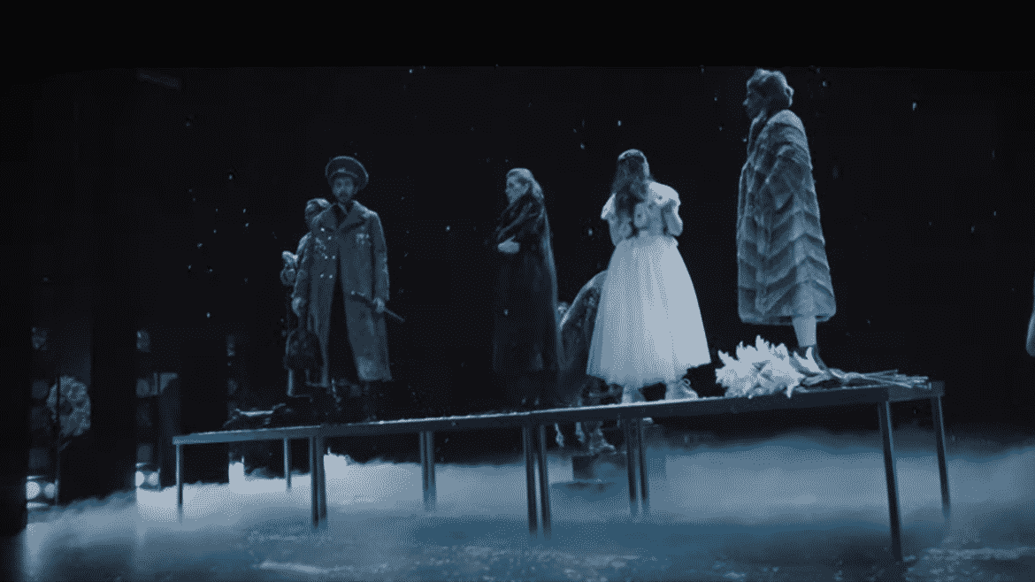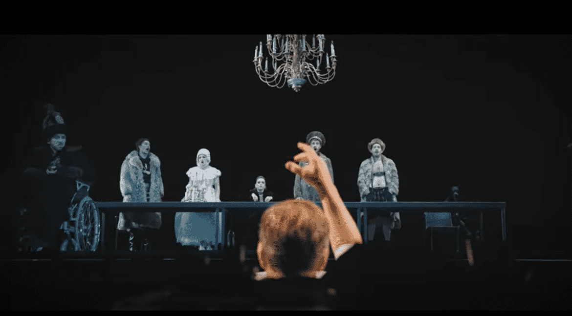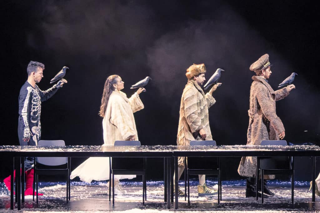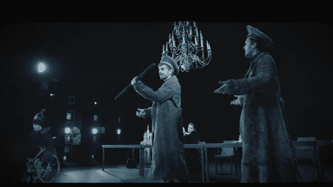 Le foisonnement des péripéties est tel que la metteur en scène, Jean Renshaw, a un peu élagué pour préserver une relative lisibilité dramaturgique, dans une approche qui privilégie une certaine distance ironique, propre sans doute à traduire la versatilité tragico-comique de l’œuvre, à défaut d’éviter certaines banalités. Dessinée par Lisa Moro, la scénographie sobre, sous les lumières fort économes de Leo Göbl, s’articule essentiellement autour d’une vaste table de banquet, où noces et possible sédimentation mnésique de La Cène condensent les deux veines de l’intrigue. Elle sert d’abord d’écrin à la caractérisation par les costumes, dessinés par Anna Ignatieva, et qui évoquent la Russie d’aujourd’hui, d’après la chute de l’Union soviétique. Le résultat assume une théâtralité indifférente aux stérilités réalistes, et n’hésite pas à forcer le trait. Revêtus des blouses et gants de pandémie, les médecins manient seringues et clystères comme au siècle des Lumières, tandis que, une fois trépassé, le tsar retrouve sa cour habillé en squelette, donnant à l’ensemble une allure de drôle de danse macabre qui s’achève sur un happy end.