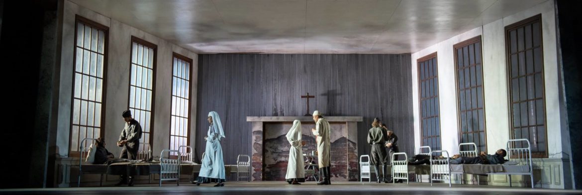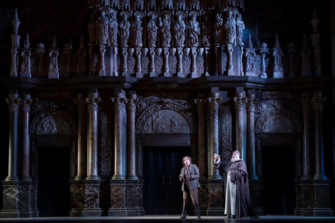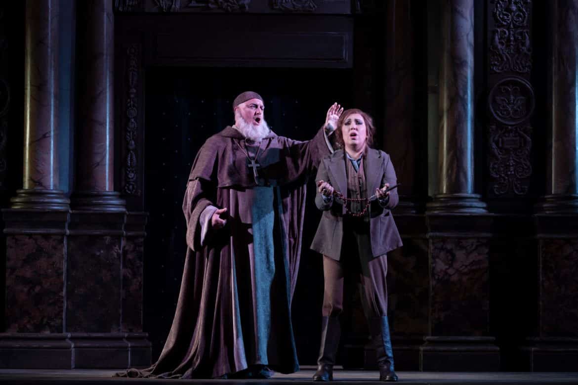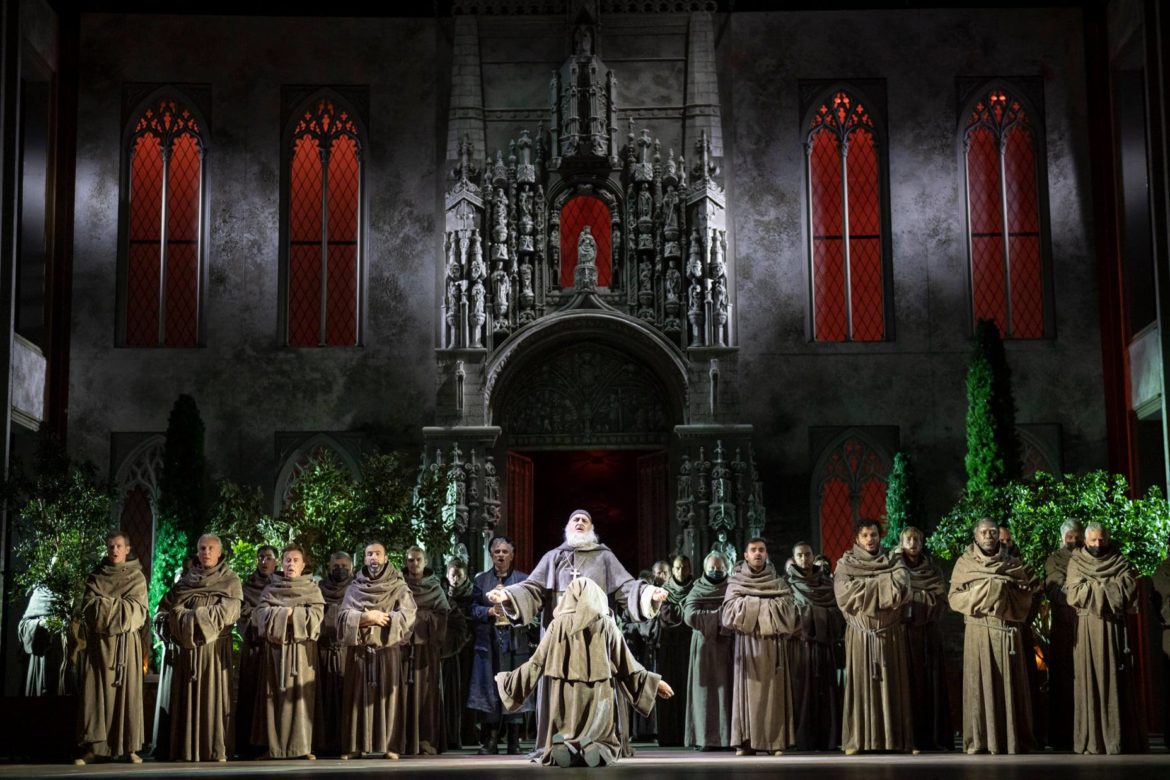 Les Chœurs de l’Opéra Royal de Wallonie-Liège, dont on a déjà évoqué l’aisance scénique, se révèlent d’une qualité vocale remarquable même si nous aurions aimé parfois un peu plus de puissance. Renato Palumbo, à la direction musicale, mène tout son monde de main de maître. Attentif aux chanteurs, il montre un vrai sens de la narration. Dès l’Ouverture, on sait déjà que personne n’en réchappera. Le Maestro sait également unifier les différents styles vocaux et musicaux de la partition. Il montre un vrai sens des couleurs orchestrales avec un étonnant travail sur les contre-chants instrumentaux. De l’Orchestre de l’Opéra Royal de Wallonie-Liège, soulignons la précision des traits de cordes, les belles couleurs de l’harmonie, la ferme tenue des cuivres et de très beaux solos, notamment celui du violon solo dans la scène du monastère.