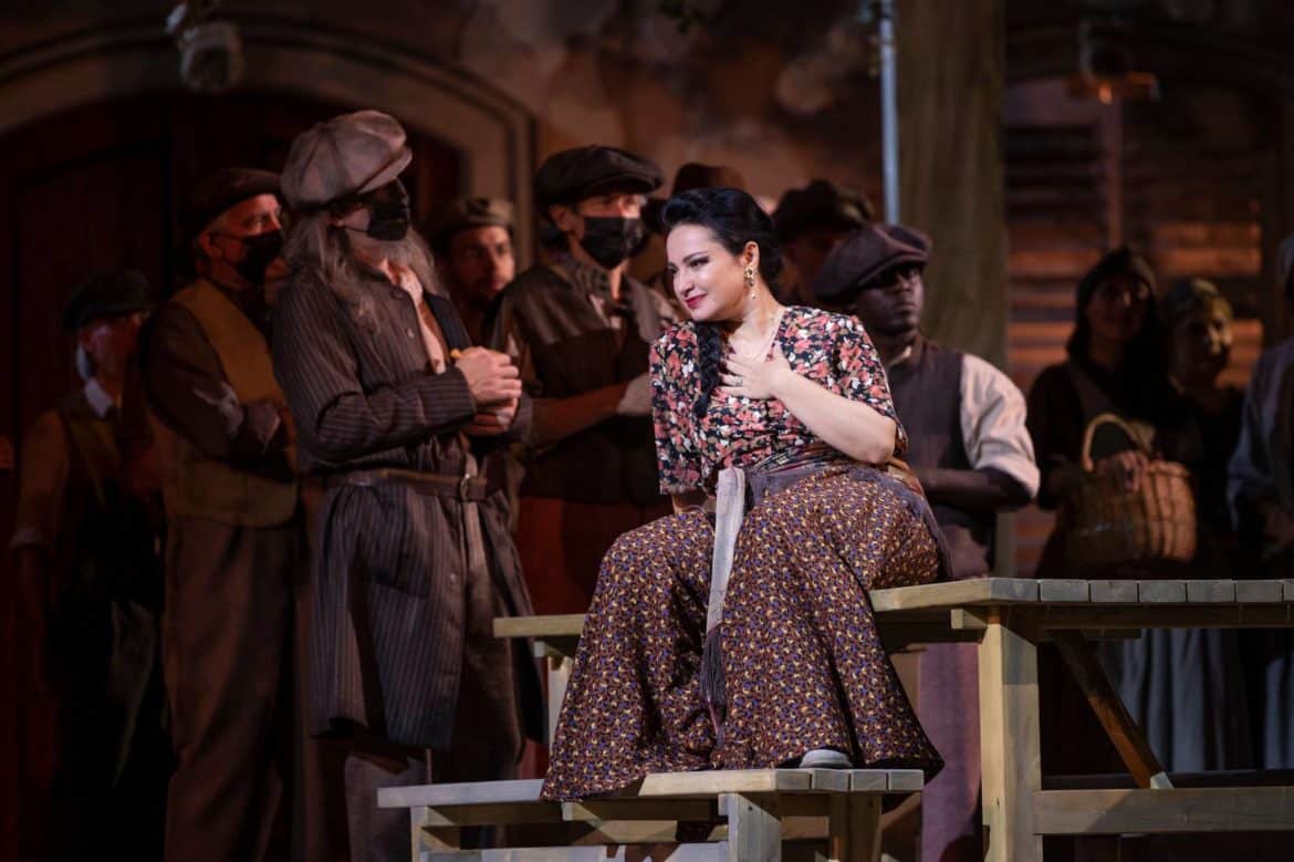 Dans cette nouvelle production de La Force du Destin, la mise en scène de Gianni Santucci (d’après une idée originale de Stefano Mazzonis di Pralafera †) nous offre une lecture légère avec une vision traditionnelle et sans surprise de l’œuvre. Pas de transpositions spatiale ou temporelle farfelues. Pas non plus de prologue psychologisant superflu joué durant l’ouverture. Seul un jeu de tarot sur le rideau de scène introduira le spectateur dans cette tragédie « ibérico-italienne » que les anciens Grecs n’aurait pas reniée. De l’efficacité, rien que de l’efficacité mais de l’efficacité intelligente. Le regard est uniquement braqué sur des personnages impuissants face à leur destin, même si des changements de scène visibles apportent un pas de côté bienvenu, nous rappelant que nous sommes bien au théâtre. La scénographie de Gary Mc Cann est magnifique, souvent poétique nonobstant quelques scènes plus prosaïques notamment à la fin du quatrième acte avec cette cabane (en tôles ???) de la pauvre Leonora. Soulignons également la qualité des lumières d’Alex Brok et la sobriété des costumes de Fernand Ruiz. Les nombreuses scènes d’ensembles, dansées et chantées, sont parfaitement intégrées à l’action et, même si Gianni Santucci a laissé beaucoup de liberté aux artistes, tout est nettement construit, sans statisme pesant ou surenchère de mouvement. Nous n’en dirons pas de même concernant la direction d’acteur des premiers rôles. Que de bras écartés, de mouvements gratuits ou de poses stéréotypées chez nos héros du jours. Les grands chanteurs ne font pas toujours de grands acteurs et un peu de sobriété aurait été la bienvenue. Reste à savoir s’il est dans la nature de certains chanteurs de savoir se laisser diriger… Interrogeons nous également sur l’usage étonnant d’une clef pour ouvrir une besace ou de l’intérêt de parler cinq minutes d’une épée quand on se bat au pistolet…