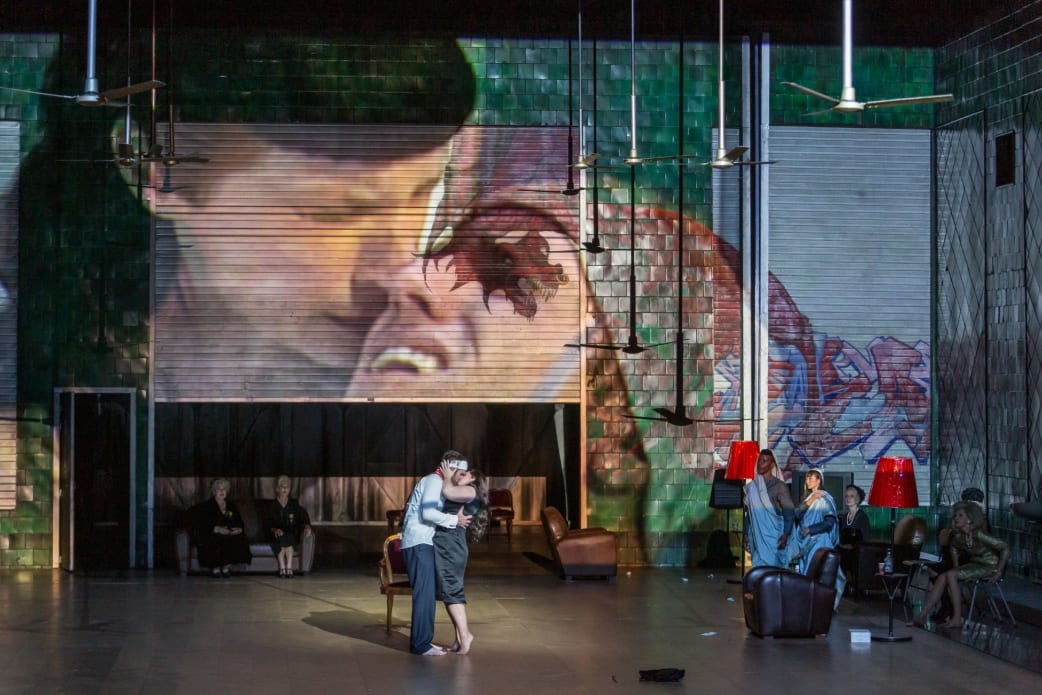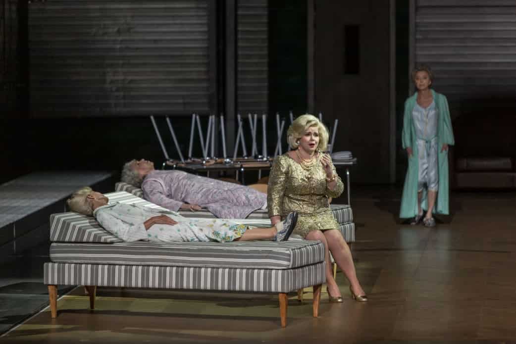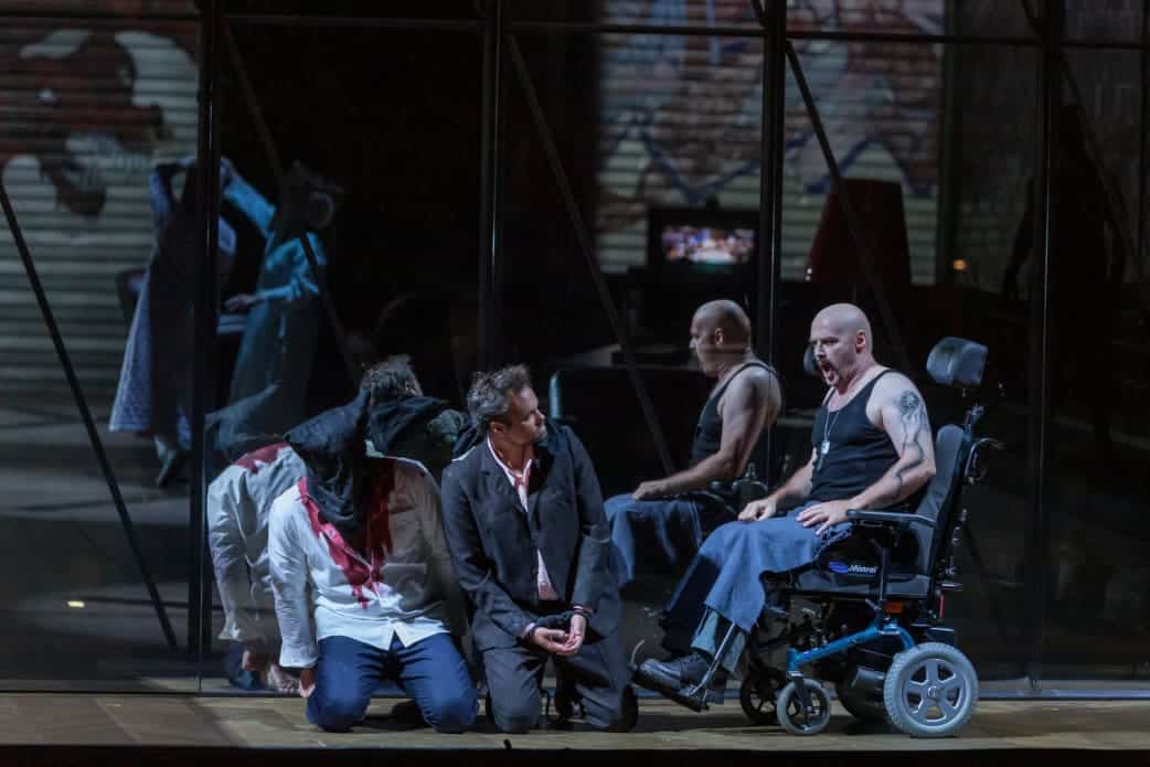 Le spectacle de Warlikowski a ses adeptes, dont nous ne sommes pas. La vision de l’œuvre par le metteur en scène (un EHPAD dont les pensionnaires se remémorent un drame qu’ils ont autrefois vécu) est non seulement éculée mais pourrait être transposée à absolument n’importe quel autre titre du répertoire, avec les mêmes costumes et les mêmes décors (j’espère ne pas donner d’idées au directeur de l’Opéra…). Fauteuils roulants, chaises renversées, lavabos, parois réfléchissant l’image du public, projections vidéo : ce spectacle restera sans doute dans les annales, comme réceptacle de tous les tics qui auront encombré 80% des mises en scène d’opéras au début du XXIe siècle. C’est bête, laid et parfaitement inutile.