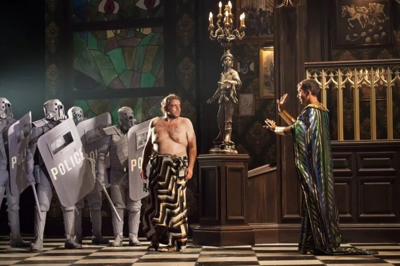 La dimension jubilatoire d’une critique nourrie de marxisme se retrouve dans le jeu des acteurs, et en premier lieu dans celui de Benny Claessens, inénarrable Olim qui n’hésite pas devant les excès. Les crises hystériques du nouveau riche au deuxième acte, confronté à la froideur de Severin face à la surabondance de prévenances dont il l’entoure, constituent l’une des acmés d’une incarnation qui ne recule devant aucun effet. La ballade sur la mort de César semble décupler les évanescences andropausées d’un Michel Serrault dans Deux heures moins le quart avant Jésus-Christ – la mise en scène assume d’ailleurs le même anachronisme délirant et satirique que le film de Jean Yanne.