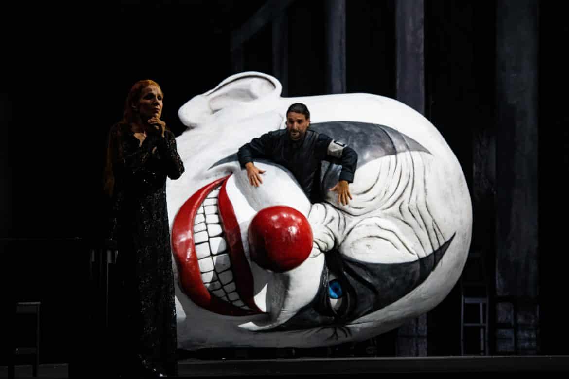 Pour actualiser ce drame romantique, les concepteurs choisissent deux astucieux référents qui déconstruisent la Venise glamour. D’une part, l’eau stagnante de la lagune ou des souterrains est captée sur l’espace scénique inondé dans lequel pataugent chanteurs et danseurs, avec de beaux reflets lumineux sur les parois dans la scène des régates (lumières de Bertrand Killy). D’autre part la « grosse-tête » carnavalesque de clown, seule touche colorée (blanc et rouge), hante le plateau de sa puissance maléfique, revisitant le grotesque hugolien. C’est de l’œil de celle-ci que s’extirpe le damné Barnaba au IV lorsqu’il vient réclamer sa proie. Unifiant les péripéties et coups de théâtre, plus ou moins invraisemblables, ces référents n’occultent pas une belle mobilité d’acteurs, en particulier celle du peuple (le chœur) et des danseurs très sollicités, quitte à construire des « tableaux » où les corps nus évoquent crument l’Enfer de Jérôme Bosch plutôt que Le Paradis du Tintoretto (palais des Doges). Nous sommes en revanche en désaccord avec le surlignage outrancier que Py accorde à la prédation sexuelle des femmes de la figuration, immanquablement dénudées et sexuées (style cabaret 1900, un fantasme agaçant), jusqu’au viol collectif d’une danseuse pendant le subtil Ballet des heures qui se clôt par un galop rutilant.