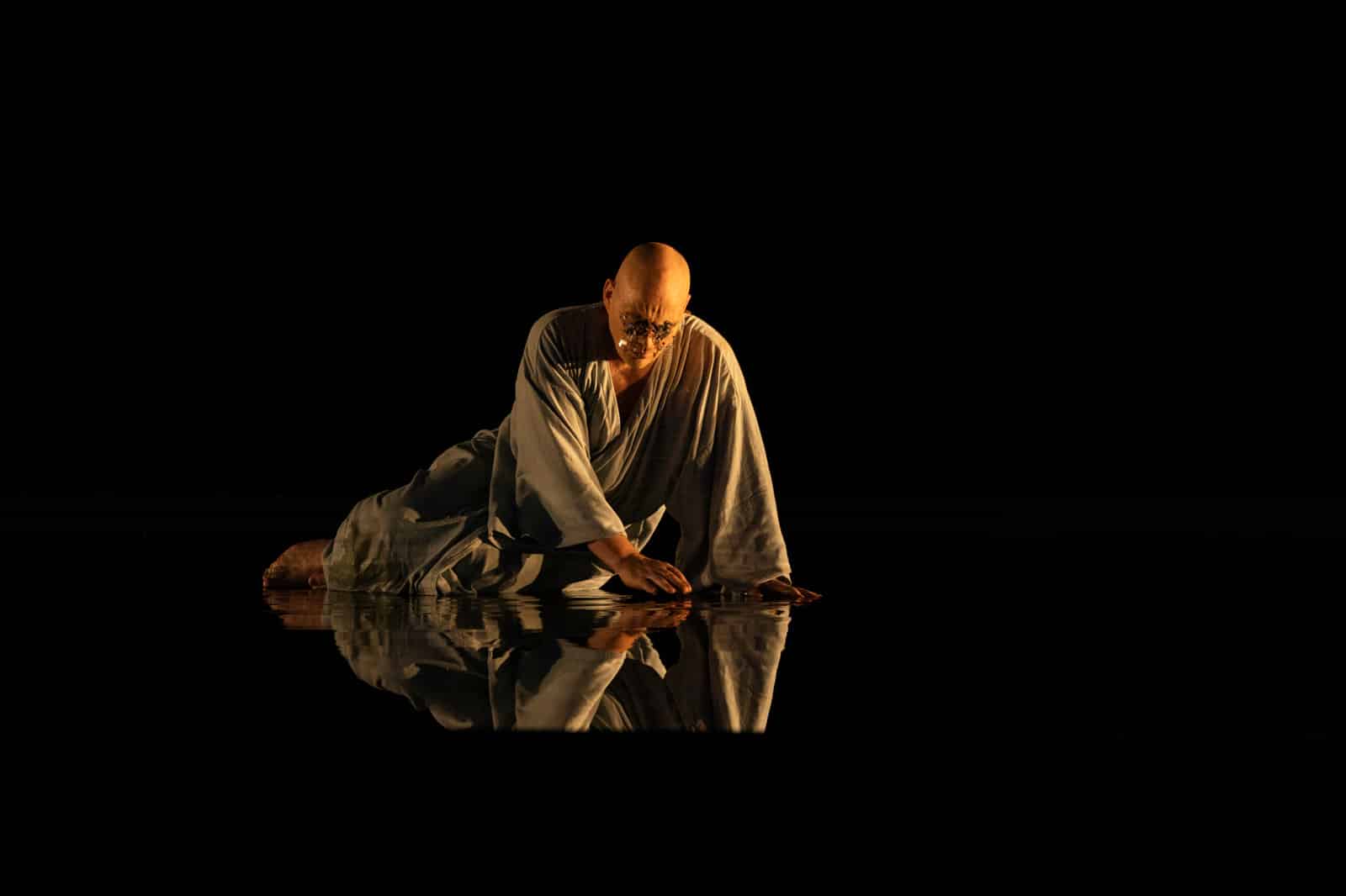 Le metteur en scène d’origine libanaise s’est bien gardé de céder aux facilités de la transposition contemporaine ou des introspections psychanalytiques. Son récit se nourrit de son travail sur les lignées familiales, et inscrit le mythe dans une généalogie remontant à Europe, se faisant également  métaphore de l’Histoire – en particulier du triangle méditerranéen formé par les migrations des légendes grecques, entre Asie, Europe et Afrique – où se nouent les questions de l’accueil et la fermeture des frontières jusqu’à l’endogamie ;  le tout est résumé dans un prologue ajouté et déclamé avec une indéniable voix de conteur par Wajdi Mouawad lui-même, où l’on discuterait peut-être l’insistance sur les détails du viol de Chrysippe. La narration, d’une belle fluidité, se fait dans un écrin scénographique épuré, dessiné par Emmanuel Clolus. Les panneaux mobiles, sur lesquels est projeté le texte du livret, sont habillés par les lumières d’Eric Champoux ainsi que les vidéos de Stéphane Pougnand, et modulent habilement l’essence des différents lieux de la tragédie, solidairement avec les mouvements d’ensembles et de foule qui façonnent l’espace dramaturgique avec une  maîtrise certaine. Les costumes d’Emmanuelle Thomas, et peut-être plus encore les coiffes et maquillages de Cécile Kretschmar, au vocabulaire volontiers botanique, se font les relais d’une symbolisation efficace, notamment en rapport avec la fertilité, et prolongent la dimension parfois rituelle des séquences, à l’exemple des célébrations de la naissance d’Œdipe. La solitude lumineuse du héros, sur une toile aux tonalités d’azur, au dernier acte, contraste intelligemment avec la noire tension de la confrontation avec son destin et son peuple, et accompagne l’évolution même de l’écriture musicale.