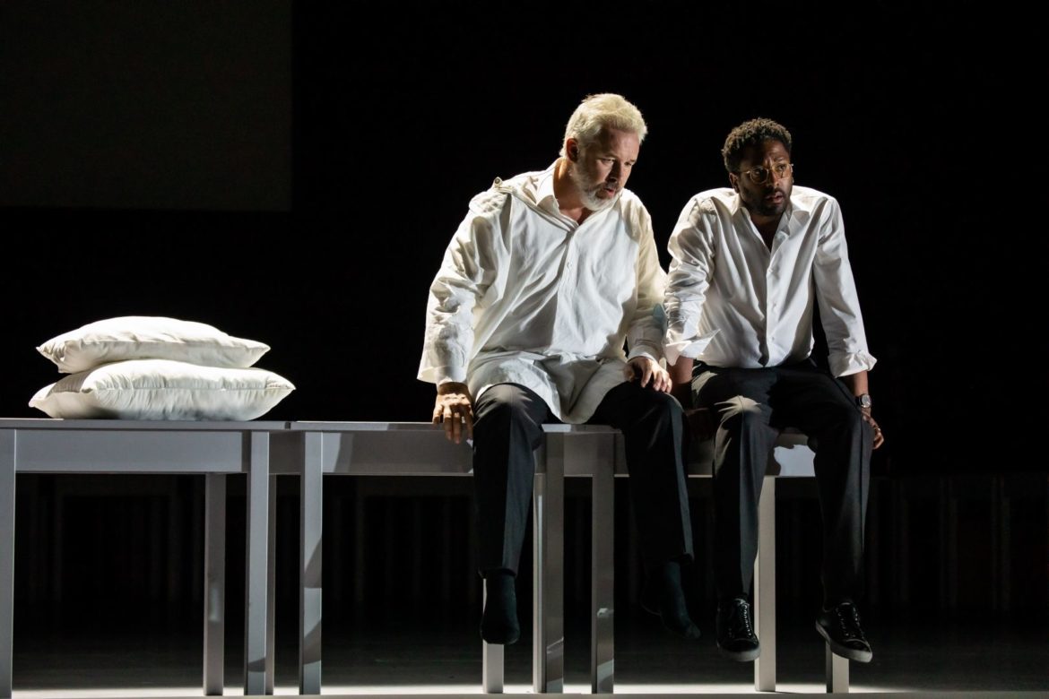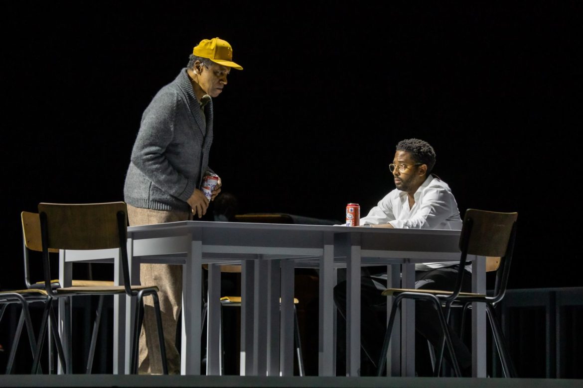 Le plateau cède sans doute à quelque tentation réaliste, dans la coïncidence entre l’ethnographie des interprètes et celle des rôles, alors que la portée universelle de l’intrigue dépasse les clivages identitaires et que la mise en scène de Ted Huffman, reprenant un dispositif abstrait modulable déjà mis en œuvre dans la création française de Denis et Katya de Venables à Montpellier, s’appuie sur des ressources vidéographiques et cinématographiques, réglées par Pierre Martin, pour une crédibilité théâtrale non naturaliste. Les chaises de Venables deviennent ici, aménagées en ouverture d’espace scénique par Johannes Schütz, des tables qui, dans les émeutes de 1992 de Los Angeles refermant le récit, seront amoncelées en barricades, alors que, pour Jonah, se précipiteront les certitudes à l’heure du trépas. Si le vestiaire dessiné par Astrid Klein expriment les époques, l’essentiel réside dans un rituel narratif et mémoriel d’abord évocation et réflexion avant que d’être reproduction imitative d’un réel aux confins du saisissable, sous les lumières calibrées de Bernd Purkrabek.