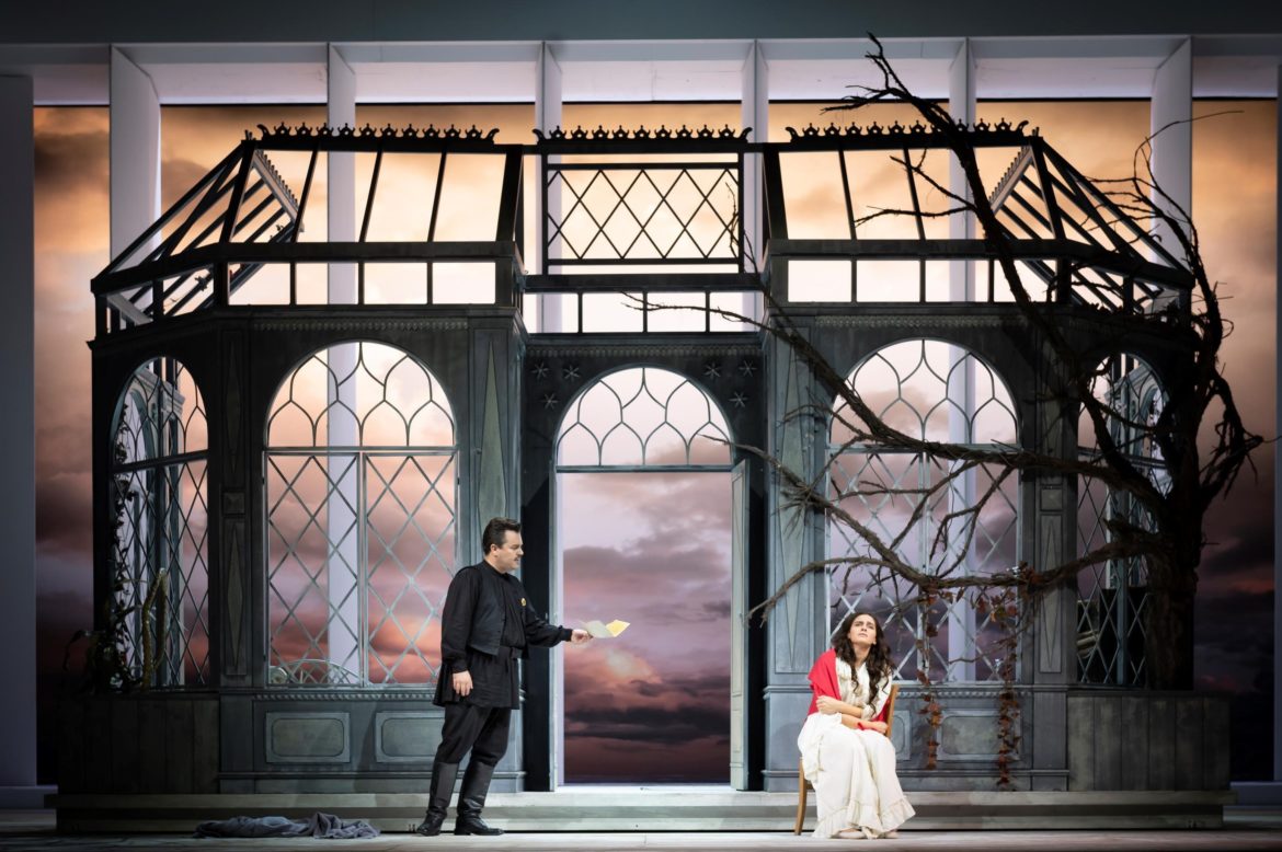 À l’acte II, la maison de Madame Larina a été saccagée par les bolcheviks qui ont pris le pouvoir, ce que symbolisent un clocher à bulbe tombé au sol et brisé, ou encore, au dernier acte, les immenses statues de Lénine et Staline écrasant toute la scène. Les soldats (parmi lesquels Onéguine, devenu un dignitaire bolchevik) festoient bruyamment et brutalisent Madame Larina et ses gens en les forçant à danser et à chanter sous la menace de fusils braqués sur eux. Outre le fait que le décalage avec la musique rutilante de Tchaïkovski s’avère assez gênant, le fait de voir cette scène quelques jours après le Guillaume Tell marseillais où le même procédé était employé pour le ballet de l’acte III suscite une certaine lassitude – d’autant que l’idée a déjà été mise en œuvre de nombreuses fois, notamment dans le Guillaume Tell londonien de Michieletto [1]…