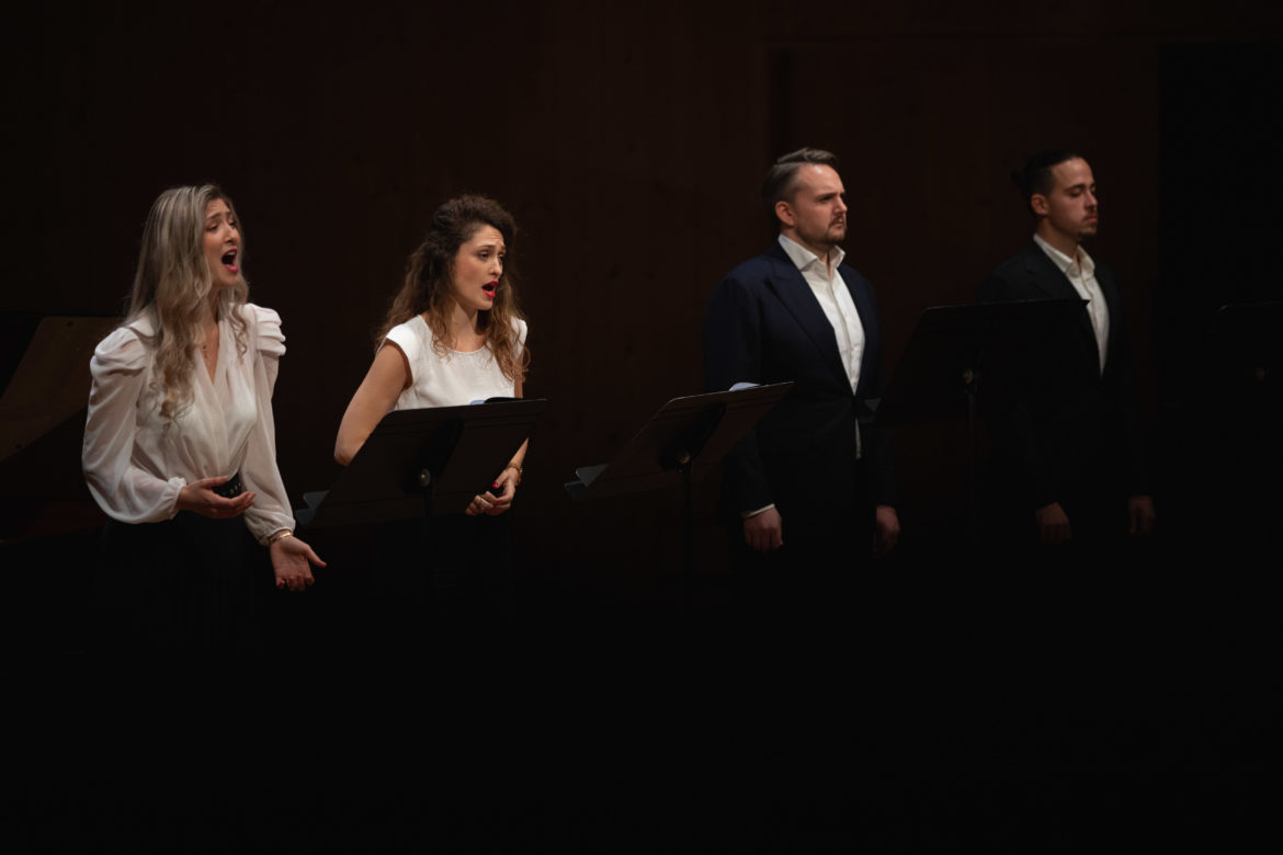 Quelle riche idée de s’acheminer vers les Spanisches Liederspiel op. 74 de Robert Schumann (1849) pour finir le récital ! Les nombreux duos font briller les facettes de combinaisons vocales variées. Celle associant ténor et baryton (Intermezzo) permet d’apprécier le baryton chypriote Yiorgo Ioannou (diplômé du Royal College of Music, London), au legato fermement soutenu. Le jeu chanté/ mimé de Martina Russomanno et Marine Chagnon (mezzo) dans Erste Begegnung (Première rencontre) révèle leur riche potentiel musical et scénique. Tout comme leur aisance hardie dans le tempo de boléro de Botschaft (Message), boosté par l’excellent pianiste espagnol Carlos Sanchis Aguir (diplômé de la Haute école de musique de Genève). Le panache de Martina Russomanno (soprano diplômé de l’université Mozarteum de Salzburg) devient intensément lyrique dans le subtil Melancholie. Toutefois, le public fait fête aux deux quatuors vocaux si dansants de ce cycle : le tout dernier, Ich bin geliebt (Je suis aimé) sonne avec cohésion, raffinement (nuances) et autant d’humour qu’un final de Singspiel.