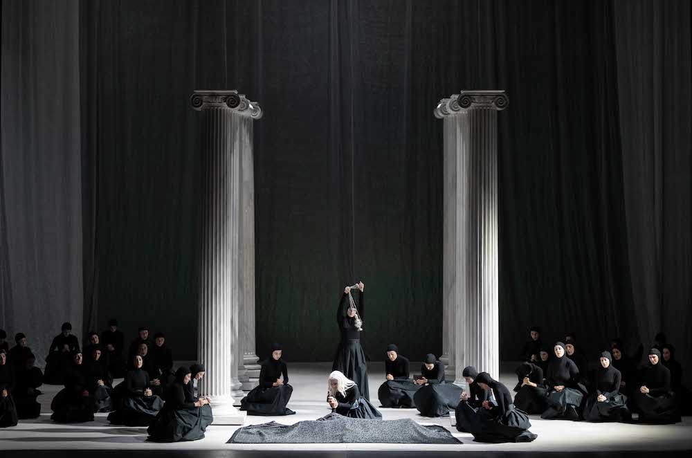 Ce ne sera pas le seul moment de grande force théâtrale d’une lecture qui, comme souvent dans les productions de la metteuse en scène sicilienne, se concentre sur la figure de la femme : la protagoniste éponyme, mais une société matriarcale, malgré la présence d’un tyran masculin, en l’occurrence un Thoas toujours colérique. C’est ainsi que la scène est peuplée de prêtresses, de furies, d’Euménides et de pleureuses : des femmes méditerranéennes vêtues de noir, la tête recouverte, mais aux formes féminines évidentes. Même les cariatides de la loggia du temple de Diane sont ici vivantes. La Grèce, revisitée par la sensibilité du XVIIIe siècle de Gluck, retrouve son caractère méditerranéen et le blanc marbré des armures et des colonnes contraste avec les rouges et les noirs des costumes de Vanessa Sannino. Dans la scénographie de Carmine Maringola, la référence au classicisme s’observe dans les colonnes ioniques de l’Érechthéion athénien, ici montées sur des socles autopropulsés pour former différentes configurations et suggérer les divers décors. Fidèle à l’histoire et à ses origines, Dante peuple la scène d’images significatives, comme le squelette de la biche remplaçant la statue de Diane, qui constitue ici la trame de l’histoire mais rappelle aussi le cheval des fresques du Triomphe de la Mort du Palazzo Abatellis de Palerme ; ou le véritable tableau vivant que constitue l’épuisante préparation du sacrifice. Ou encore, plus avant dans le spectacle, le linceul noir simulant astucieusement un corps tridimensionnel.