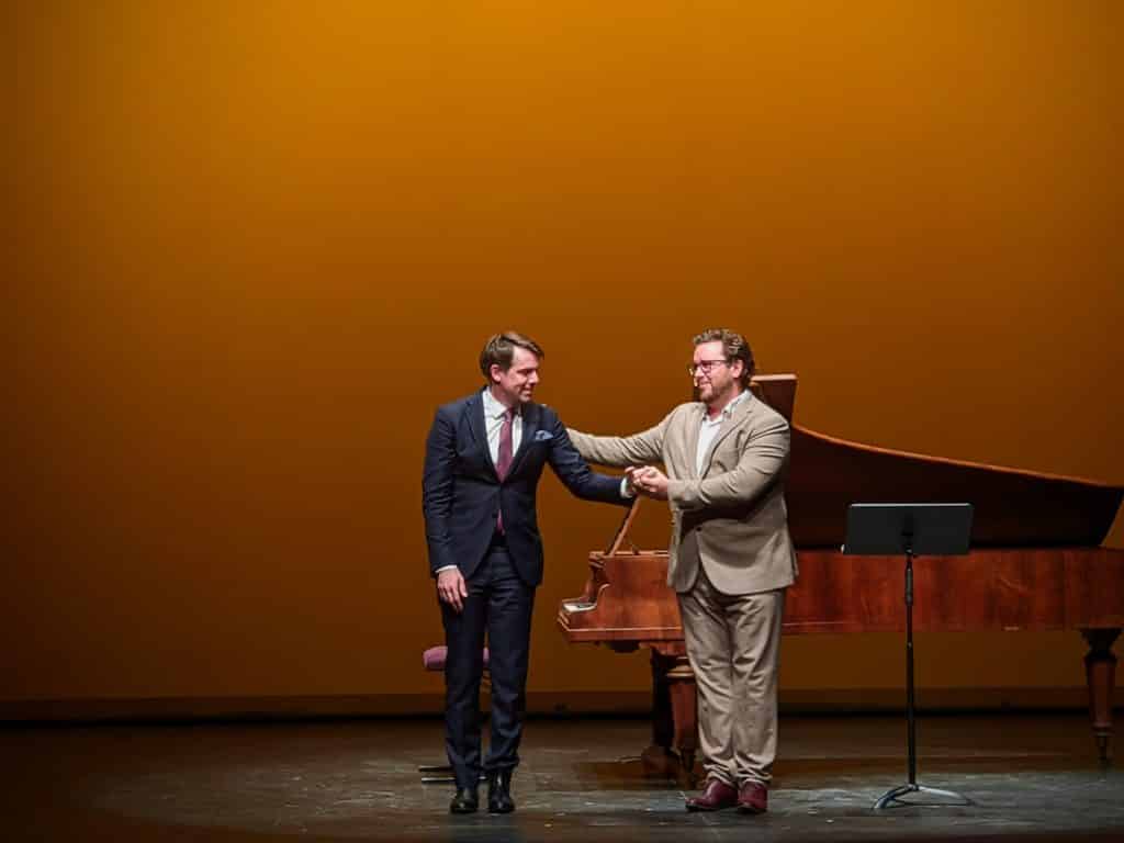 Le vivant dans son expression intériorisée, c’est la sélection de trois lieder schubertiens, parmi les plus connus,  interprétés par deux chanteurs de prestige. La soprano Tara Stafford-Spyres dialogue avec ses complices (Christian Laborie, clarinette et Mathieu Pordoy, piano) dans Der Hirt auf dem Felsen (D 965). Le trio restitue le naturel bucolique de cette pièce sublime, sans affèterie ni rubato. Lorsque la clôture du concert s’opère avec Du bist die Ruh D 935 (Tu es le repos) et la Sérénade du Schwanengesang D 957 (Chant du cygne), tous deux chantés par Michael Spyres, le paradis s’entrouvre. Chanté-murmuré jusqu’au pianissimo le plus ineffable, le premier lied fait valoir la souplesse, la luminosité des aigus et la parfaite diction allemande de l’artiste. Le second lied fait valoir son double registre vocal, soit « basse-taille » dans le médium-grave, soit ténor. Une voix revendiquée dans son récent enregistrement chez Erato, Bariténor (CD Bariténor avec l’Orchestre national de Strasbourg, Erato).  Sans monopole sur le programme, sa prestation contribue à rappeler que l’ artiste peut tout incarner avec subtilité, du bel canto au drame beethovénien, du Postillon de Lonjumeau au récital de lieder.