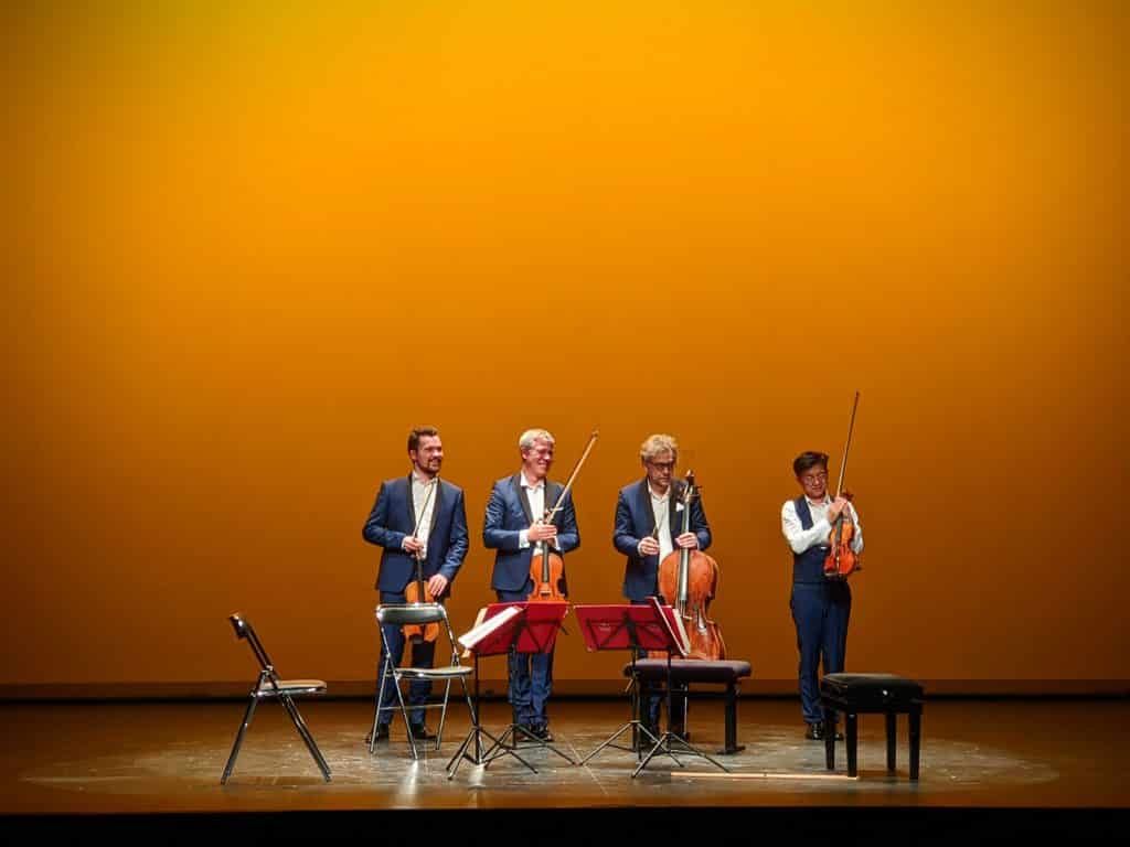 Le vivant, versus organique et même cri, c’est la performance musicale de Diotima dans le 3e Quatuor Grido (2001) de Lachenmann. Présent sur tous les plateaux du festival, le compositeur affirme sa vision audacieuse du créateur : trouver le métier dans chaque pièce, comme Robinson Crusoé sur son île. Ici, l’hétérogénéité des sons et bruits disséminés (crissements, raclements, attaques, glissandi)  est bluffante. Les quatre archets rivalisent en coups de scalpel (entrées différées) ou bien s’unissent dans une chorégraphie violente de gestes : à la corporéité des sons correspond la gestuelle des musiciens.