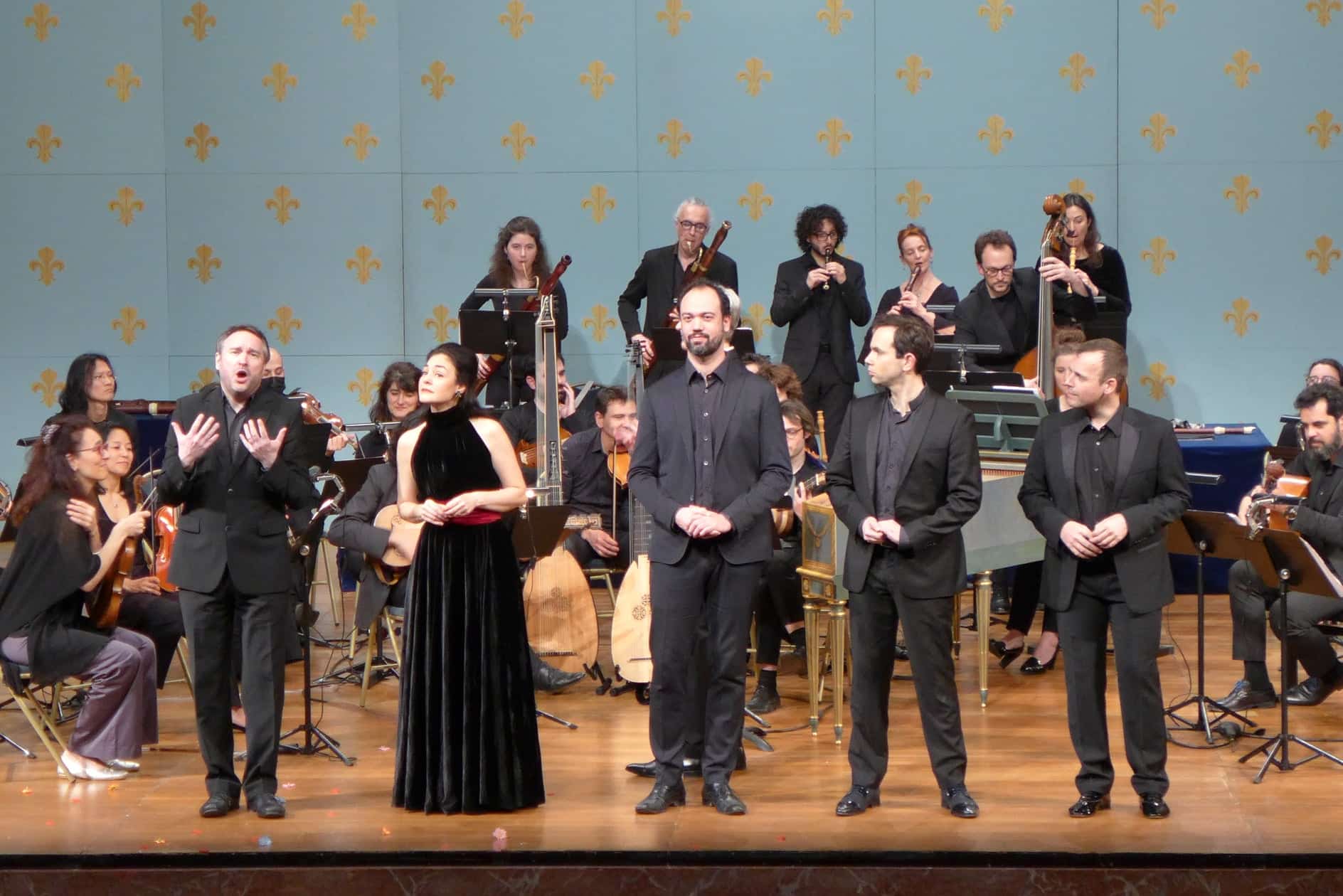 En cette soirée du 14 janvier, c’est Vincent Dumestre et le Poème Harmonique qui ont rendu hommage à Molière, Lully (et Charpentier) dans un concert intitulé Le Ballet des Jean-Baptiste, et pour lequel ils se sont assurés la participation vocale d’Ana Quintans, Cyril Auvity, Marc Mauillon, Igor Bouin et Virgile Ancely. Vincent Dumestre et son ensemble font montre, au cours du concert, de toutes les qualités qui ont assuré leur notoriété : rigueur stylistique, raffinements poétiques, imagination, à quoi il faut ajouter un sens certain de la fantaisie et de l’humour pour cette soirée marquée, en grande partie, au sceau du rire et de la bonne humeur. Le timbre suave de Cyril Auvity fait notamment merveille dans le registre élégiaque, et la musicalité constante, la sensibilité d’Ana Qintans trouvent, dans la « Plainte en musique » de Georges Dandin (« Ah ! mortelles douleurs ») un cadre idéal où s’exprimer. Mais ces deux artistes sont aussi capables d’humour et se joignent à leurs compères pour une désopilante Cérémonie des Turcs. Le Trio Grotesque du Mariage forcé (avec ses allusions à « la belle harmonie » ou aux chants des « chiens, chats et des rossignols d’Arcadie ») et l’extrait de La Pastorale comique (« Ah ! Qu’il est beau, / Le jouvenceau ! ») sont irrésistibles de drôlerie. Le concert est par ailleurs ponctué par les interventions fort amusantes d’Igor Bouin, impayable dans son numéro de « m’as-tu vu » lorsqu’il se targue d’avoir remporté d’innombrables triomphes, ou lorsqu’il tourne en dérision le français « restitué ». D’une manière générale, les voix des cinq chanteurs sont parfaitement assorties en termes de couleurs ou de puissance, ce qui nous vaut une belle homogénéité dans les ensembles – et leur réelle complicité fait que les numéros proposés sont tout aussi bien chantés que joués.