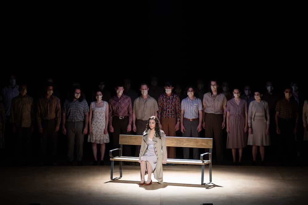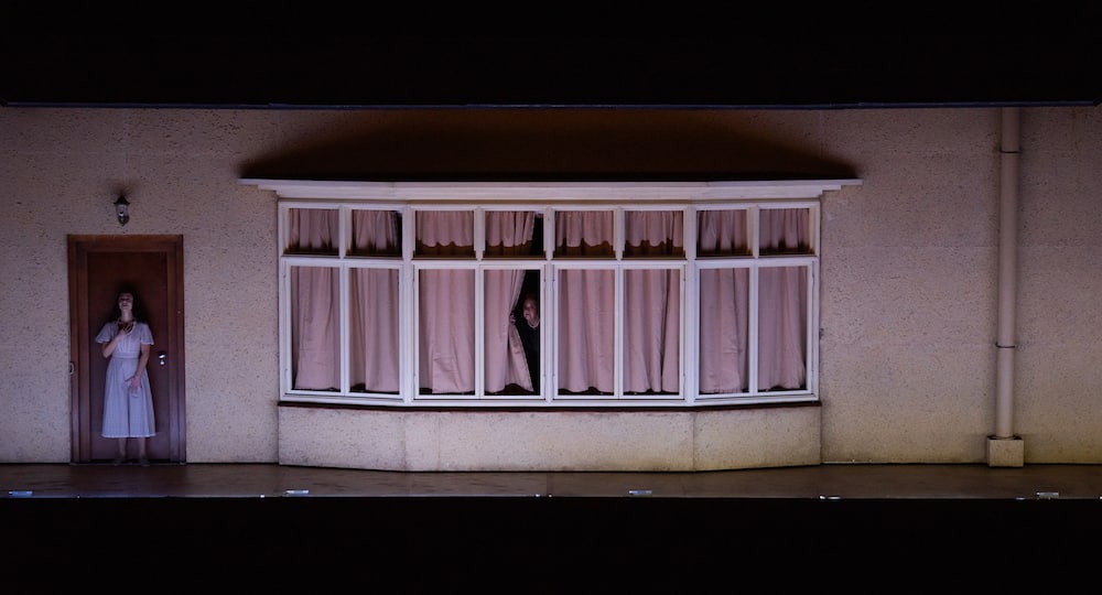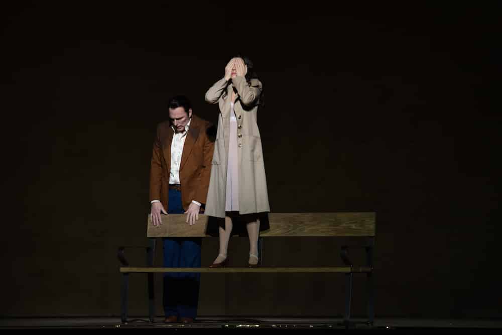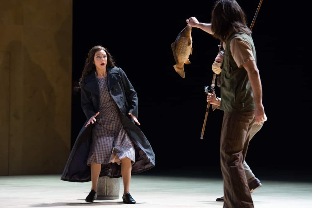 La scénographie d’Antony McDonald (il a également conçu les costumes) consiste en une grande boîte en bois fermée dans laquelle un élément scénique est inséré afin de former l’intérieur bourgeois des Kabanov (le décor est celui des années 1970). Pivotant sur elle-même, elle devient la maison vue de l’extérieur, c’est-à-dire du jardin du deuxième acte où a lieu la rencontre des deux couples d’amoureux et où un triste lampadaire triste éclaire la scène, simplement occupée par un banc. Le vieux palais à moitié détruit dans lequel se réfugient les personnes prises dans la tempête de l’acte III devient un abri pour arrêt de bus, et la Volga dans laquelle les jeunes villageois lancent leurs cannes à pêche n’est autre que la fosse d’orchestre. Les eaux de la rivière qui engloutissent la malheureuse dans l’éclair final sont en fait les villageois eux-mêmes, lesquels ont d’abord ignoré puis condamné le comportement de la jeune femme (« Pourquoi me traitent-ils ainsi ? On dit qu’il fut un temps où les femmes comme moi étaient condamnées à mort… »), et qui maintenant l’emportent, telle une immense vague. La conception des éclairages, signés Lucy Carter, est complexe, mais n’est réalisée qu’imparfaitement à certains moments de la représentation. La lecture de Richard Jones est appréciable quand il s’agit de souligner la différence entre la jeune fille et son environnement, mais elle n’est pas pleinemùent convaincante dans le finale : tout au long de la représentation, les allées et venues nerveuses des passants et d’un cycliste ponctuent l’action ; ils ne quittent la scène qu’à la toute fin de l’action ; ne reste plus, sur le sol, que le corps de Kátia sur lequel se penche son mari (bien que le livret signale qu’il s’éloigne dans un état d’agitation…), tandis que sa belle-mère reste cloîtrée, sur le côté, peut-être en proie remords. C’est du moins ce que l’expression de Susan Bickley laisse à penser, même si les derniers mots du personnage ne le laissent guère entendre !