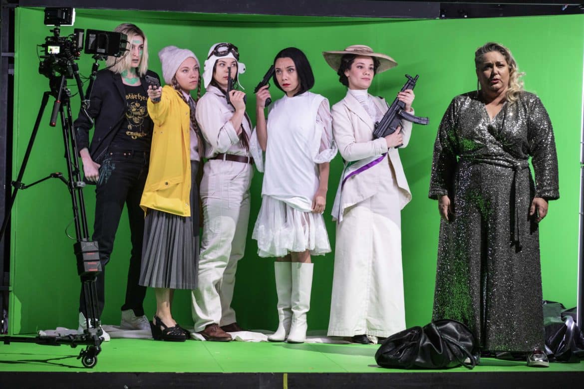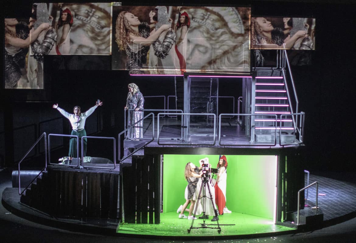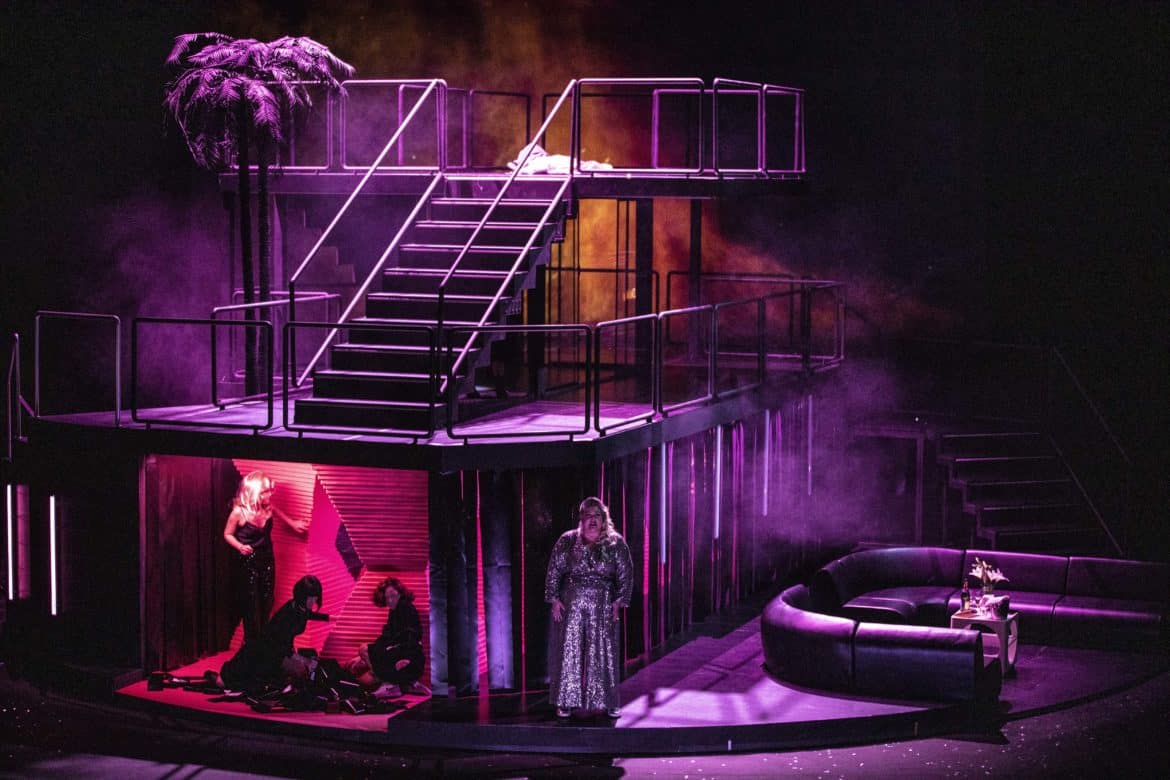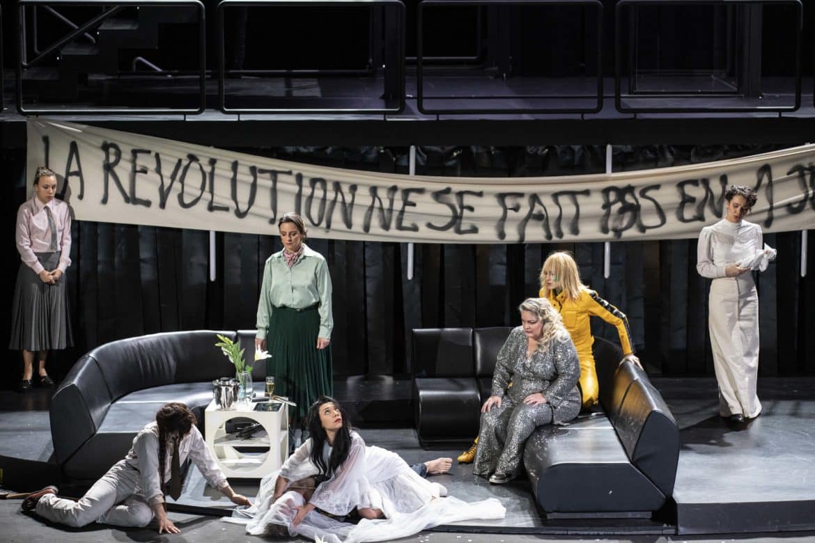 Une fois dûment balancé, le Porc peut et doit être rééduqué. Telle est, semble-t-il, l’une des leçons qu’il faut tirer de la nouvelle production d’Ariane et Barbe-Bleue présentée à l’Opéra de Lorraine. Si Ygraine, Bellangère et les autres refusent finalement de quitter le château, c’est parce qu’elles ont l’intention de faire subir à leur tortionnaire une sorte de révolution culturelle : passé à tabac par les paysans (croisement de Gilets Jaunes et d’attaquants du Capitole de Washington), menacé par le club de golf que lui a confisqué Ariane, affublé d’un bonnet phrygien, Barbe-Bleue ne sera pas envoyé en camp de travail, mais sera obligé de se plonger dans de saines lectures qui lui feront prendre conscience que tout a changé. Dans cette grande villa où se déroule l’action – beau décor signé Nina Wetzel, tournant et parsemé de néons, comme ceux de Pierre-André Weitz –, les cinq premières épouses rêvent déjà de révolte car, lors de l’ouverture des portes, une vidéo réalisée en direct nous les montre adoptant divers déguisements de femmes rebelles. La rébellion se concrétisera au dernier acte, lorsqu’elles prendront le costume de leurs modèles, suffragette, Greta Thunberg ou Uma Thurman dans Kill Bill. Vêtements et décors se couvrent de slogans « révolutionnaires », mais Ariane ne parviendra pas à les convaincre d’aller porter à l’extérieur leur message anti-porcs. Ariane et Barbe-Bleue est une œuvre difficile à monter de manière convaincante, car elle inclut un certain nombre de passages où l’action se relâche ; certains optent pour le mythe, comme Stefano Poda à Toulouse dernièrement, d’autres pour la transposition vers notre réalité, comme le fait cette fois Mikaël Serre à Nancy.