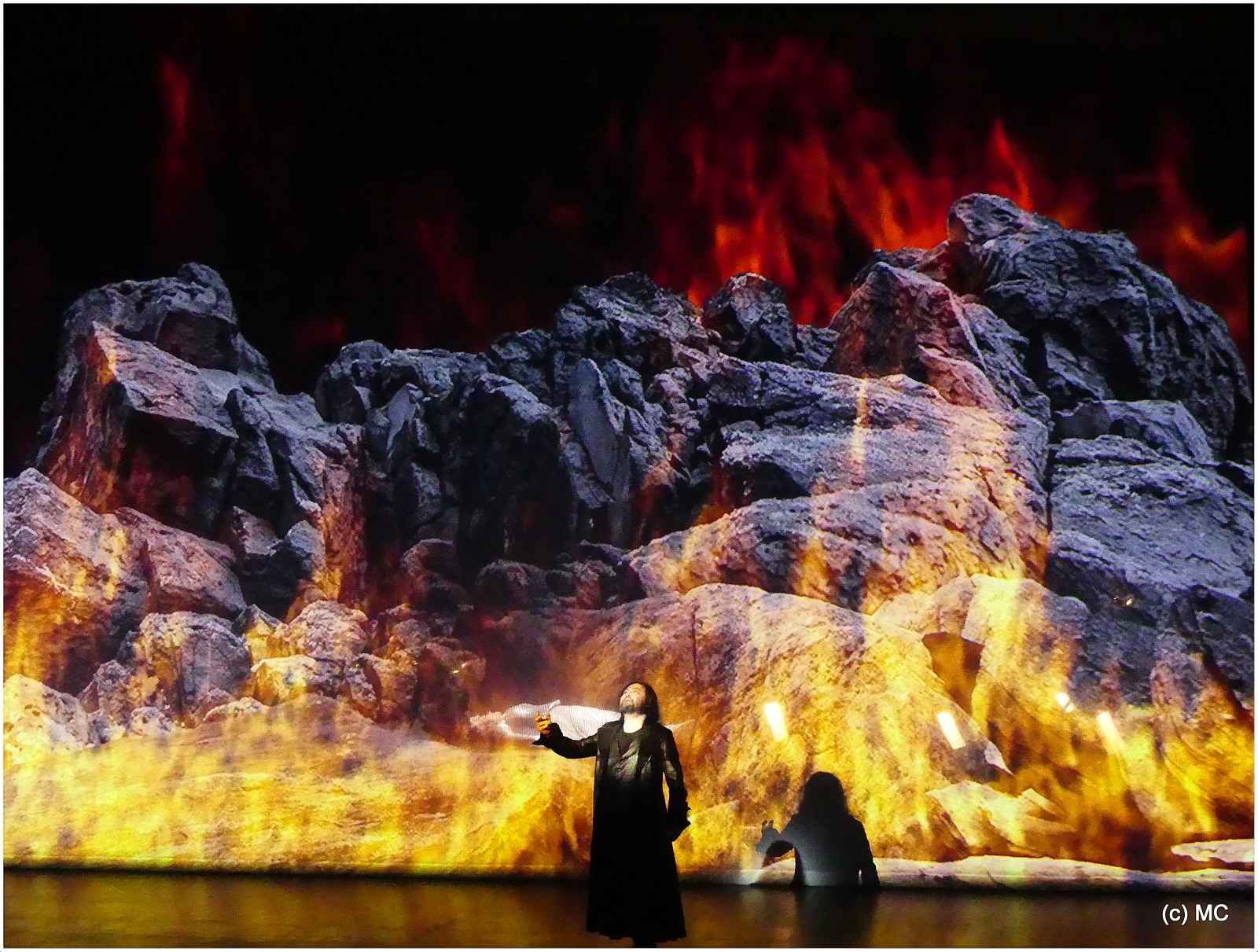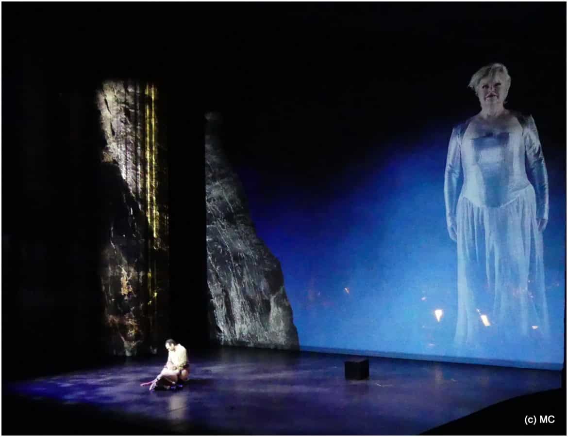 Associées depuis tant d’années à l’Opéra de Marseille, les productions signées Charles Roubaud, le plus souvent dans des costumes de Katia Duflot, font partie des beaux moments de l’histoire de ce théâtre. Si l’adaptation scénique imposée n’a pu totalement permettre de retrouver la magie, encore vivace à notre esprit, de la production de 2007, le metteur en scène marseillais continue de s’appuyer sur l’intervention bienvenue de la vidéo de Camille Lebourges et les belles lumières de Marc Delamézière. Au-delà d’un dispositif scénographique efficace mais réduit au bloc rectangulaire qui, au deuxième acte, sert de trône à Wotan, les mappings et projections plongent le spectateur dans la forêt profonde du premier acte, puis dans le Walhalla, au deuxième, avec ses pans de ciel bleu, ses nuages fuyant et ses marbres rosés (les mêmes que ceux des colonnes du plateau de l’Opéra) et, enfin, dans la nature tourmentée et chaotique du troisième acte avant l’embrasement final du plateau, toujours aussi spectaculaire.