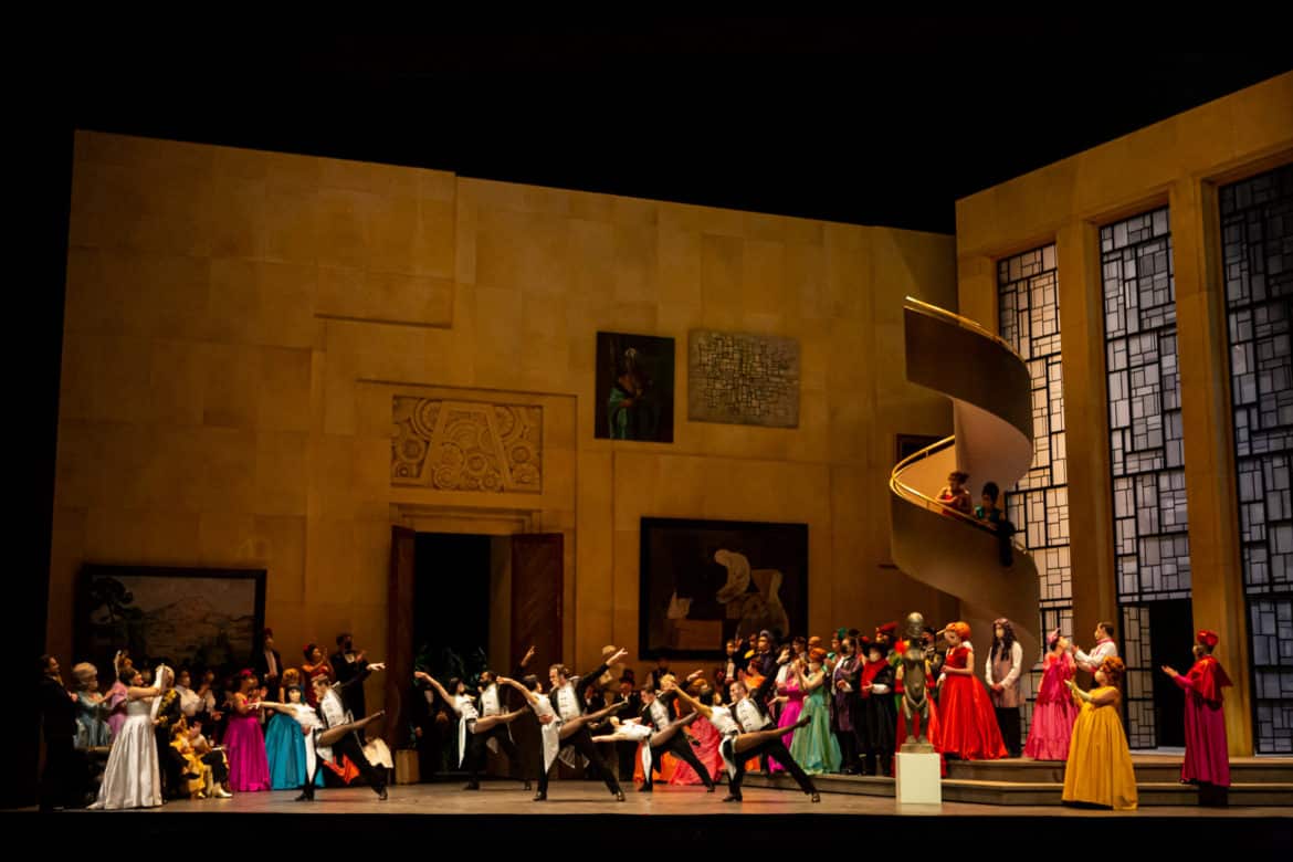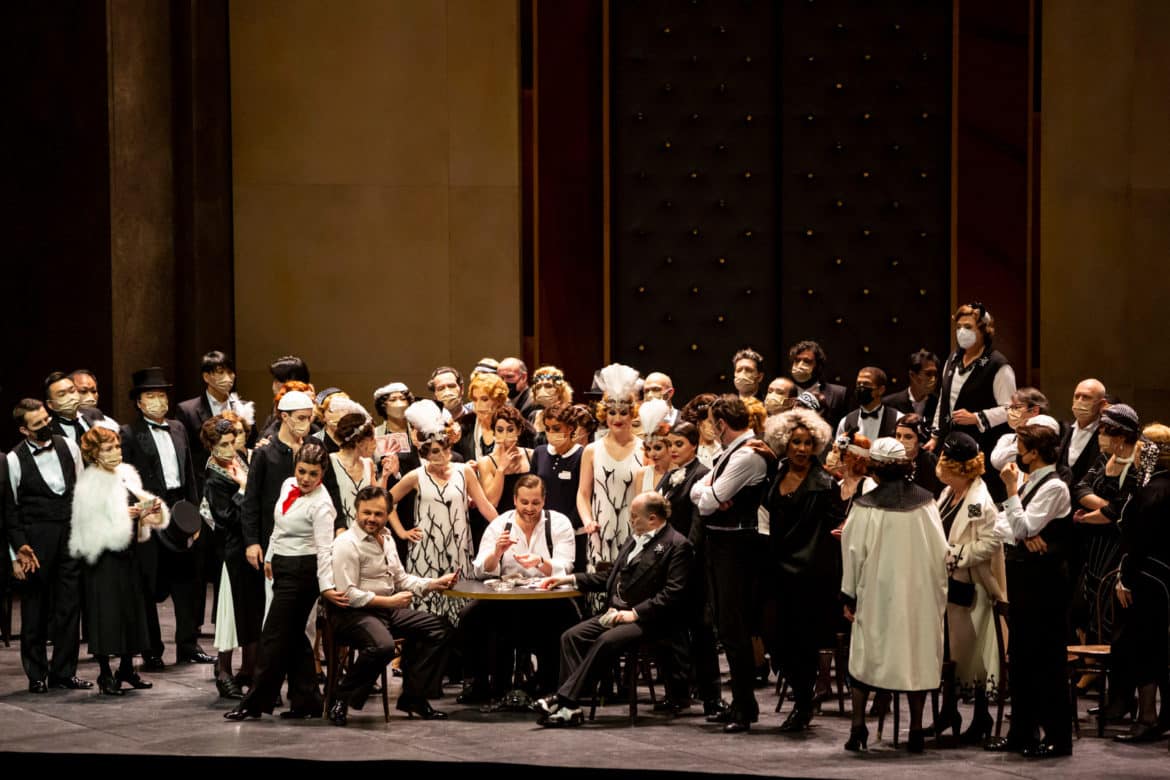 La fête masquée. Car, mesures sanitaires obligent, si le public portait le masque, les solistes, eux, en étaient heureusement dispensés. Ce n’était pas le cas des danseurs et des chœurs, ce qui devait rendre leur prestation compliquée, puisque chanter dans le masque n’est pas gage de facilité ni de précision d’ensemble.