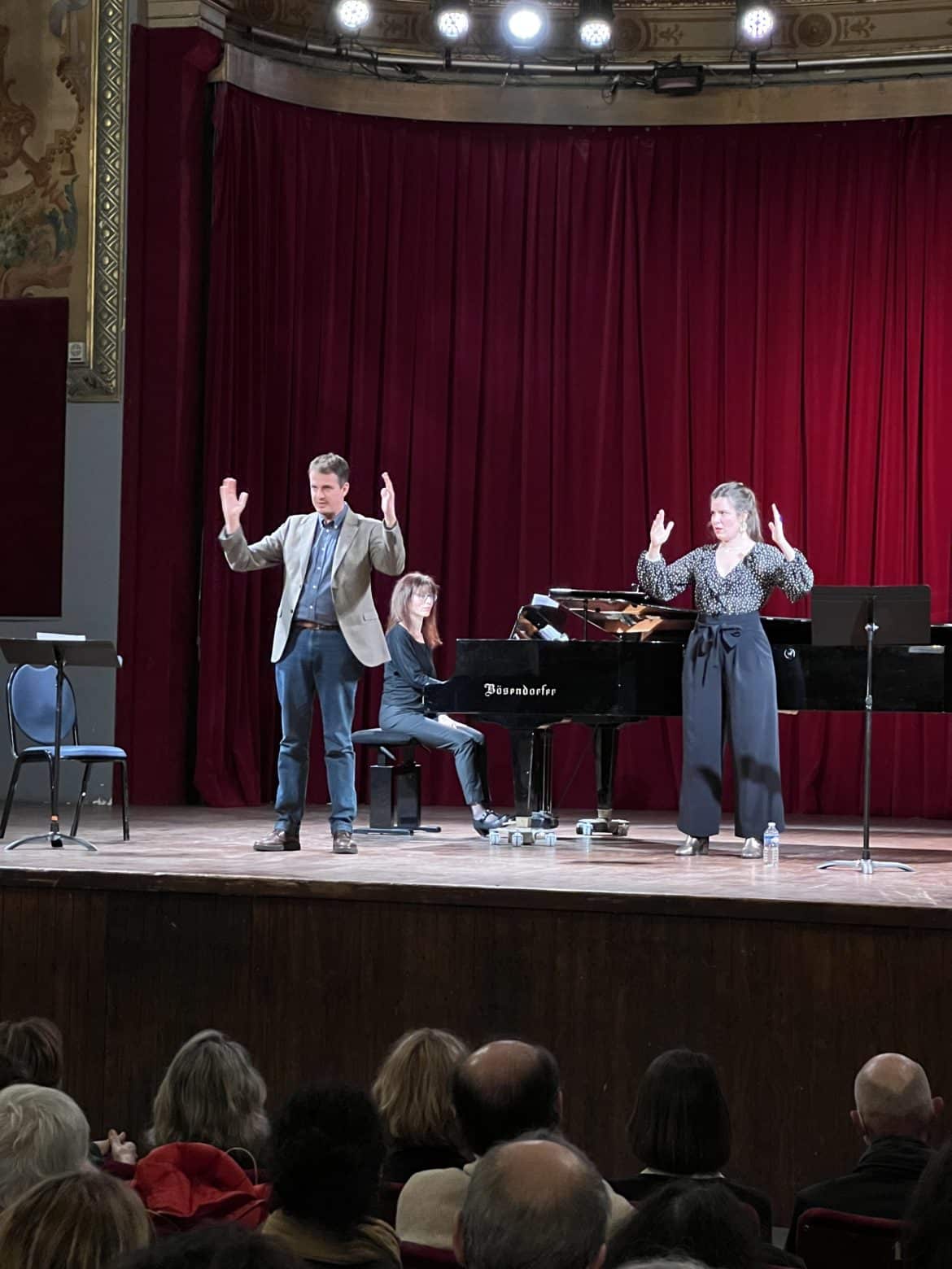 Dans la même salle Molière, la masterclass de Philippe Jaroussky est un moment attrayant tant la pédagogie que pratique le contre-ténor est ludique et bienveillante. Basés sur ses propres démonstrations vocales, ses conseils s’orientent tant vers l’émission vocale et la posture corporelle que vers l’attention portée au vers chanté et à la musicalité. Au fil des échanges humoristiques avec le public – de jeunes étudiants-étudiantes et des auditrices aux cheveux blancs – l’artiste crée une connivence qui produit ses fruits. Dès qu’une chanteuse parvient au résultat espéré sur un fragment, les applaudissements crépitent spontanément ! En pédagogue expérimenté depuis la fondation de son Académie (2017), il ne se cantonne pas au répertoire baroque et classique, de G. F. Haendel à C. W. Gluck et Mozart. Sa compétence est tout aussi renseignée dans les airs d’Offenbach, de Massenet ou Montsalvatge. Sa partenaire, la pianiste Anne-Lise Dodelier, est d’une réactivité exemplaire.
