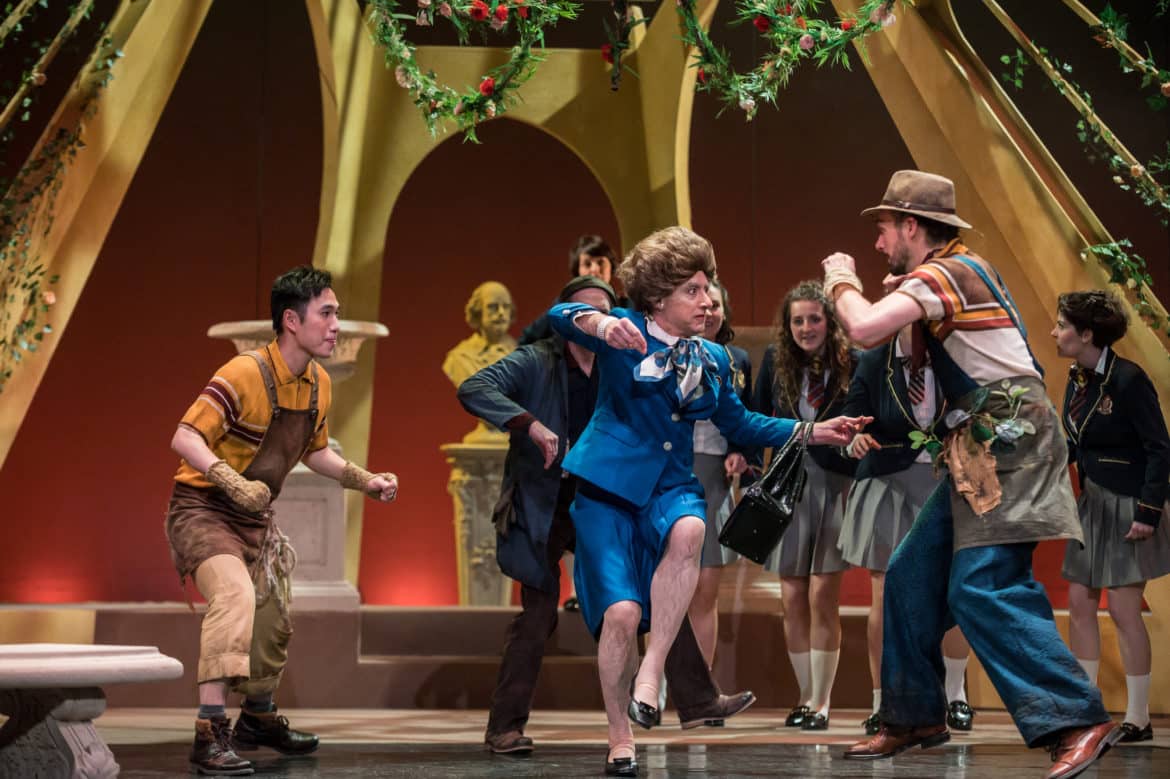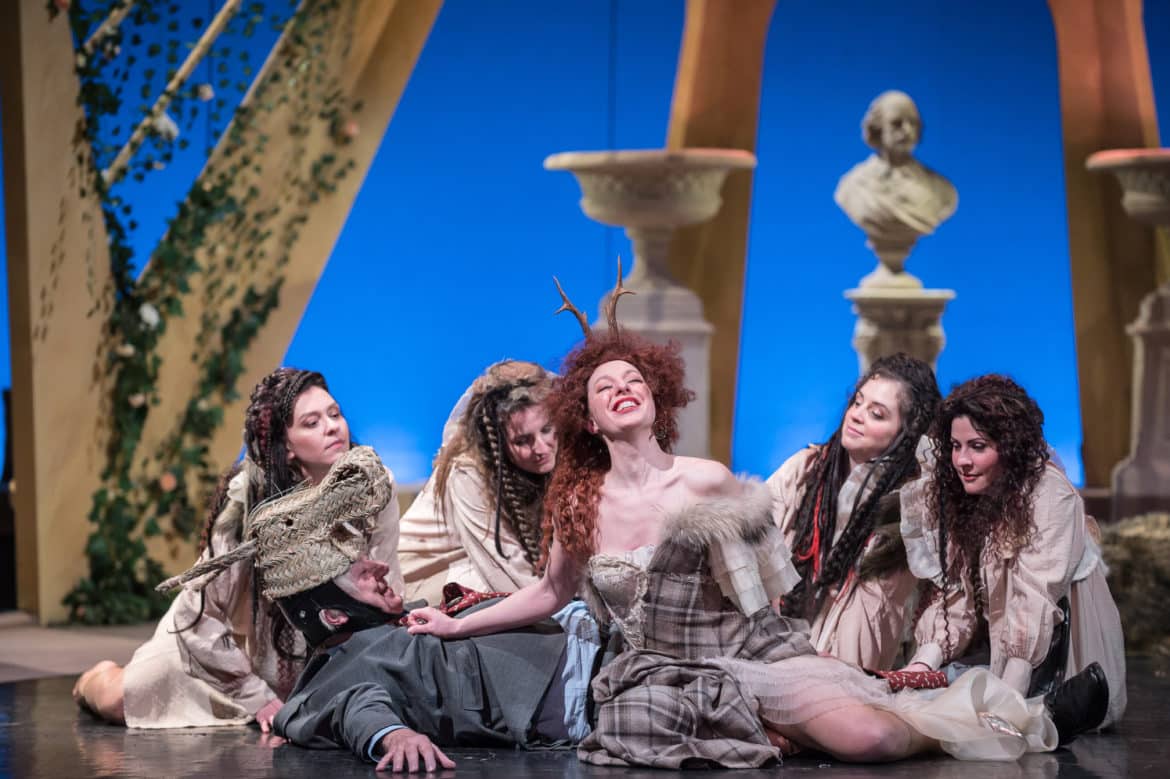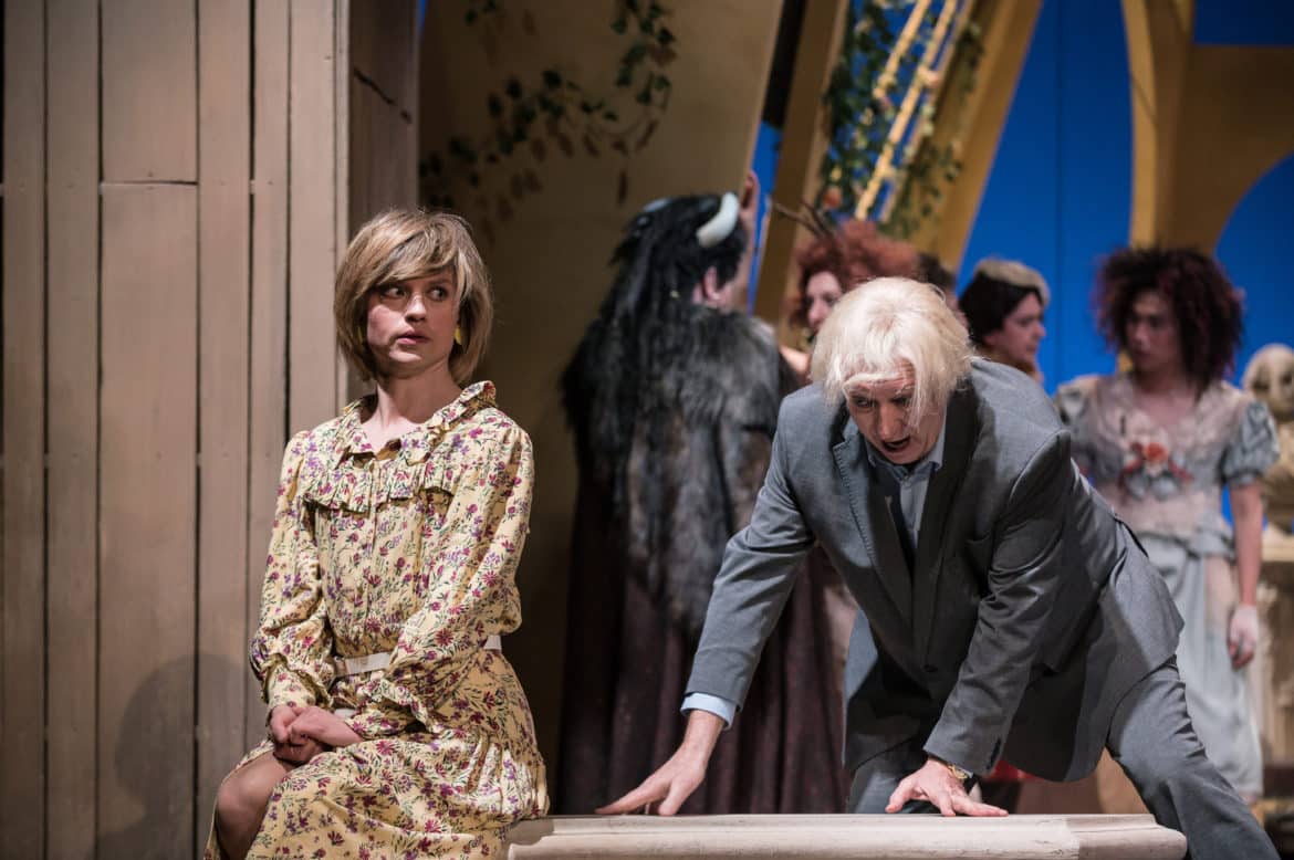 On peut compter, pour cela, sur certaines incarnations impayables. La Queen Elisabeth de Chantal Cousin conserve une certaine sobriété. Benedict Hymas assume les évanescences de Lady Di – et l’enthousiasme étourdi de Puck. Alain Buet se glisse avec gourmandise dans le costume de Boris Johnson et ses foucades, et l’on retrouve également la solidité et l’heureuse surprise de la définition d’une basse désormais émérite dans les interventions d’Egeus. Mais c’est indéniablement, campée par Steven Player, l’extraordinaire Margaret Thatcher – reconnaissable, dans un brushing et un tailleur bleu qui ne la distinguent pas tout à fait absolument, à son sac à main où est glissée une théière  ne contenant sans doute pas qu’un innocent breuvage –, et ses numéros de fausse gaucherie chorégraphique maîtrisée, dans une réinterprétation de la danse baroque, qui marquent les zygomatiques, et pas seulement, de la plus indélébile des manières. Le danseur ajoute par ailleurs quelques accompagnements de guitare à la liste de ses talents.