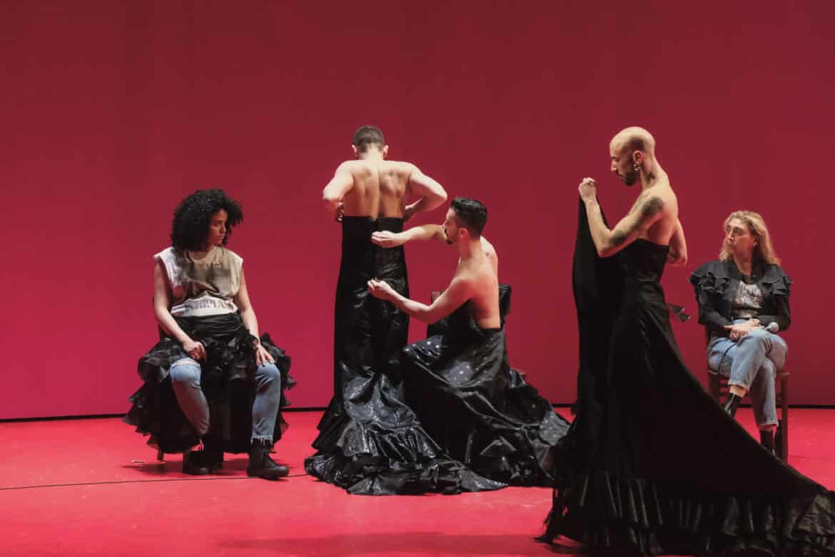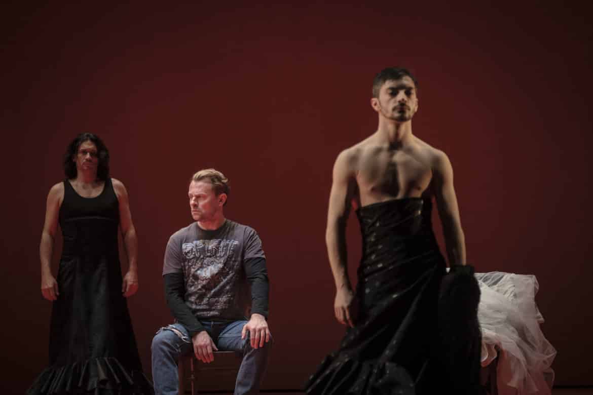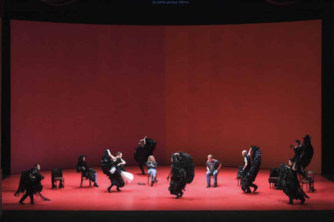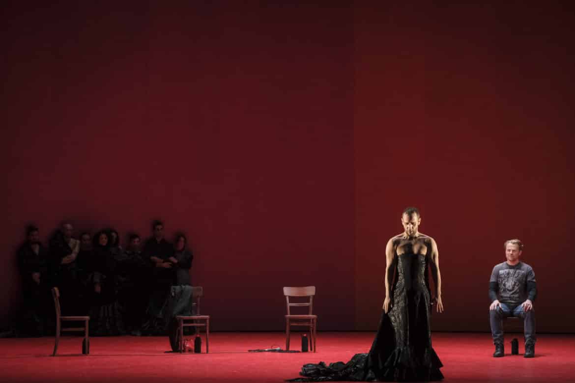 Faire se côtoyer le Journal d’un disparu de Janáček et L’Amour sorcier de de Falla au sein d’un même spectacle, c’était, a priori, choisir comme principe dramaturgique l’effet de contraste : on s’attendait à ce que Daniel Fish souffle le chaud et le froid, en opposant la terre brûlée d’Espagne aux sols gelés des pays slaves, le soleil brûlant d’Andalousie aux froids frimas de la Tchéquie. Il n’en est rien : en permettant aux deux personnages féminins (la tsigane Zefka et la gitane Candelas) de fusionner en une seule et même figure (celle de la femme amoureuse, d’abord courtisée puis délaissée), le metteur en scène met sinon l’Espagne, du moins la culture latine – et les caractéristiques ou clichés qui y sont traditionnellement attachés : amours passionnées, sentiments extrêmes possiblement mortifères, tempéraments sanguins… – au cœur du spectacle, et ce dès le cycle de mélodies de Janáček, où le chant de Janik se déploie devant de grands murs rouges, unique élément de décor avec les chaises sur lesquelles prennent place chanteurs et danseurs. Le chant du personnage est par ailleurs prolongé par la chorégraphie à la fois mystérieuse, poétique et violente conçue par Manuel Liñán, maître ès flamenco (les danseurs, exclusivement des hommes, revêtent parfois le traditionnel traje de flamenco avec traîne, volants, mantille et chaussures à talon, et recourent en grande partie à la grammaire flamenca : respect rigoureux du compás – cette attention au rythme qui lie tous les acteurs du spectacle, qu’ils soient musiciens, danseurs ou chanteurs –, utilisation du corps dans sa dimension gestuelle – mobilisation récurrente des bras, poignets, doigts –, ou percussive – technique de frappe du pied pour accentuer le discours musical). De fait, c’est bien de prolongement qu’il s’agit et non pas d’illustration : les danseurs ne jouent en effet aucun rôle particulier ; ils ne se substituent pas aux personnages du drame, n’incarnent jamais Janik, Zefko, Candilas ou la sorcière. Ni masculines, ni féminines, tantôt êtres humains, tantôt animaux ou monstres indéterminés, les figures qu’ils donnent à voir rendent visibles, allégorisent en quelque sorte les sentiments ou la violence des passions qui agitent les personnages mis en scène dans les deux ouvrages.