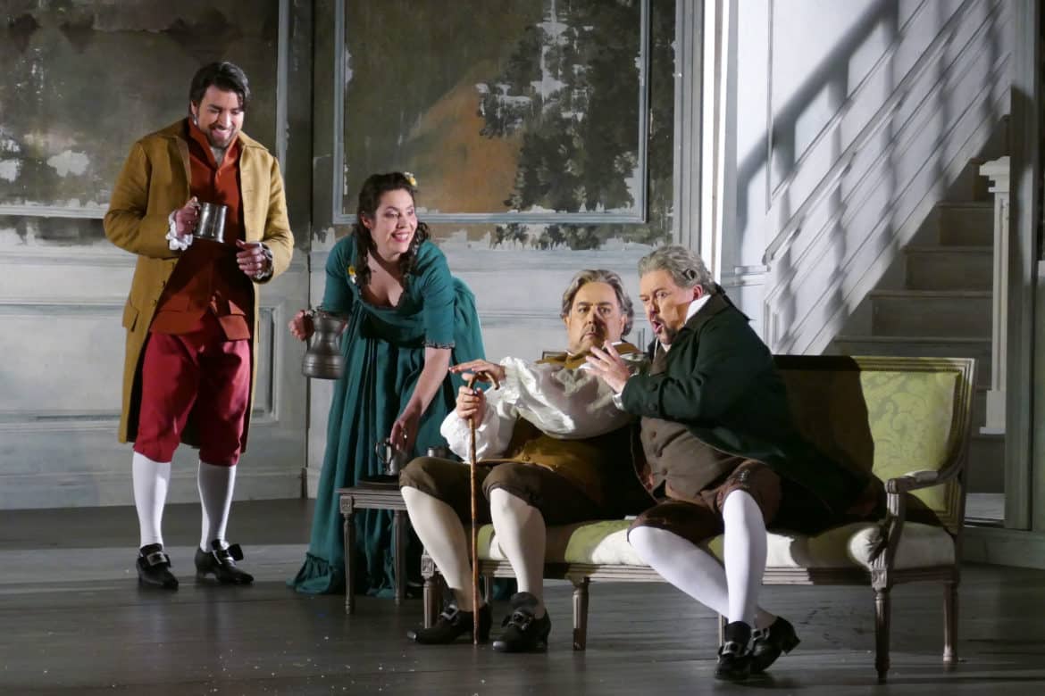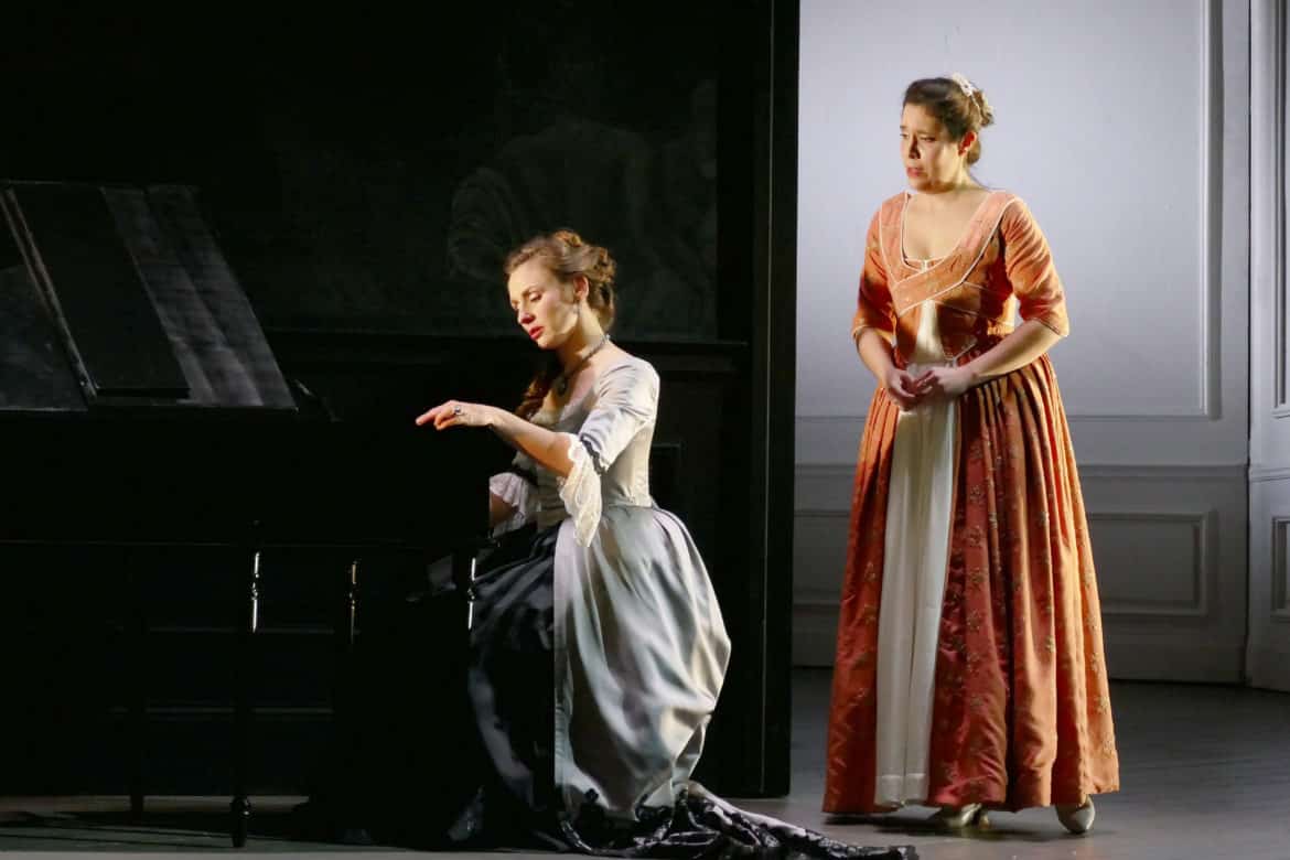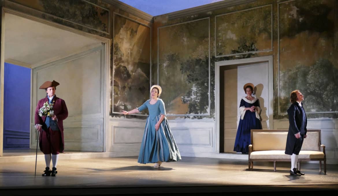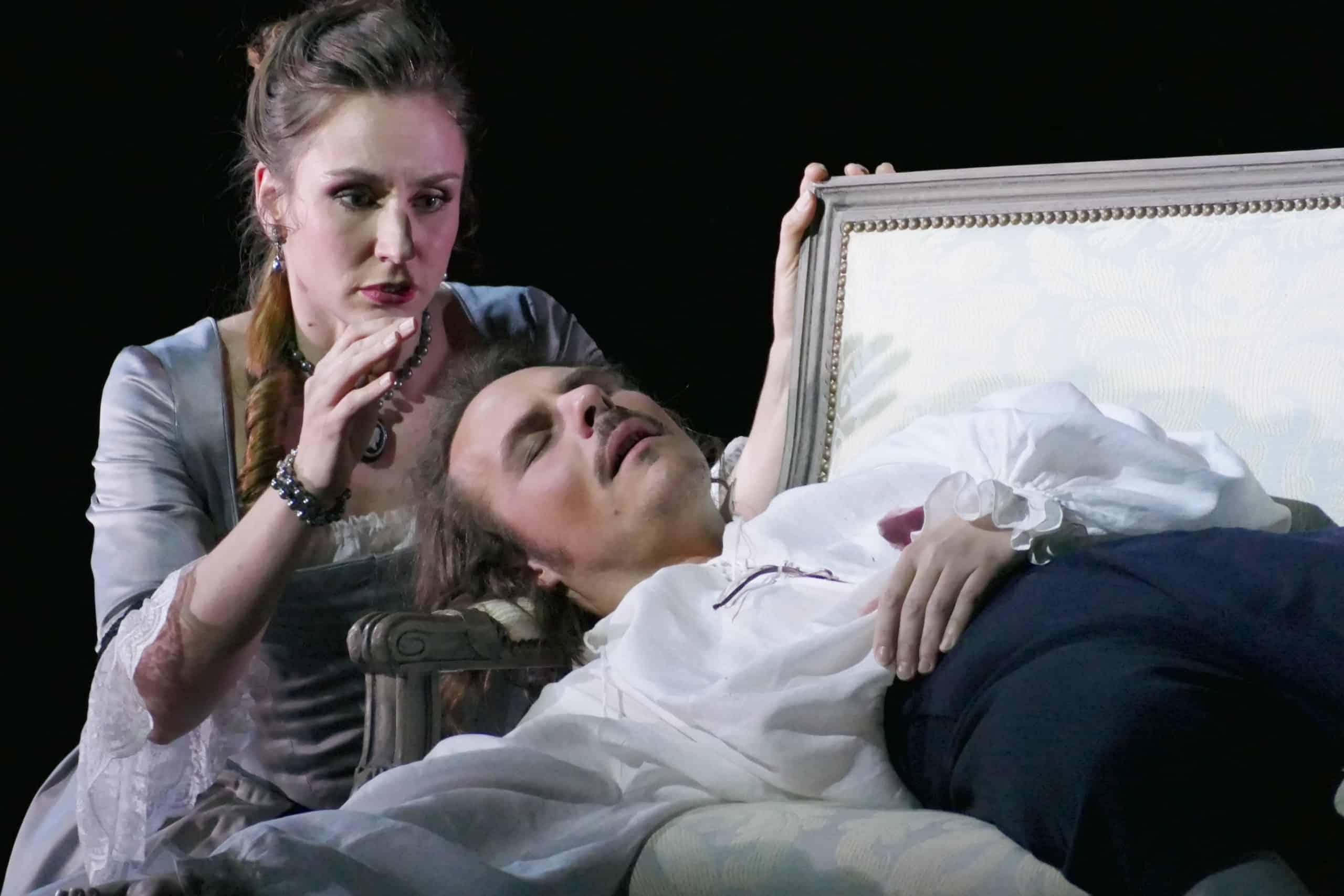 Créée en 2018 à l’Opéra national de Lorraine, à Nancy, et couronnée alors par le Prix Claude Rostand du meilleur spectacle lyrique en régions du Syndicat de de la Critique, reprise au printemps 2021 à Montpellier, la production de Werther réglée par Bruno Ravella affirme une épure d’une évocation historique. Dessinée par Leslie Travers, la scénographie d’antichambre tapissée de décors pastoraux aux teintes de gravures ou d’eaux-fortes délavées par le temps résume, comme les costumes, avec une certaine fidélité poétique sans trop s’appesantir sur les détails, l’époque du Sturm und Drang du roman de Goethe, tout en suggérant efficacement la constante tension sous-jacente du drame, jusqu’au dénuement onirique du dernier acte, sous les flocons, le tout sous les lumières évocatrices de Malcolm Rippeth. Répondant le plus souvent aux contraintes sanitaires, la direction d’acteurs participe de cette représentation d’un amour impossible.
