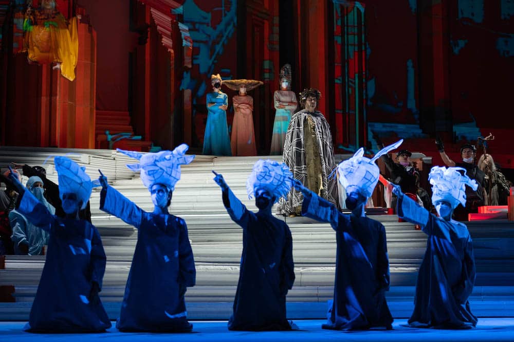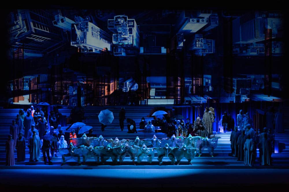 L’idée de confier à un artiste chinois la mise en scène d’un opéra se déroulant en Chine n’est pas si étrange : on se souvient que la Turandot de Zhang Ymou se déroulait dans la Cité interdite de Pékin. Mais cette fois, il ne s’agit pas d’un réalisateur (bien qu’il soit également cinéaste), mais d’un artiste aux multiples facettes : Ai Weiwei, performeur, documentariste, sculpteur, architecte (il a conçu le stade national de Pékin), poète et activiste politique qui a payé sa dissidence et sa rébellion contre le régime par la prison. Ce n’est pas la première fois qu’il se mesure à Turandot : il y a 35 ans, il était figurant (l’assistant du bourreau…) dans quelques-unes des 202 représentations du spectacle de Zeffirelli à New York, mais c’est la première, « et la dernière fois », tient-il à préciser, qu’il participe à la mise en scène d’un opéra. Cette production était prévue il y a deux ans, mais la pandémie a retardé sa mise en place jusqu’à aujourd’hui. Après la Covid et la guerre en Ukraine, cependant, le spectacle ne pouvait plus rester le même, déclare le metteur en scène, qui concentre sa lecture sur la scénographie et les interventions vidéo en négligeant la mise en scène – les personnages principaux n’ont pas de rôle d’acteur défini, le chœur est immobile, les seules interventions originales sont celles des mouvements d’un mime de l’artiste chinois Chiang Ching et les mouvements rythmiques d’un groupe de jeunes. « Il s’agit d’un opéra plongé dans le monde contemporain, au sein des luttes culturelles et politiques actuelles », explique l’artiste, « Turandot est la force et le pouvoir, Calaf un réfugié politique ». La scène est transformée en planisphère – ce qui n’est pas du tout évident pour les spectateurs dans les gradins – les contours des continents étant sculptés dans un grand escalier. Le chœur, presque omniprésent, prend place dans ces trous, pour moitié dans des costumes « traditionnels » (conçus par Ai Weiwei lui-même), ou dans des uniformes militaires modernes. Sous l’éclairage de Peter van Praet, des ruines stylisées s’élèvent, rappelant celles de la ville qui accueille la représentation, tandis que des images de la Chine d’aujourd’hui, avec ses gratte-ciel et ses autoroutes, sont projetées en toile de fond, ainsi que des charges de police harcelant des jeunes réclamant la liberté à Hong Kong, des réfugiés pataugeant dans des rivières pour fuir leur pays déchiré par la guerre, et des migrants dans des clôtures de barbelés. Et puis, il y a les combinaisons anti-contamination portées par les médecins de Wuhan, la ville d’où est originaire le virus Corona…