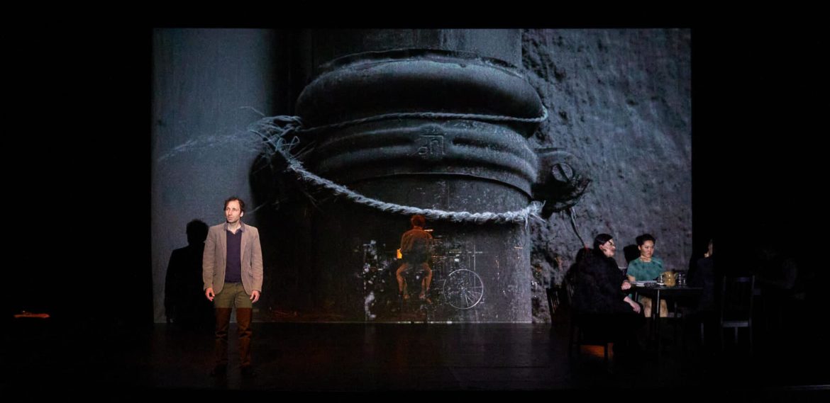 La catégorie même d’opéra, apposée à la troisième entreprise lyrique du compositeur argentin, après Avenida de los Incas, créée en 2015, et cette année, L’homme qui aimait les chiens, pose question. Si le livret adaptant l’œuvre littéraire, écrit avec le concours de Marie Potonet, restitue la singularité narrative de ce labyrinthe délirant dans lequel de jeunes garçons, Witold et Fuks, réécrivent constamment l’expérience vécue à partir de détails et de coïncidences, la traduction musicale et scénographique n’établit pas avec le rapport habituel que le genre opératique entretient entre texte, son et visuel. La partition, fondée sur des boucles et des ostinati, affirme sa propre logique, et les interactions avec les autres paramètres du spectacle apparaissent plus accidentels que formellement prémédités, effet sans doute accentué par le placement des pupitres de 2e2m au fond du plateau – dirigés avec précision par Alphonse Cemin. À rebours des usages, les éléments électroacoustiques, réalisés par Max Bruckert et l’informatique du GRAME, ne viennent pas fracturer, ou contraster avec, le matériau instrumental, mais s’y intègrent sans en perturber apparemment l’entropie.