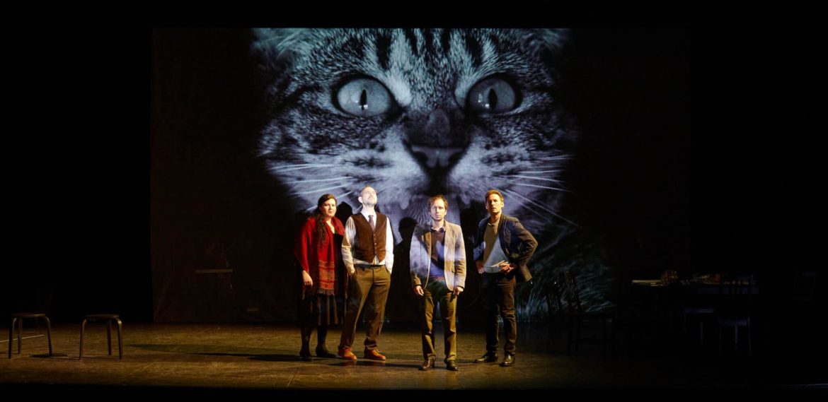 La scénographie et les vidéos de Yann Chapotel, composées d’abord d’images en noir et blanc d’objets de la vie courante, au parfum parfois désuet du milieu du vingtième siècle, superpose sa propre dramaturgie. Plus qu’une valeur sémiologique, les illustrations assument une fonction rythmique et pulsative : on retiendra en particulier la lente pluie cinématographique d’accessoires les plus divers. C’est sans doute dans cette sorte d’abstraction du processus que s’inscrit l’essence de la pièce – comme celle du roman, en un sens, où ce n’est pas la linéarité des intrigues qui compte, mais leur perpétuelle métamorphose. La mise en scène de Jacques Osinski accompagne ce voyage dans la fantasmagorie des hypothèses en le délimitant, en ces termes, par le point de départ du réel.