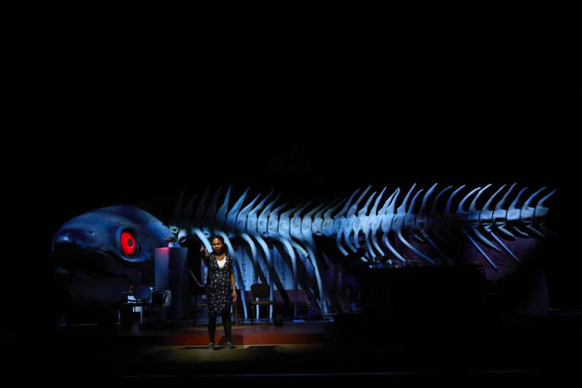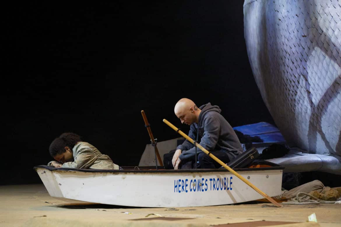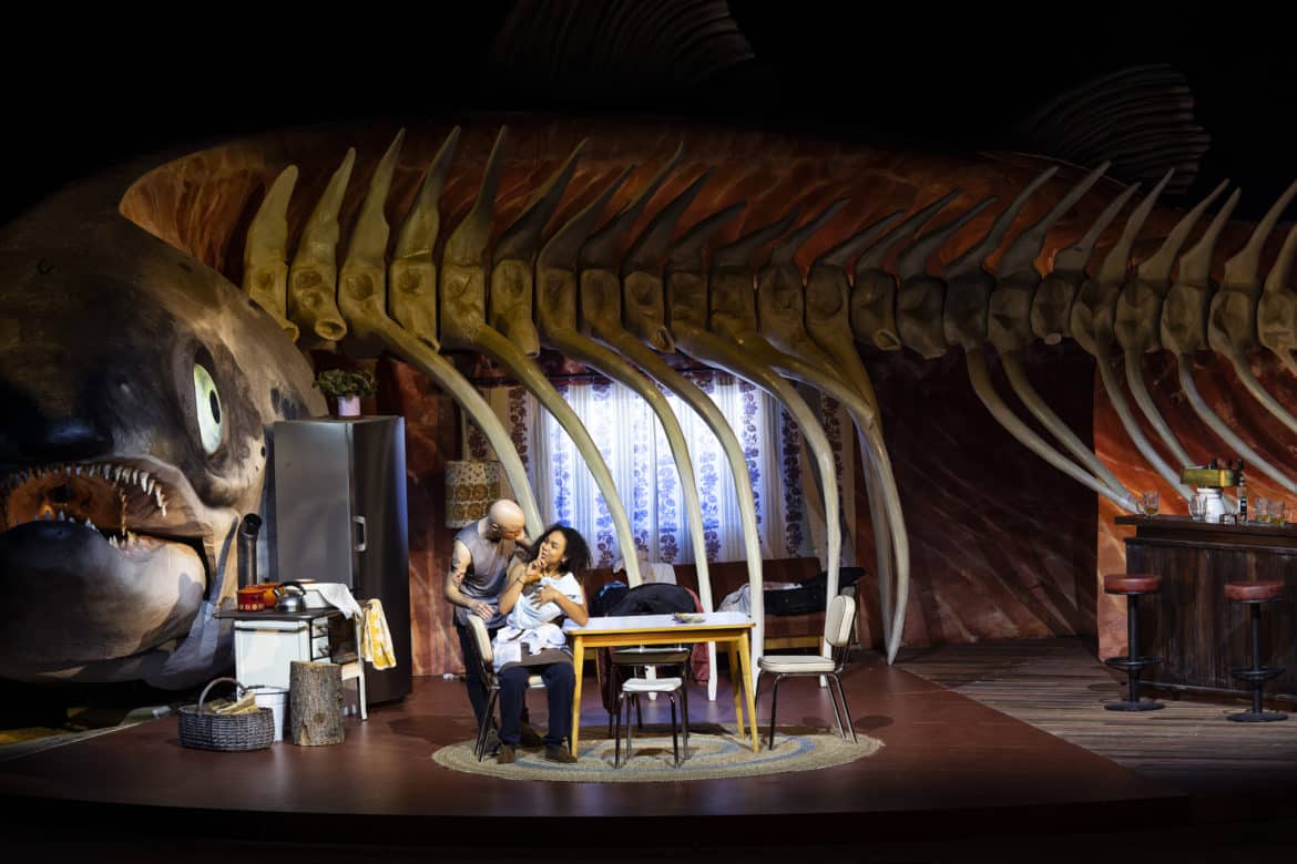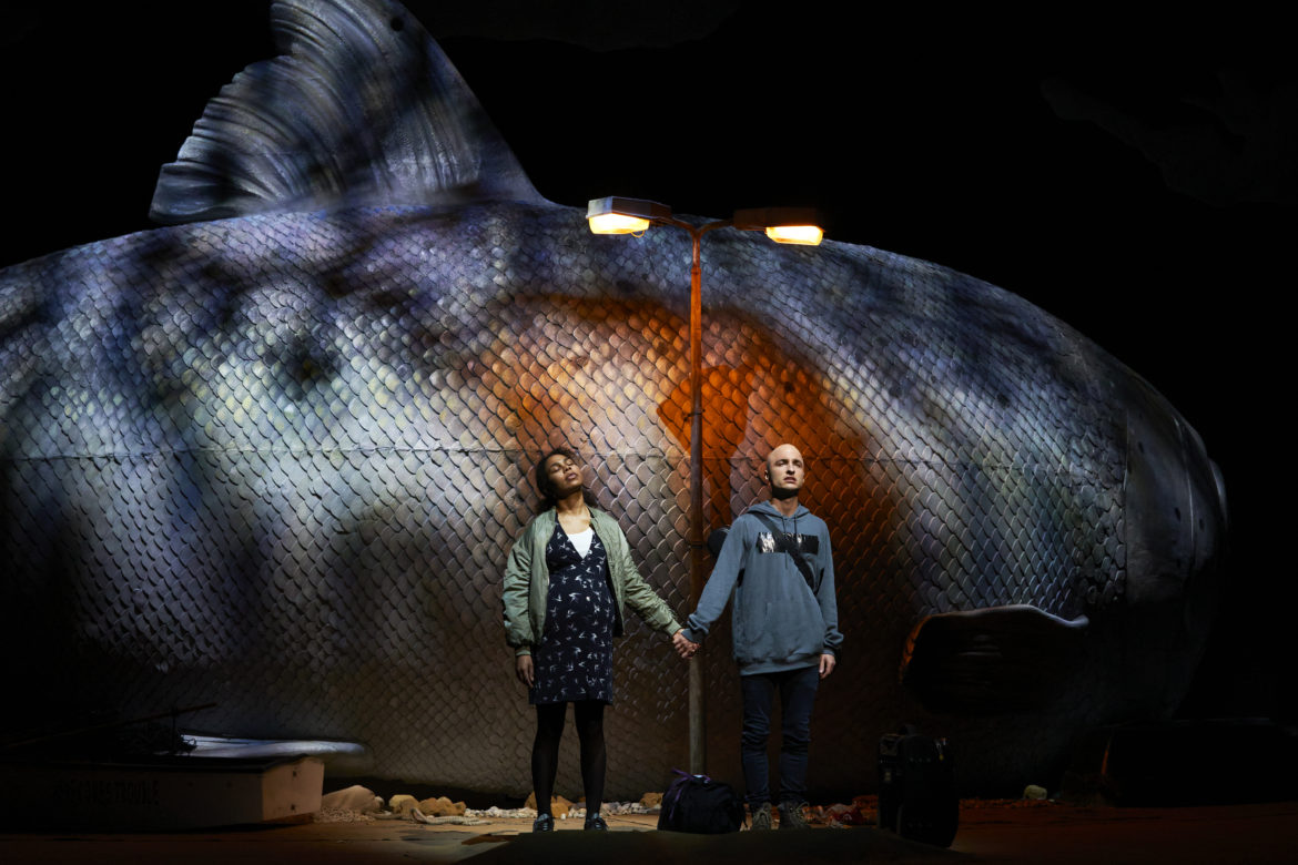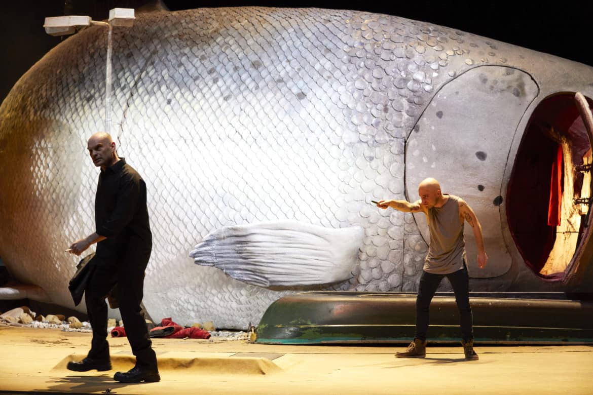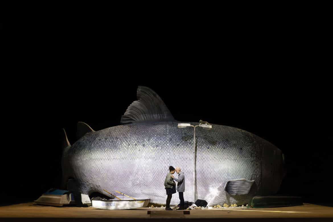 Le Hongrois Kornél Mundruczó, acteur, metteur en scène de théâtre et de cinéma, est chargé de la mise en scène du spectacle. Avec la scénographe Monika Pormale, qui conçoit également les costumes, il crée un espace à mi-chemin entre hyperréalisme et surréalisme, où un énorme saumon sert de décor : la partie convexe, avec les écailles, constitue les extérieurs ; la partie concave, avec les entrailles et l’arête de poisson, les intérieurs. Son grand œil vitreux reste toujours menaçant. Sans se réfugier dans un abstractionnisme incongru, le choix de Mundruczó semble très cohérent avec l’univers narratif de Fosse, équilibré entre récit concret et fable. Le réalisateur a souvent traité, dans ses films, d’individus qui se situent en marge de la société, comme le personnage d’Asle, fils d’une famille dysfonctionnelle et d’une société qui l’a rejeté. Il en va de même pour Alida et le réalisateur le montre très clairement avec la figure de sa mère, elle aussi rejetée par la société. Néanmoins, on ne ressent guère beaucoup d’empathie pour ces personnages, surtout pour Asle, qui est de toute façon un meurtrier multiple. Si la parabole d’Asle et Alida présente des réminiscences religieuses des figures de Marie et Joseph, c’est plutôt l’histoire du couple meurtrier Bonnie et Clyde qui vient à l’esprit.