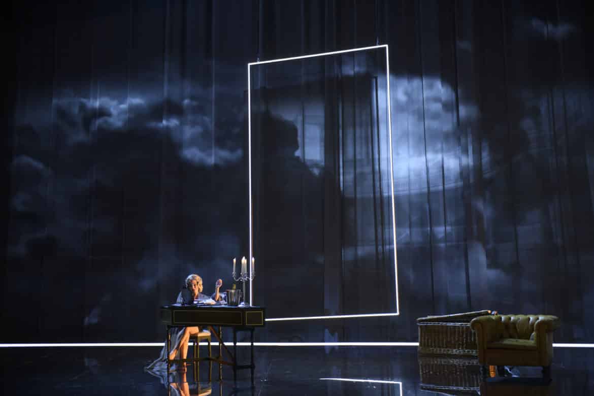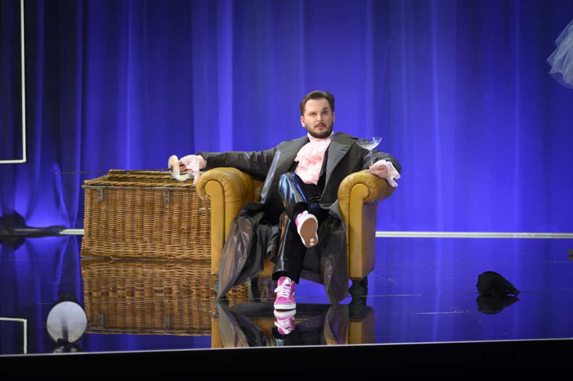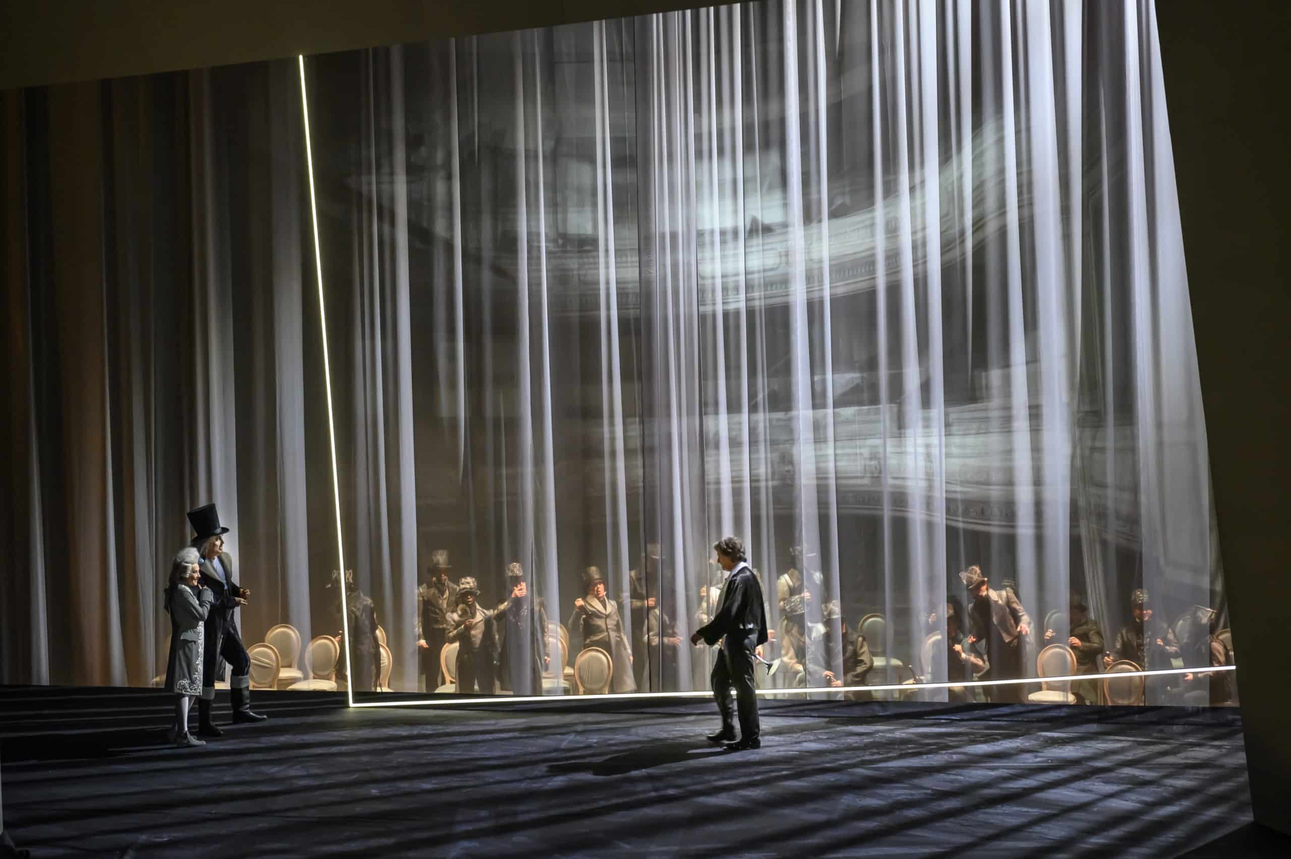 Vincent Boussard replace le théâtre au centre de cette production. L’intrigue l’y aide aisément, la scénographie nous y plonge. Les décors de Vincent Lemaire participent de cette habile mise en abyme avec cet imposant cadre de scène inversé et, en toile de fond, la représentation obscurément stylisée d’une salle de spectacle à l’italienne. Le chœur en fond de scène, comme en miroir,  prend la place du public et c’est un théâtre qui apparaît. De la salle, la vraie, la nôtre, nous assistons au spectacle du spectacle, en découvrons les coulisses mais les quittons souvent pour revenir à la vraie comédie humaine. Les rencontres entre les êtres, tout comédiens qu’ils soient, ne se départissent jamais d’une émotion réelle où les passions échappent à la maîtrise.  Ce jeu subtil entre le personnage et son interprète d’un théâtre dans le théâtre où la réalité défie la fiction pourrait perdre le spectateur. Cela arrive parfois mais quel plaisir d’être emporté avec tant de fantaisie dans cet univers fictionnel entre deux mondes. Les vidéos et les lumières poétiques et chimériques de Nicolas Hurtevent et  Nicolas Gilli  participent de ce voyage initiatique spatial mais également temporel grâce aux étonnants costumes de Clara Peluffo Valentini. Perruques mozartiennes, costumes 19e, jeans et T-shirt de nos jours. Au jeu des illusions, l’équipe réunie autour de Vincent Boussard est assurément vainqueur.