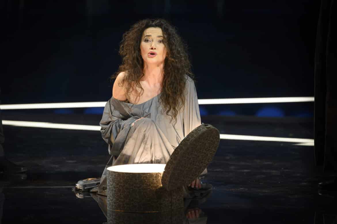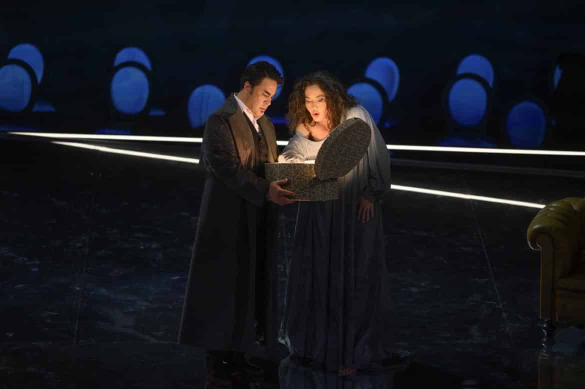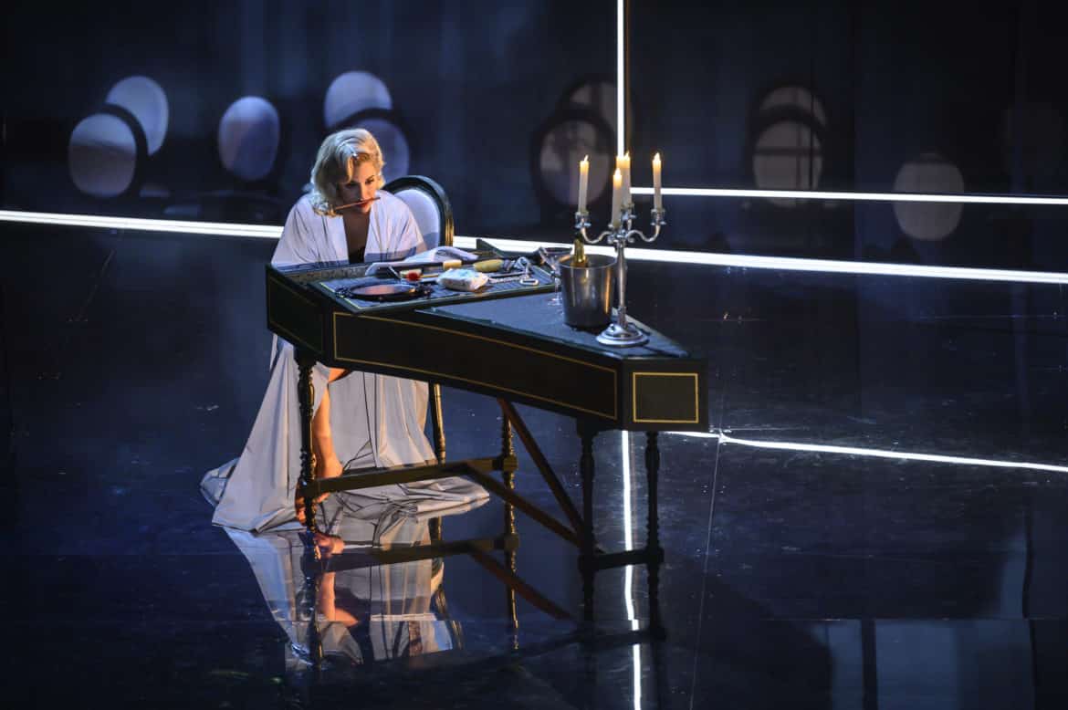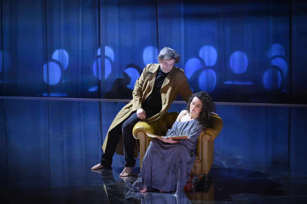 Vincent Boussard replace le théâtre au centre de cette production. L’intrigue l’y aide aisément, la scénographie nous y plonge. Les décors de Vincent Lemaire participent de cette habile mise en abyme avec cet imposant cadre de scène inversé et, en toile de fond, la représentation obscurément stylisée d’une salle de spectacle à l’italienne. Le chœur en fond de scène, comme en miroir,  prend la place du public et c’est un théâtre qui apparaît. De la salle, la vraie, la nôtre, nous assistons au spectacle du spectacle, en découvrons les coulisses mais les quittons souvent pour revenir à la vraie comédie humaine. Les rencontres entre les êtres, tout comédiens qu’ils soient, ne se départissent jamais d’une émotion réelle où les passions échappent à la maîtrise.  Ce jeu subtil entre le personnage et son interprète d’un théâtre dans le théâtre où la réalité défie la fiction pourrait perdre le spectateur. Cela arrive parfois mais quel plaisir d’être emporté avec tant de fantaisie dans cet univers fictionnel entre deux mondes. Les vidéos et les lumières poétiques et chimériques de Nicolas Hurtevent et  Nicolas Gilli  participent de ce voyage initiatique spatial mais également temporel grâce aux étonnants costumes de Clara Peluffo Valentini. Perruques mozartiennes, costumes 19e, jeans et T-shirt de nos jours. Au jeu des illusions, l’équipe réunie autour de Vincent Boussard est assurément vainqueur.
